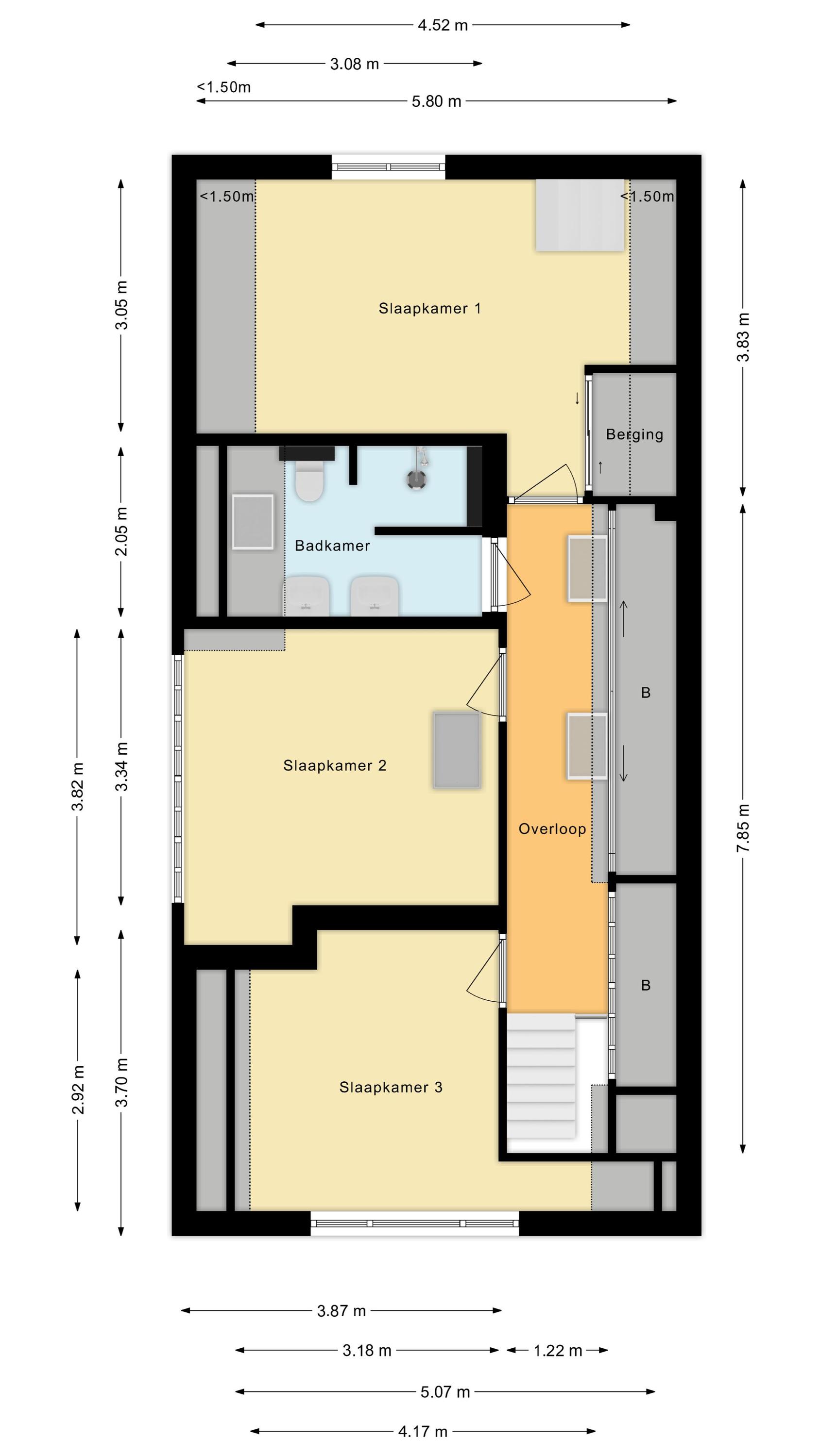 Alle slaapkamers zijn ruim opgezet en beschikken over een nette vloer en strakke wanden. Ook de lichtinval is overal uitstekend. De middelste slaapkamer heeft een vlizotrap naar een bergvliering. In de slaapkamer aan de achterzijde is een trap naar de vide, waar een loungeplek gerealiseerd kan worden.