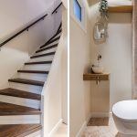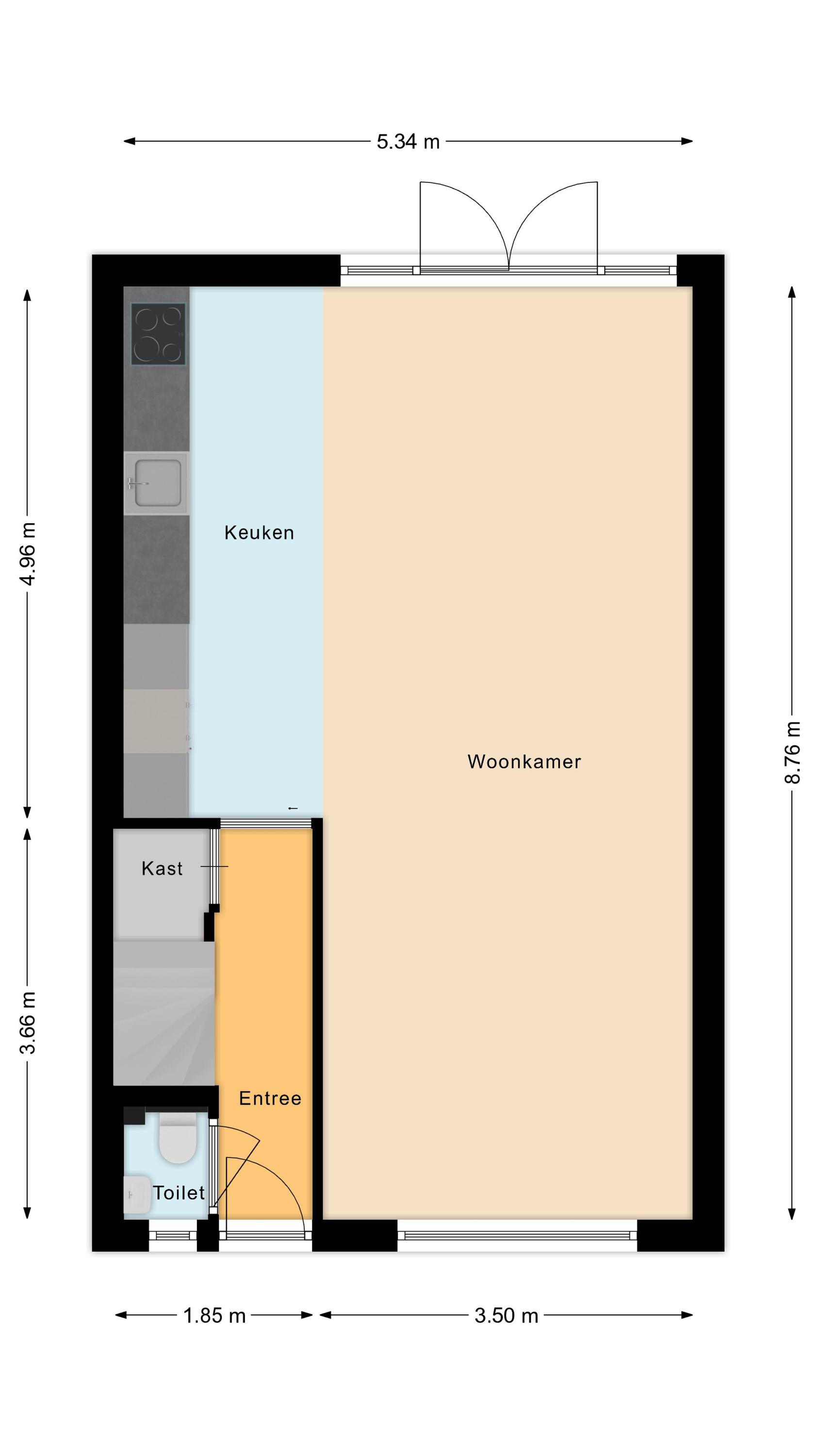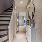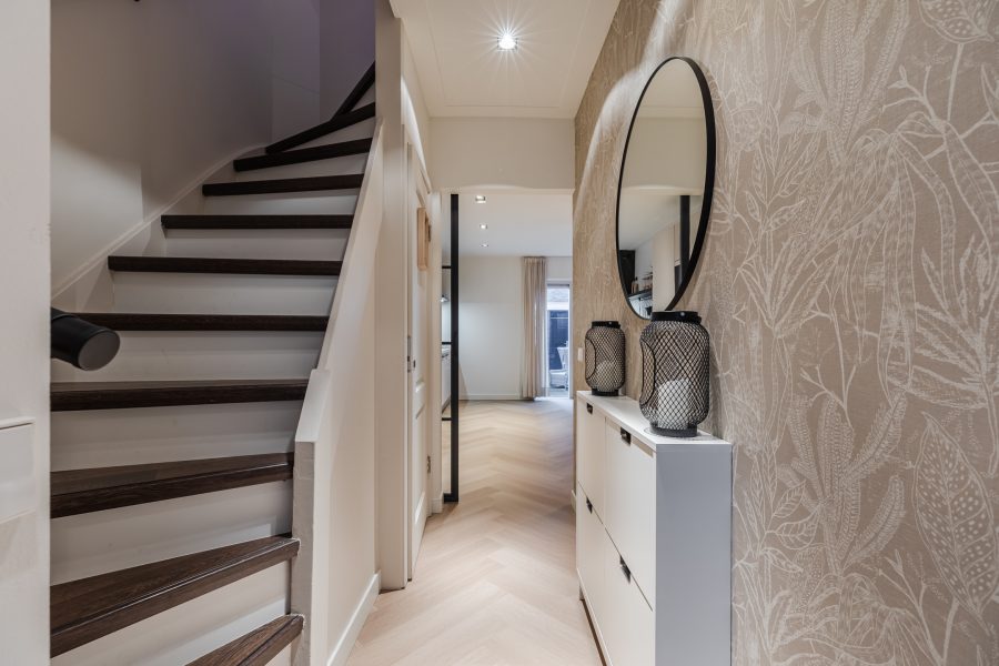 Via de netjes verzorgde voortuin bereik je de voordeur van deze woning. Achter de voordeur bevindt zich een fraai afgewerkte entreehal. Vanuit hier heb je toegang tot een toiletruimte met zwevend toilet en fonteintje, de trap naar boven, een bergkast en de woonkamer.