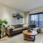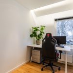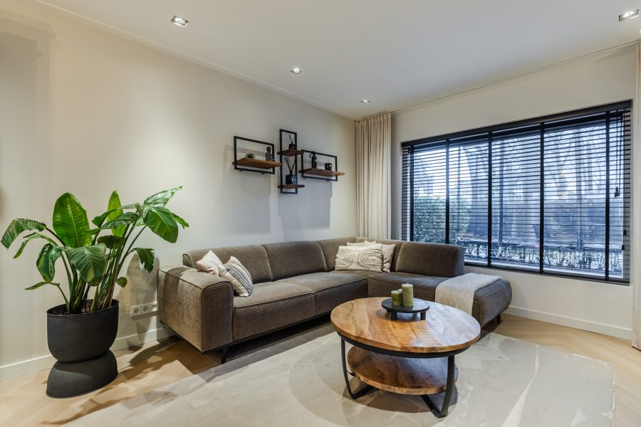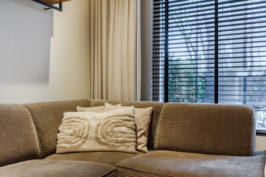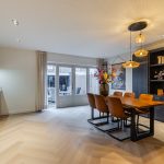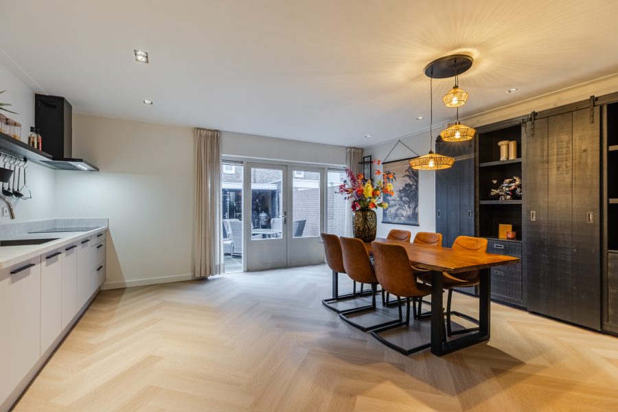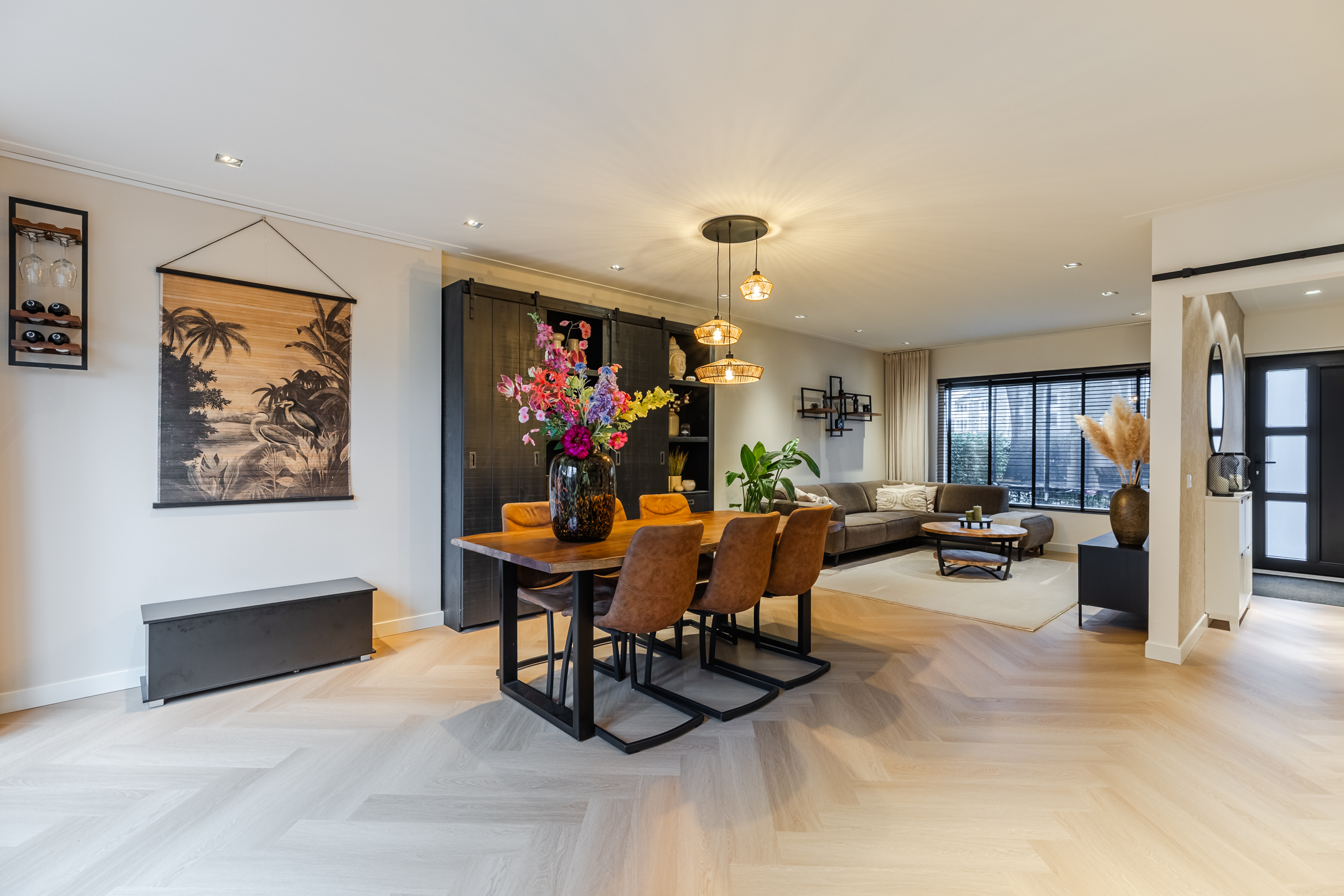 De ruime doorzonwoonkamer is voorzien van een moderne visgraatvloer met vloerverwarming. De wanden zijn hier strak afgewerkt. Het grote raam aan de voorzijde en de openslaande tuindeuren aan de achterzijde zorgen samen voor een geweldige lichtinval. Verder wordt de woonkamer grotendeels verlicht met inbouwspots.