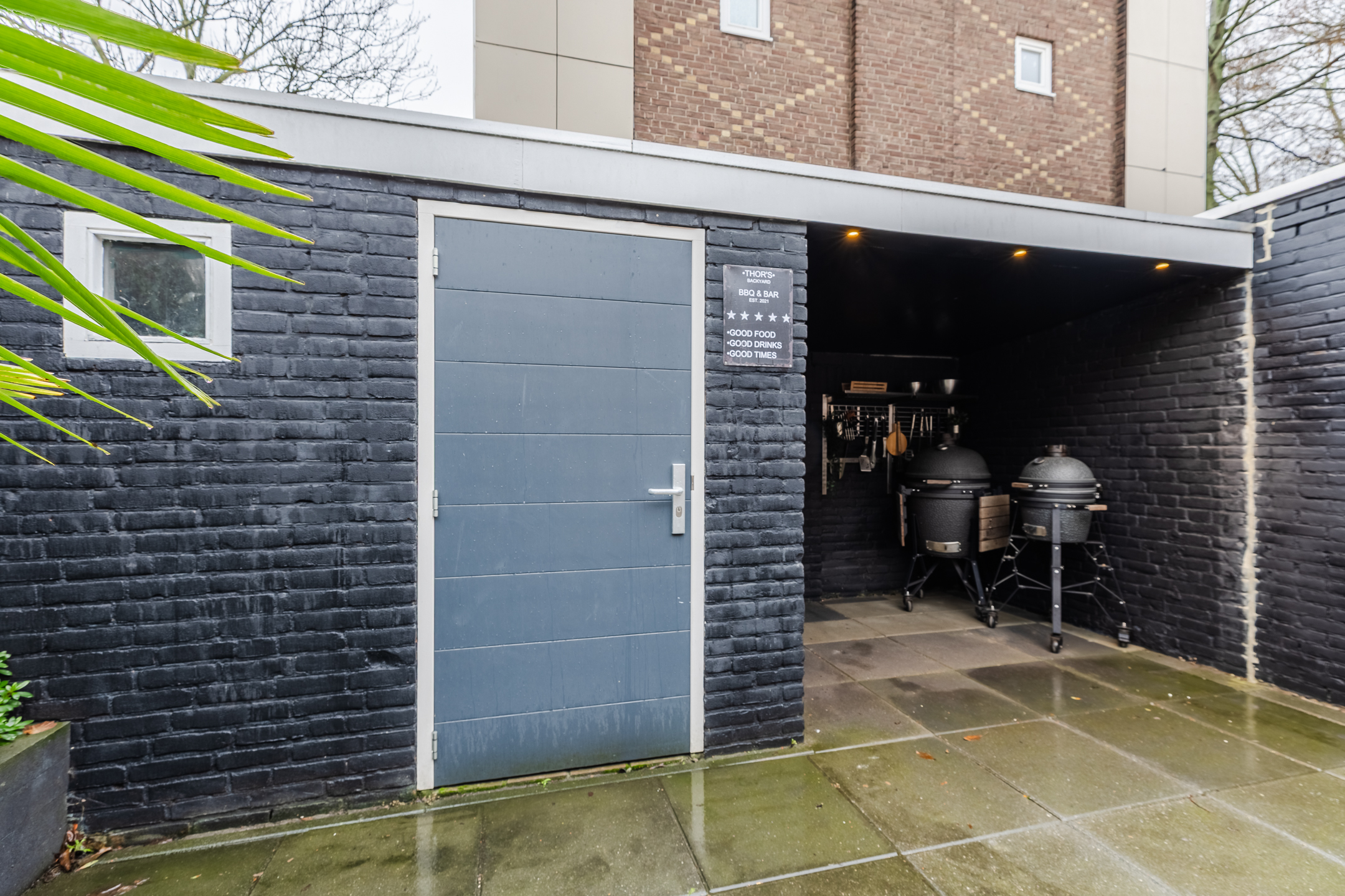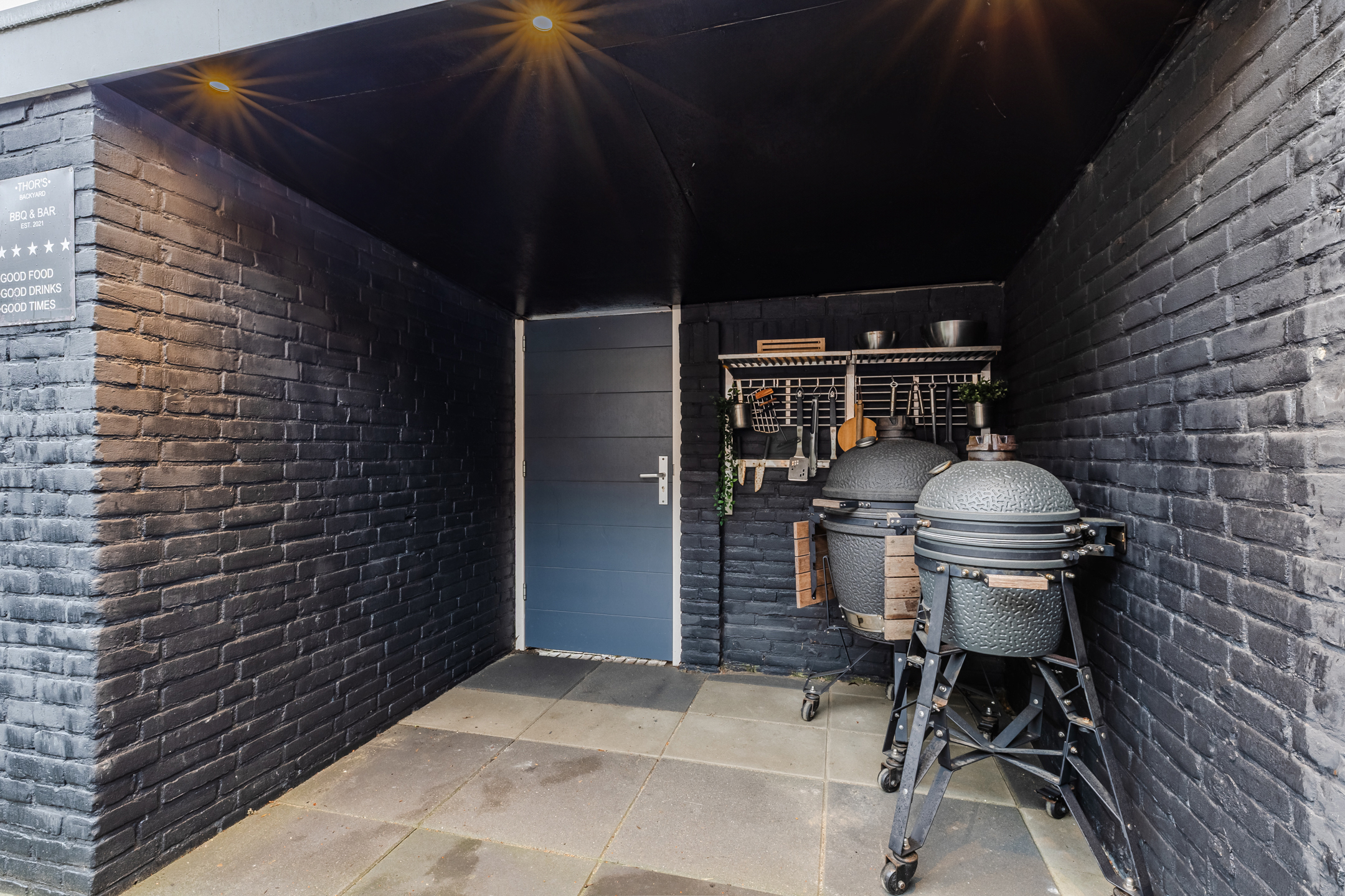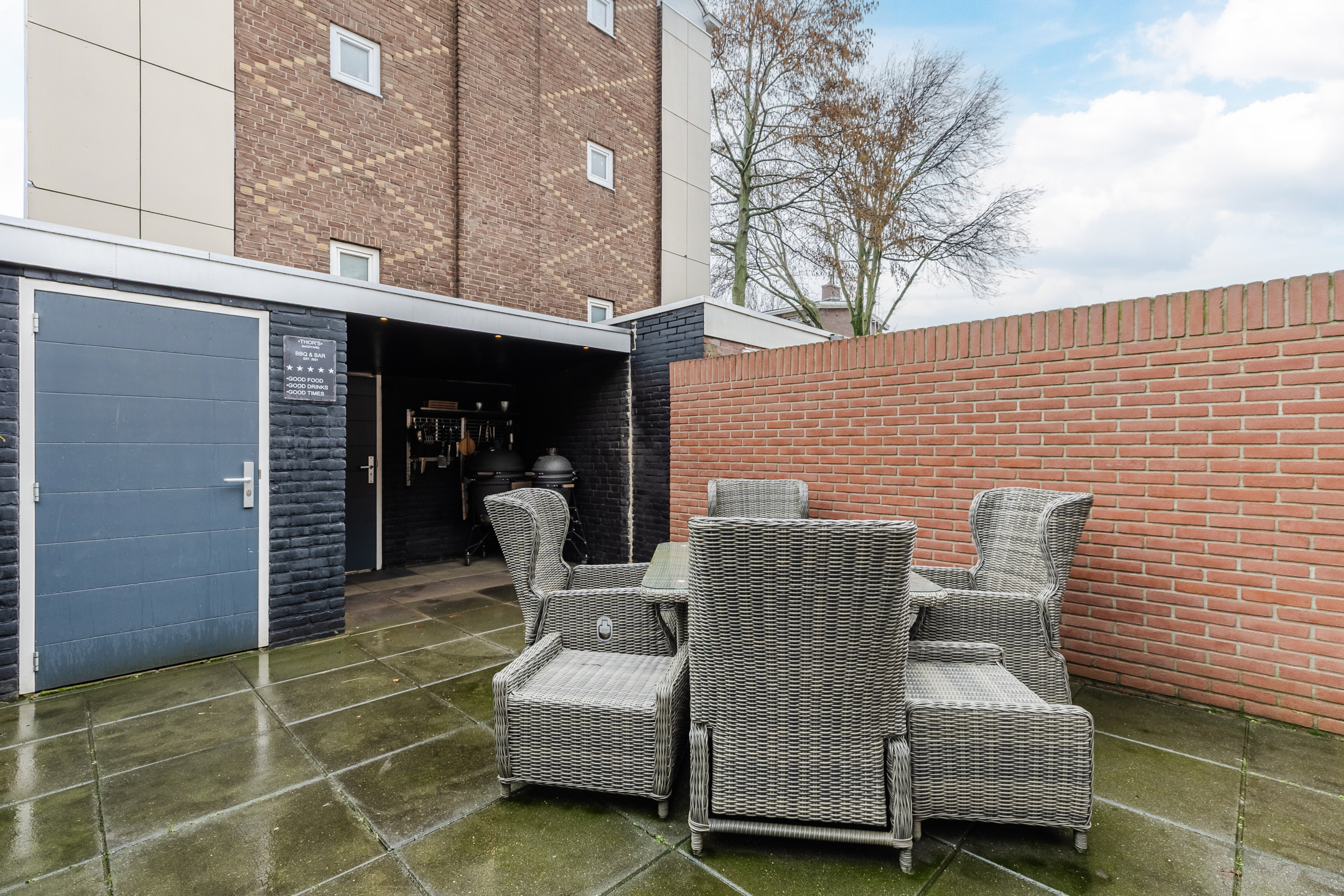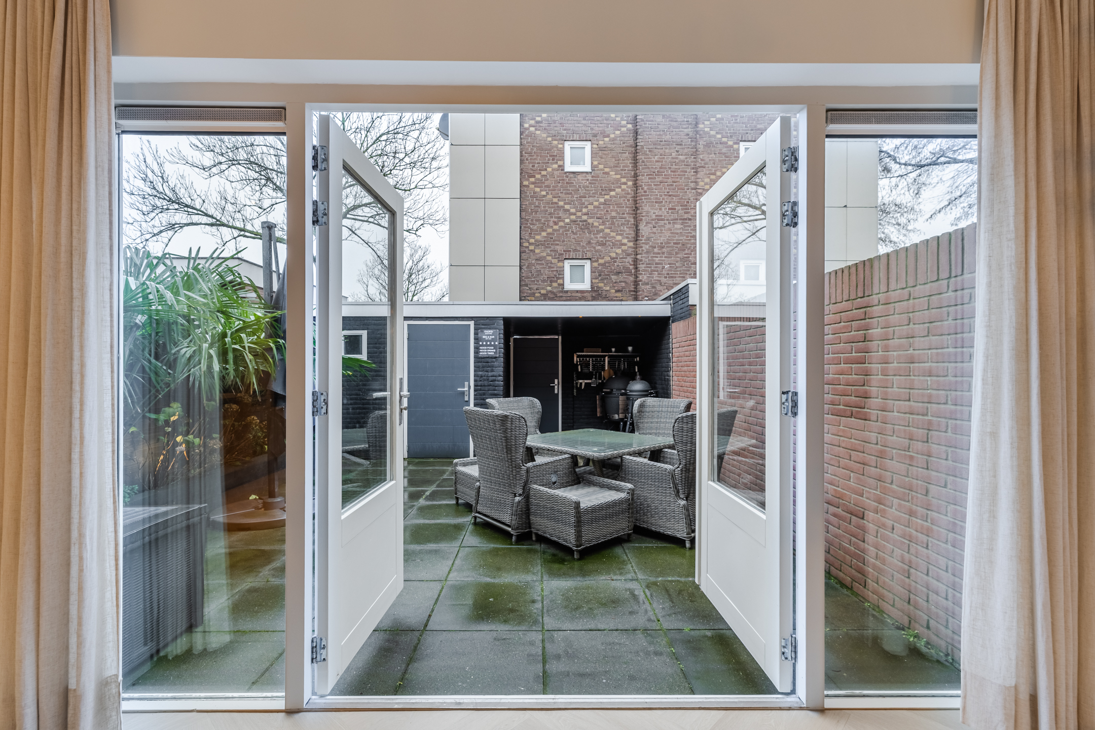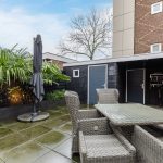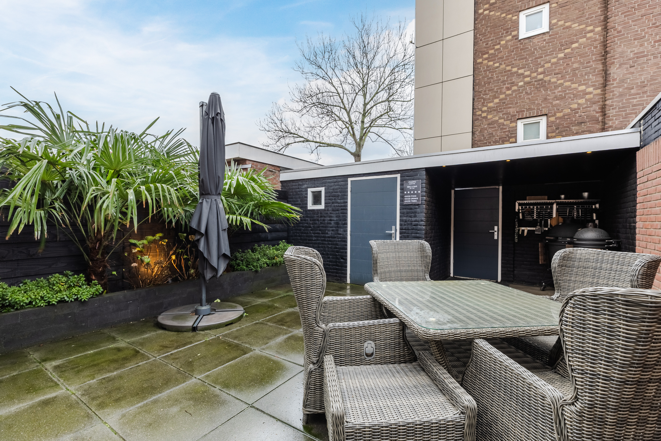 Het huis beschikt over een ruime, onderhoudsvriendelijke achtertuin. De tuin is ingericht met grote terrastegels en een border met beplanting. Er is genoeg ruimte om meubilair te plaatsen, zodat je hier optimaal van het zonnetje kunt genieten. De tuin is rondom uitstekend beschut en biedt daardoor volop privacy. Achterin bevindt zich een overkapping met aangrenzend een berging.