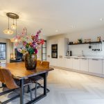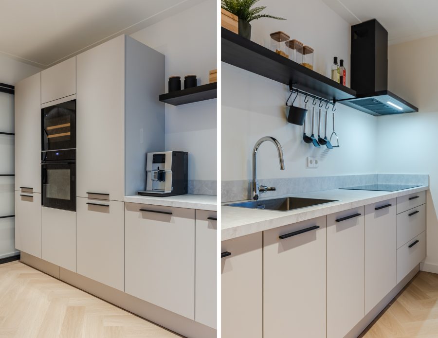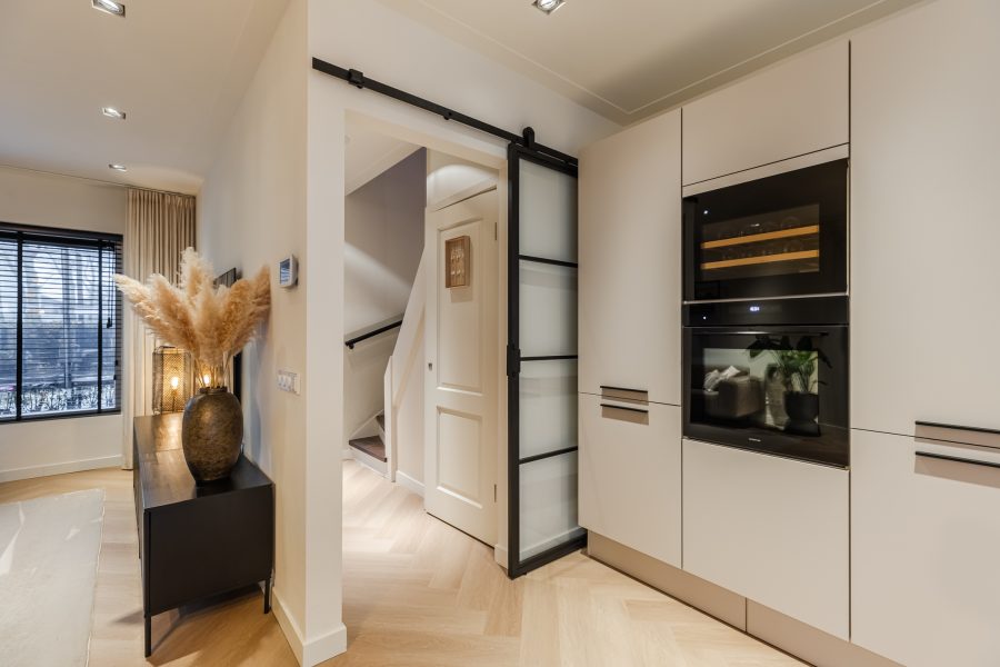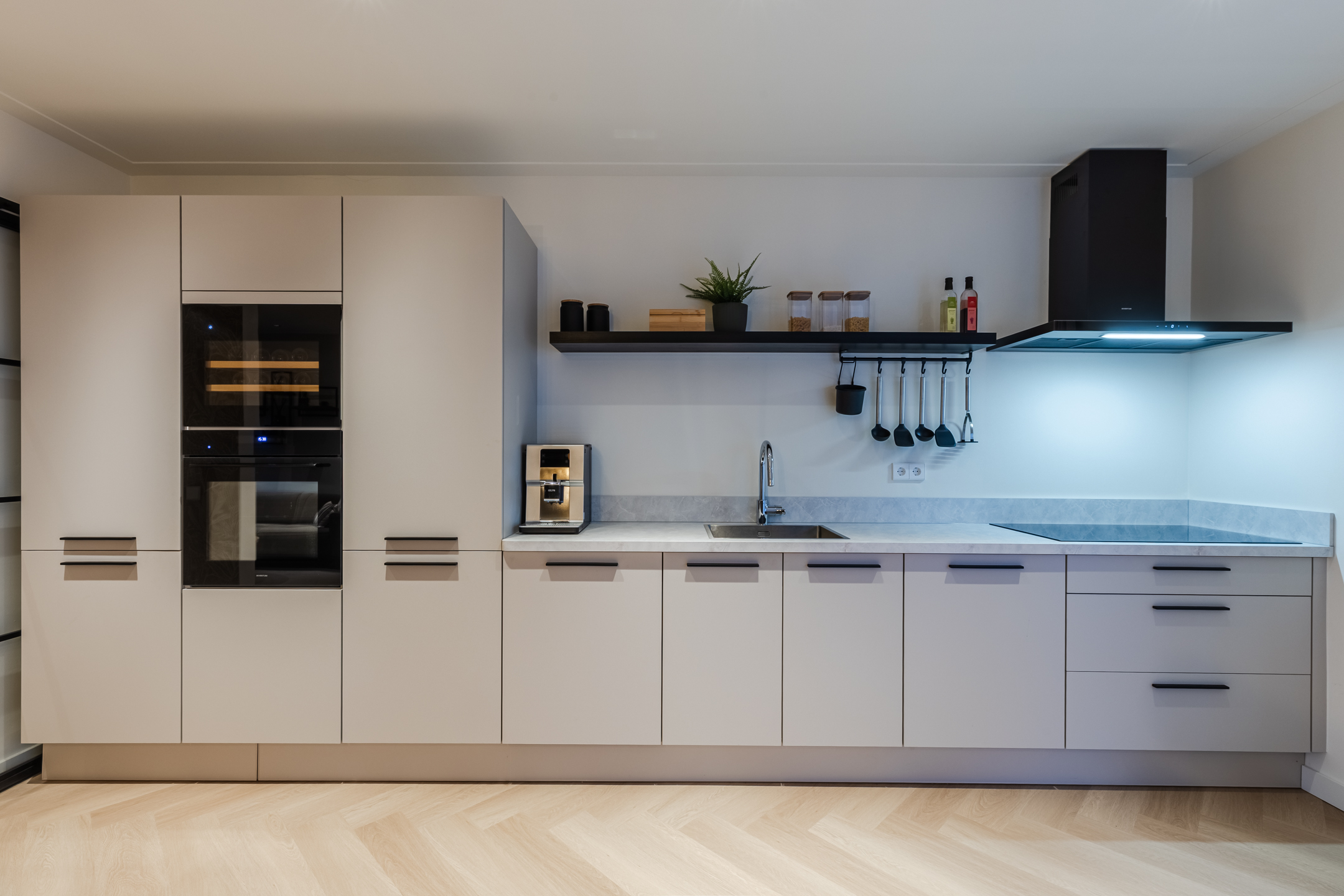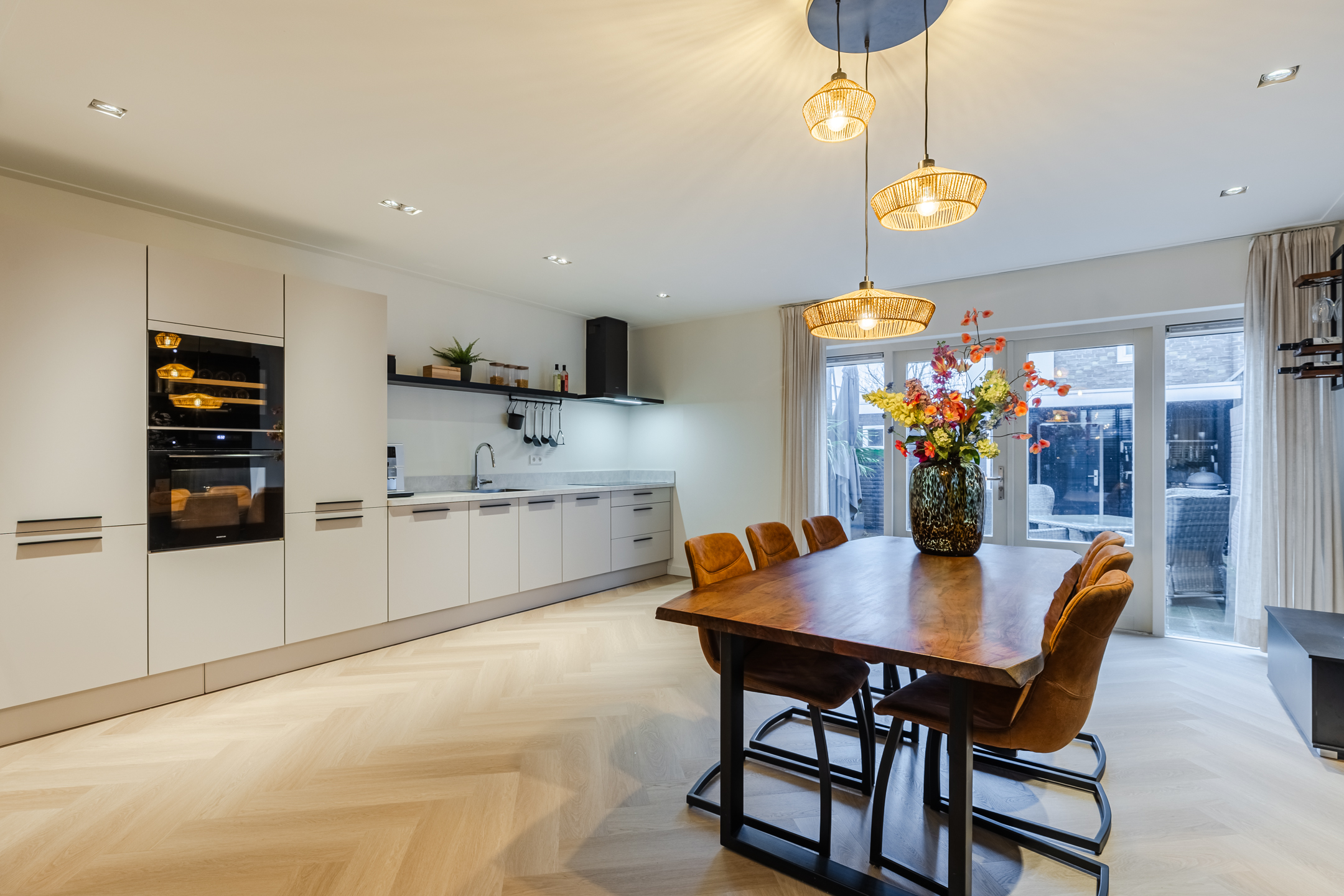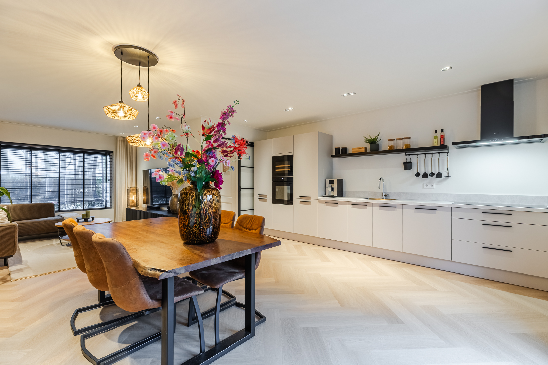 De open keuken (2025) is zeer ruim opgezet en heeft een fraai design met lichte kasten en een wit werkblad. De keuken is uitgerust met moderne apparatuur, waaronder een vaatwasser, inductie fornuis, afzuigkap, ovens, wijnklimaatkast, koelkast en vriezer. Daarnaast biedt de keuken volop bergruimte. De keuken is reeds voorbereid op een kookeiland door middel van een aangelegde loze leiding voor elektra.