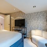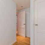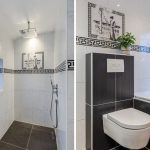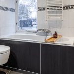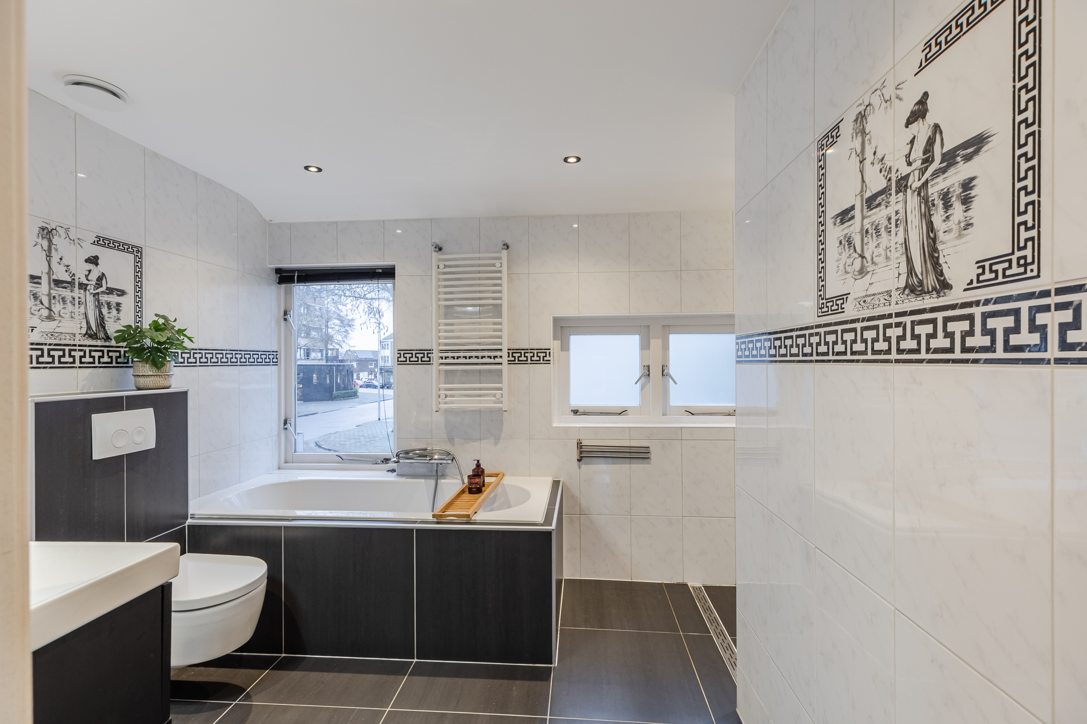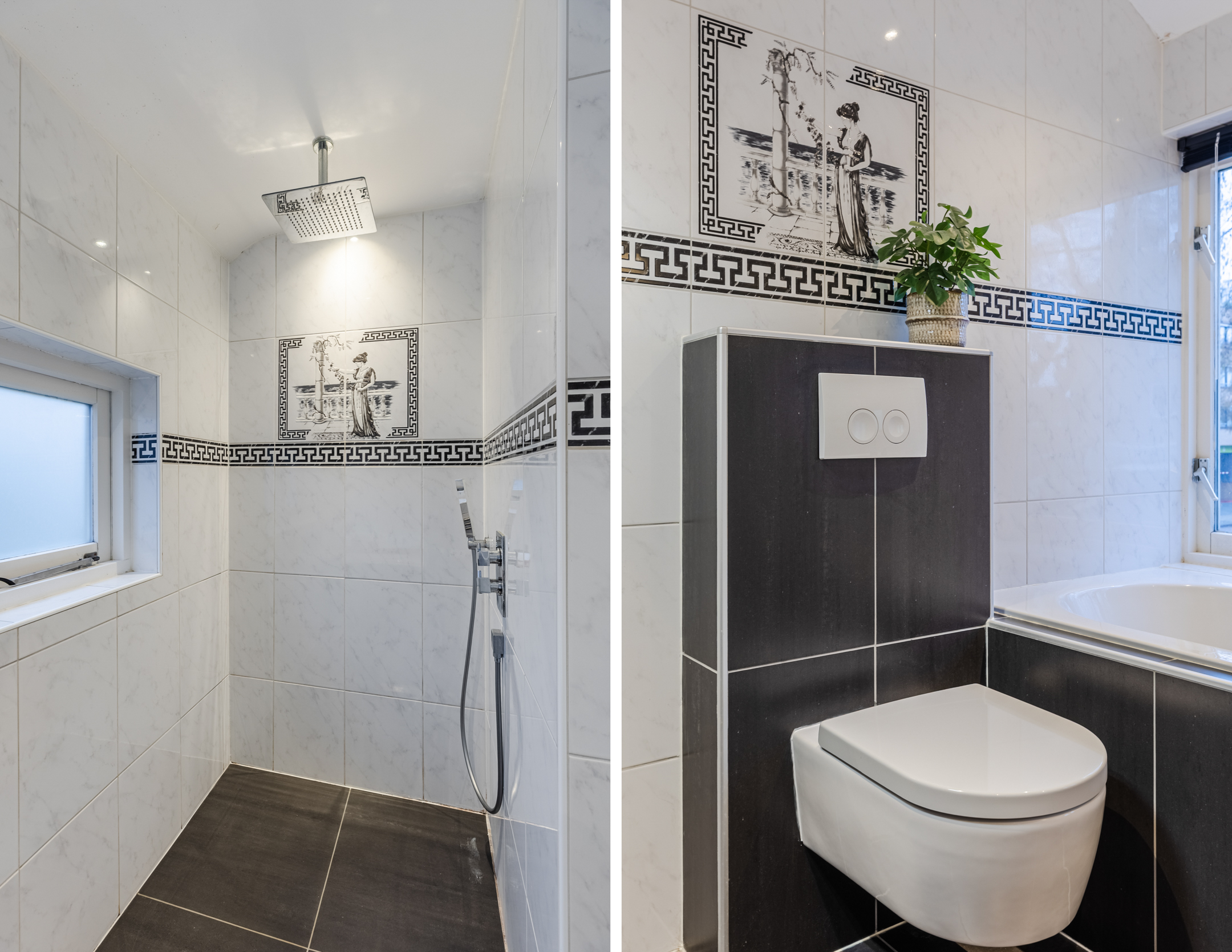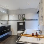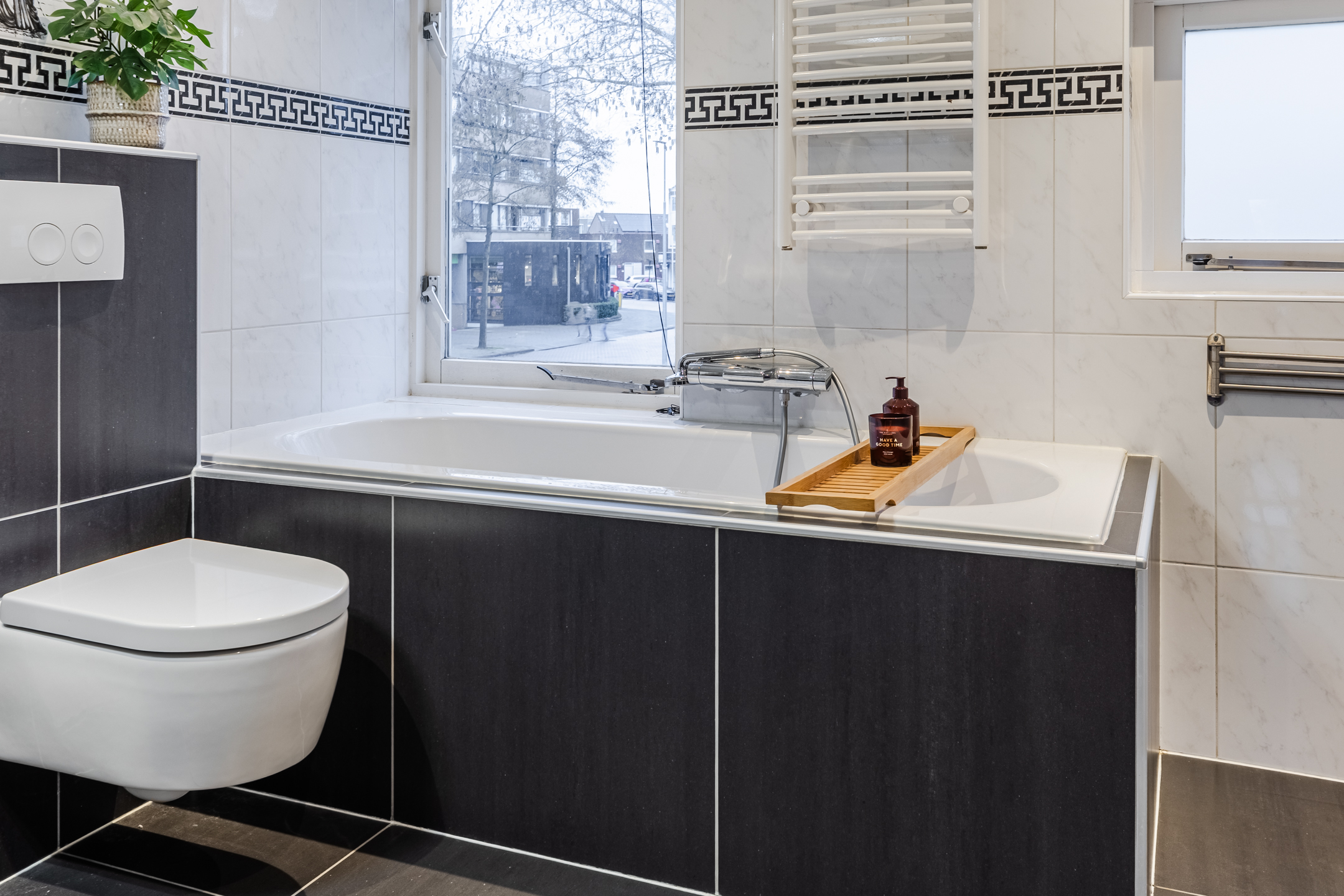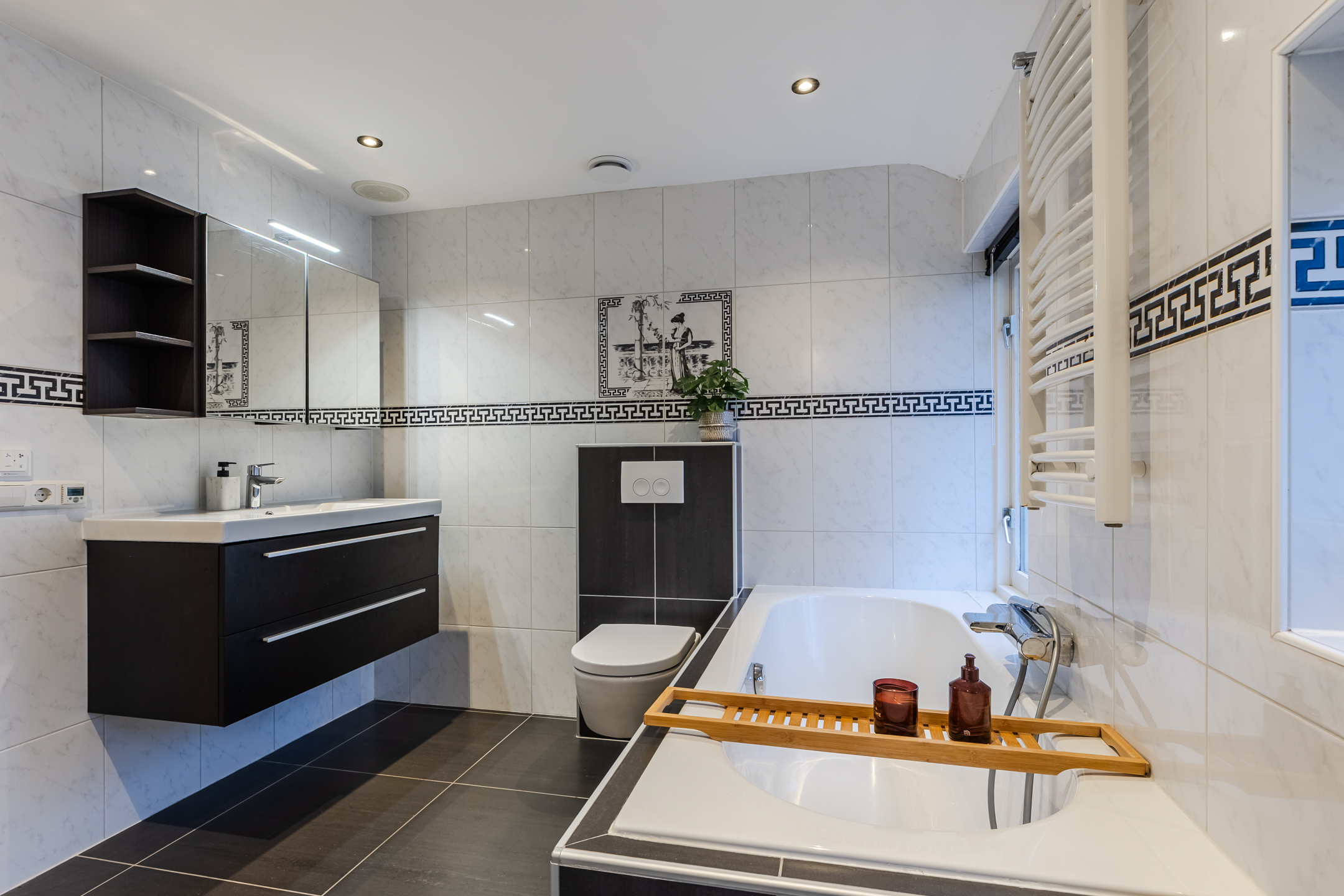 De royale, nette badkamer is afgewerkt met een combinatie van zwarte en witte tegels. Deze ruimte is uitgerust met een zwevend toilet, badmeubel met wastafel, ligbad, designradiator en inloopdouche. De badkamer wordt verlicht met inbouwspots en is voorzien van elektrische vloerverwarming.