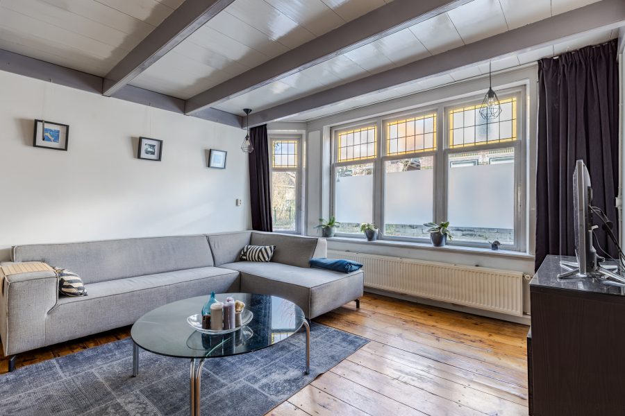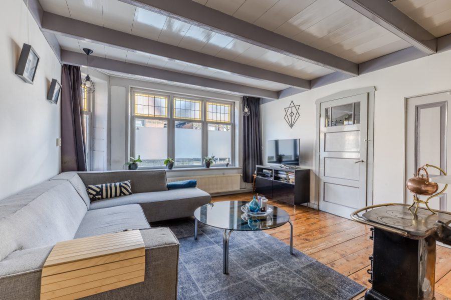 Via de stoep bereiken we de voordeur van de woning. De voordeur is voorzien van glas-in-lood bovenlichten. De hal met garderobe en trapopgang, voorzien van een terrazzo vloer, leidt naar de eerste verdieping en geeft toegang tot de ruime, sfeervolle woonkamer met schouw en potkachel. De woonkamer heeft aan de voorzijde een tweetal raampartijen met glas-in -lood bovenlichten. In het plafond zijn de balken zichtbaar en de vloer is uitgevoerd in grenen.