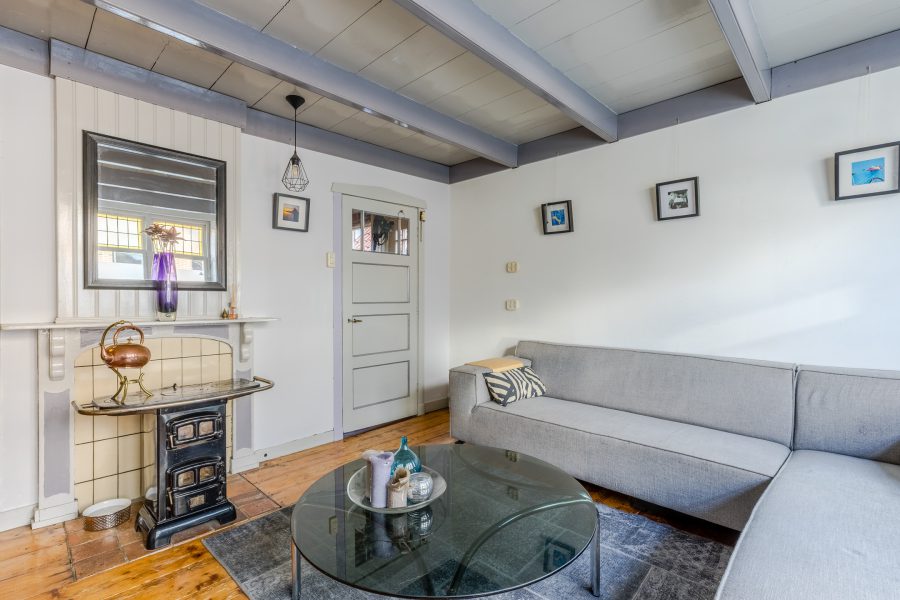 • Lichte woonkamer met balkenplafond en schouw met potkachel