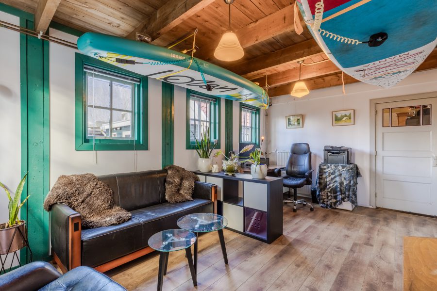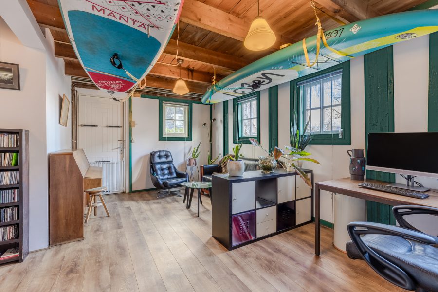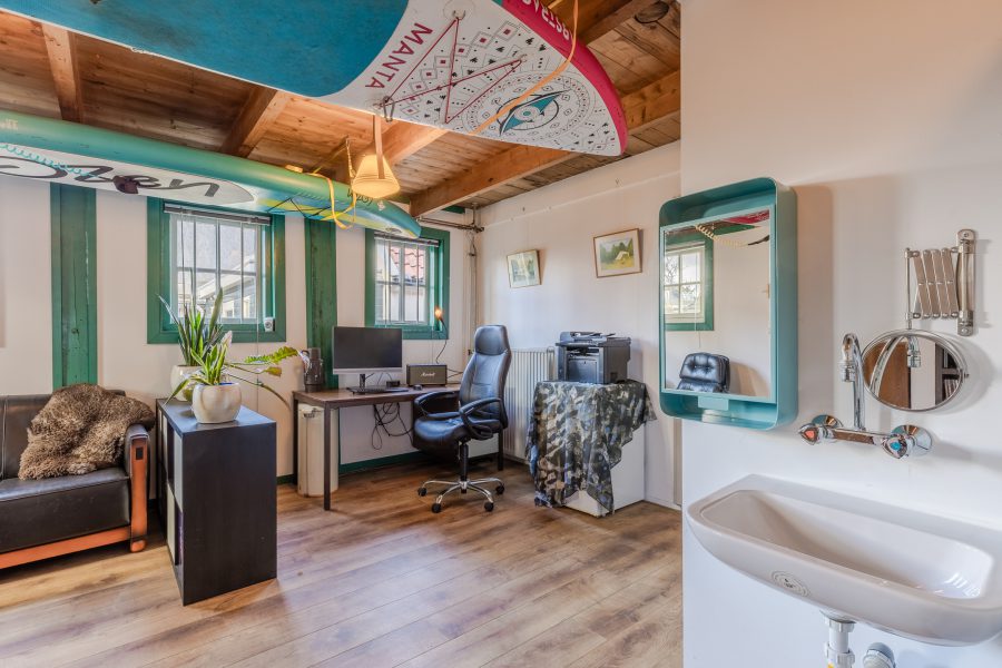 Through the kitchen, the spacious office is accessible. In 2014, the barn was stylishly converted into an office. The office is spacious enough for a number of workstations and/or a seating area. Also, the office still has a hatch in the ceiling, making it possible to create a second staircase up there. A sink is available. A space with possibilities. Through the office, you have access to a utility room. Here you will find the technical installation.