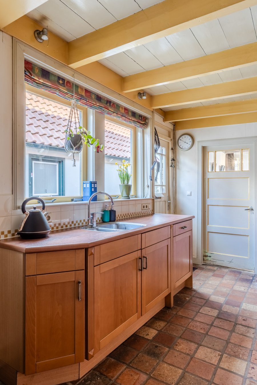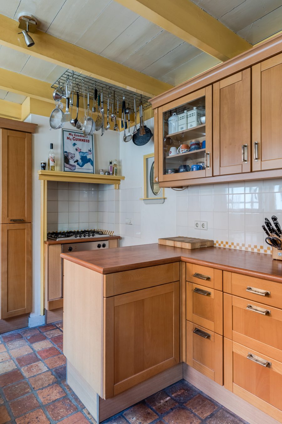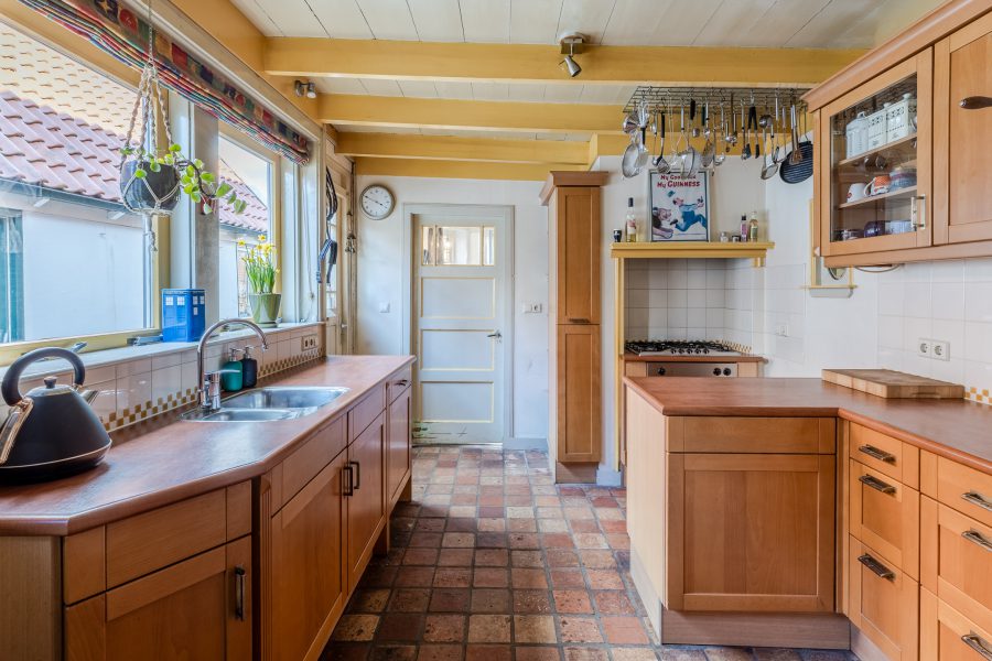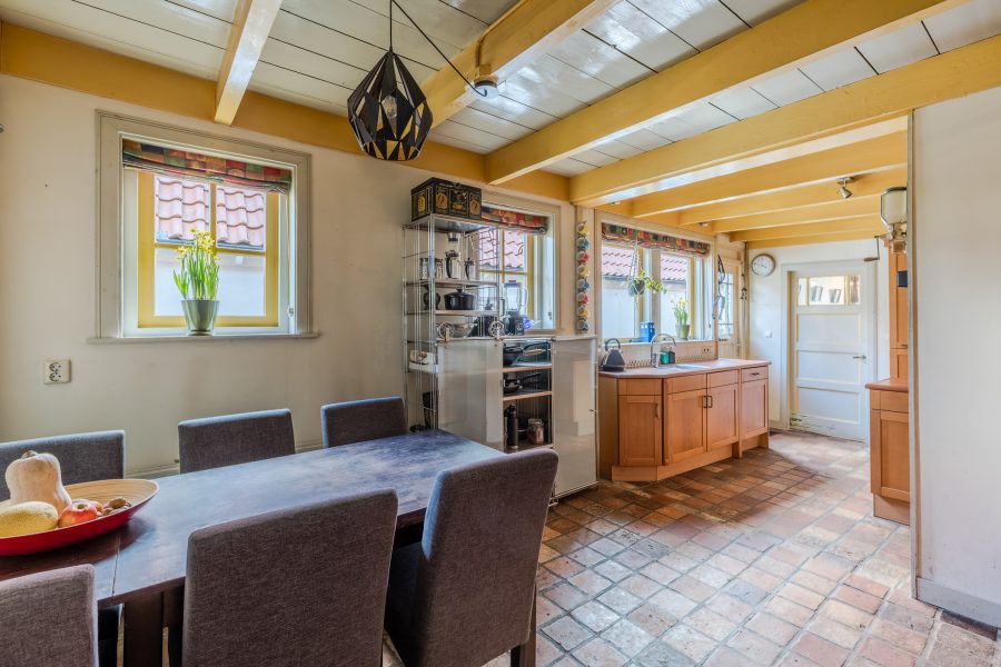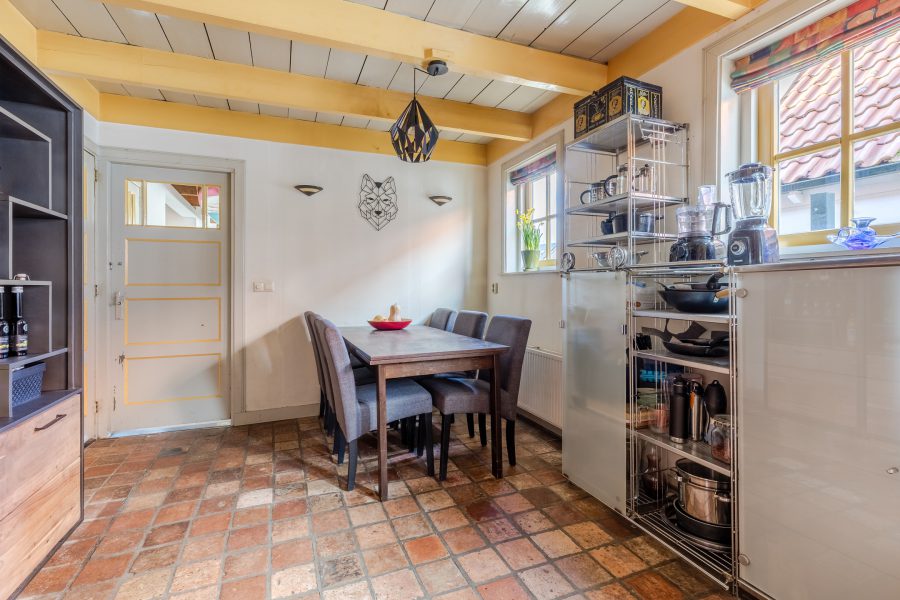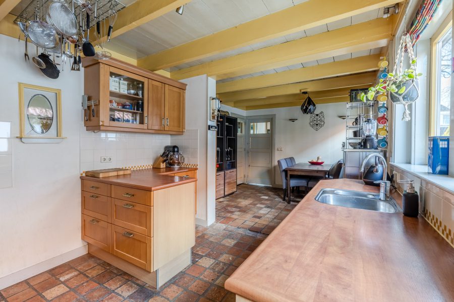 Through the living room you reach the kitchen. This was built in 2000, retaining the atmosphere of yesteryear. The kitchen has four windows and a door to the alley (this door is used daily as an entrance door to the house). The kitchen is equipped with built-in appliances. Again, the beams are visible and the floor is tiled. The kitchen offers enough space to fit a large dining table. Through the kitchen, the floating toilet with hand basin and the bathroom are accessible.