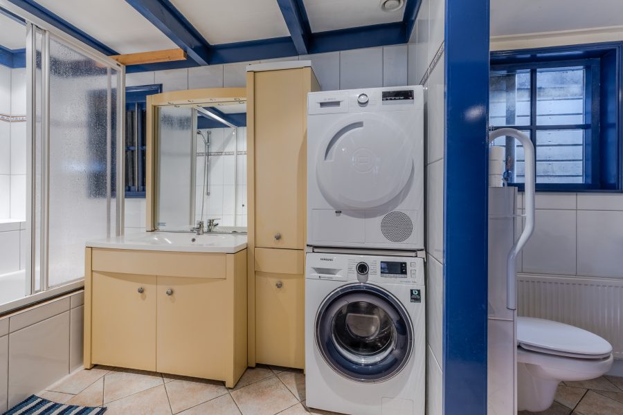 In the bathroom you will find a vanity unit with sink and mirror and a bathtub with shower. The connection for washer and dryer can also be found here. The bathroom has an open connection to the toilet room. The bathroom and toilet have underfloor heating.