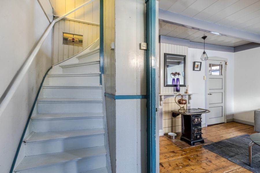 Via the pavement, we reach the front door of the house. The front door features stained-glass overhead lights. The hall with cloakroom and staircase, with terrazzo floor, leads to the first floor and gives access to the spacious, cosy living room with fireplace and pot-bellied stove. At the front, the living room has two windows with stained-glass skylights. The ceiling has exposed beams and the floor is done in pine.
