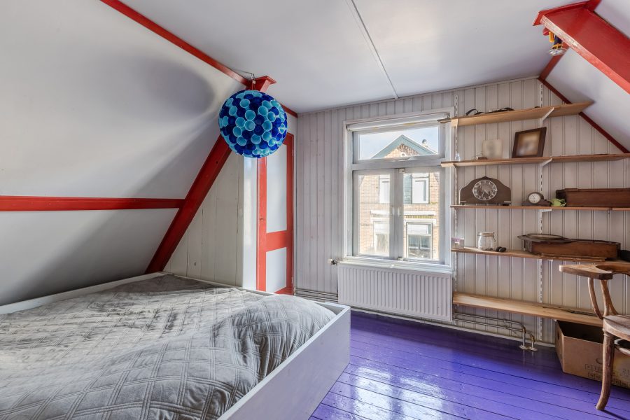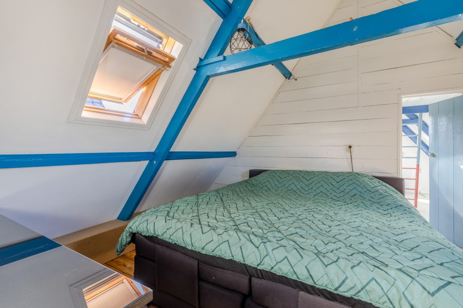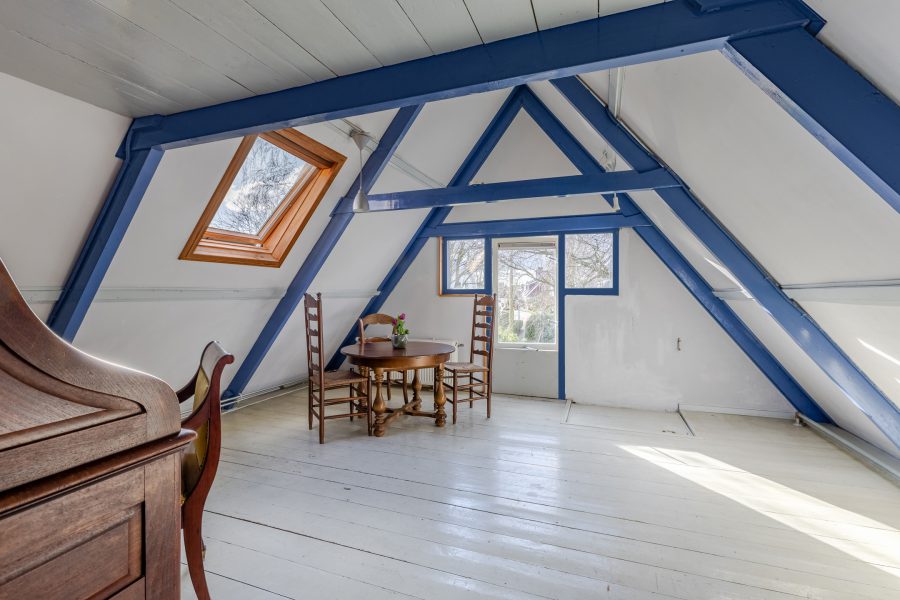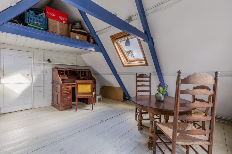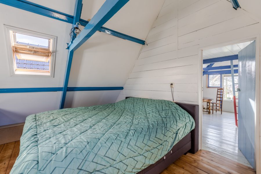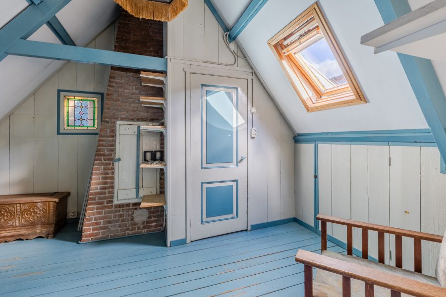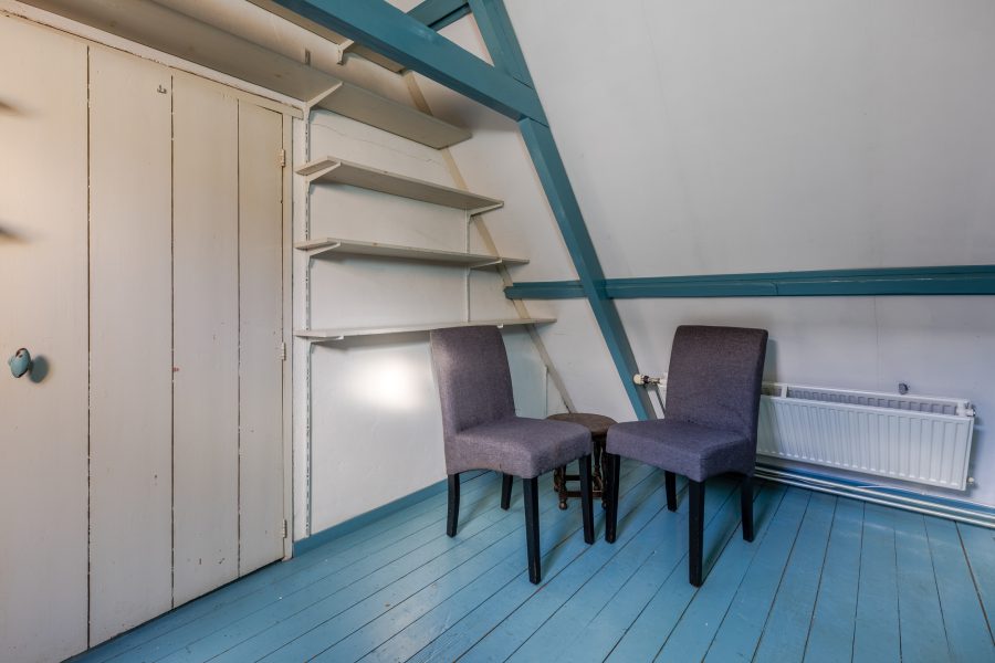 Via de trap in de hal bereik je de overloop van deze verdieping. Hier tref je twee bergkasten, twee slaapkamers en twee tussenkamers aan. Eén slaapkamer ligt aan de achterzijde en een aan de voorzijde van de woning. Ook hier zijn de balken zichtbaar en is de sfeer behouden. Er liggen houten vloerdelen en het daglicht komt via ramen en Velux dakramen binnen. Een fijne ruimte om naar eigen ideeën en mogelijkheden te gebruiken.