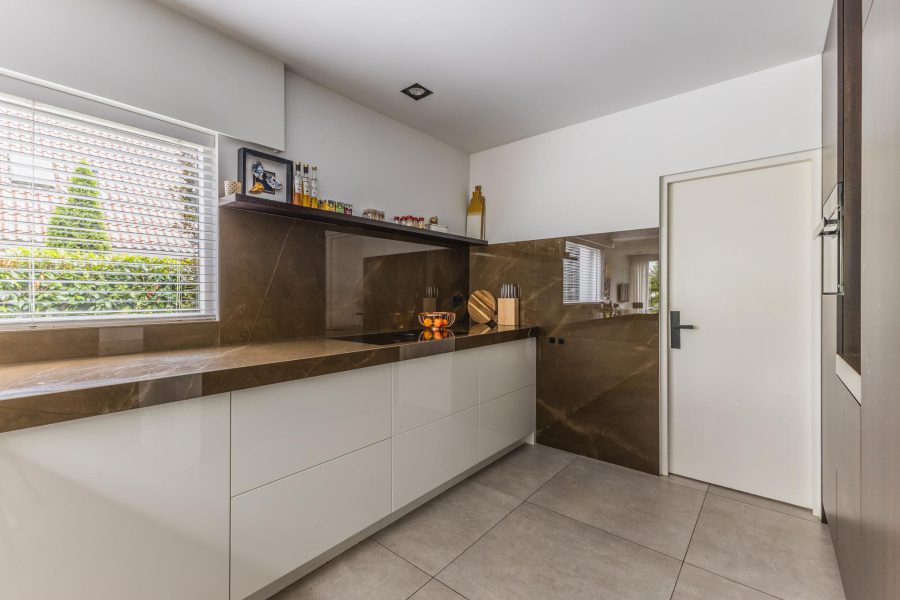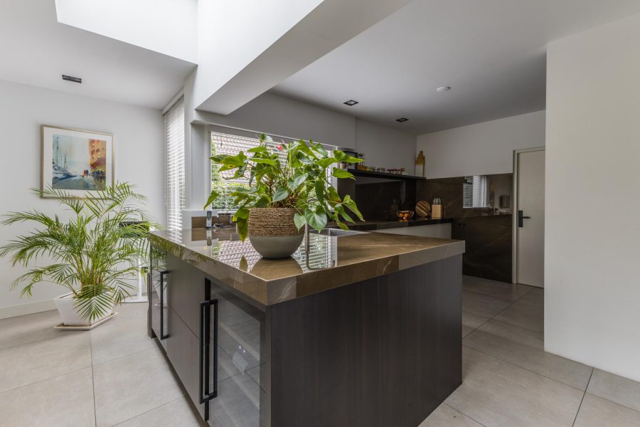 • Zeer stijlvolle maatwerkkeuken inclusief wijnkasten en een spectaculair keramiek werkblad.