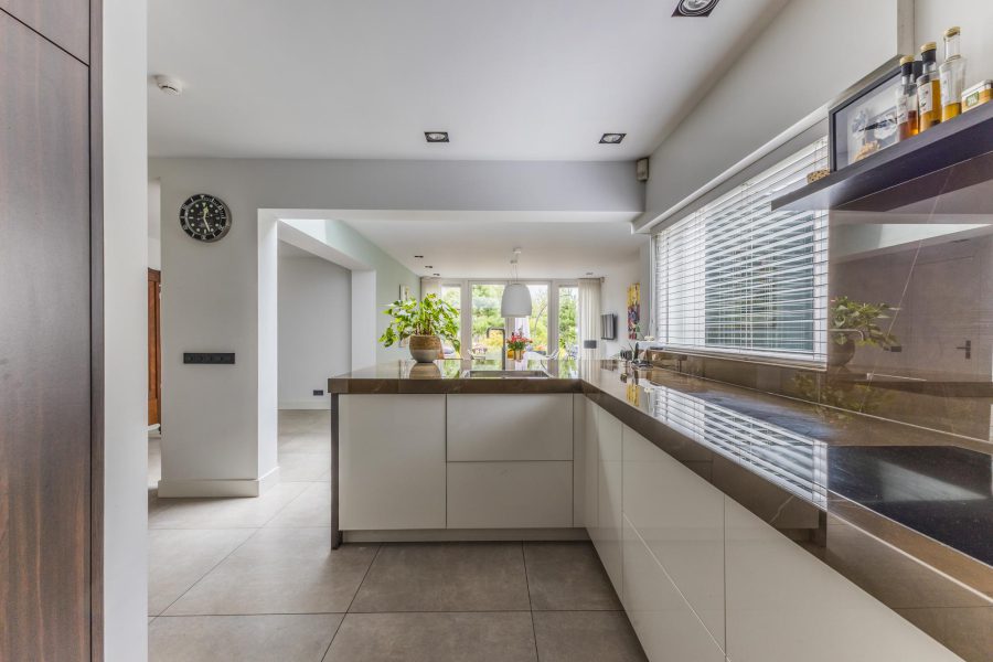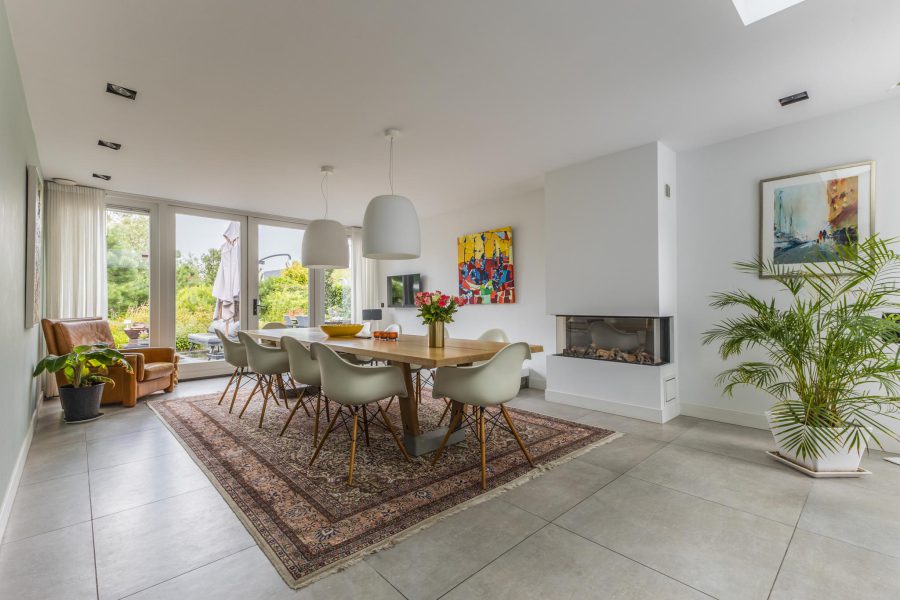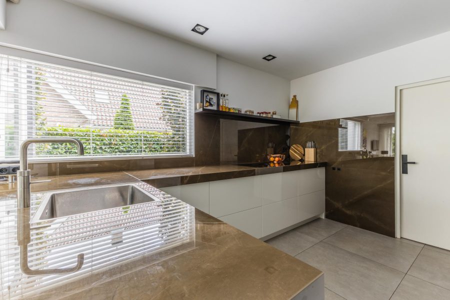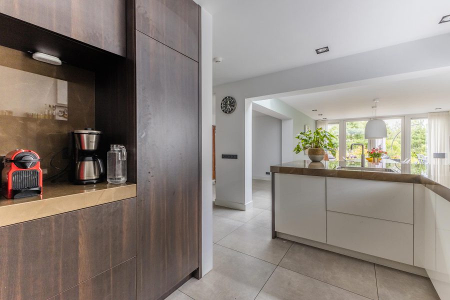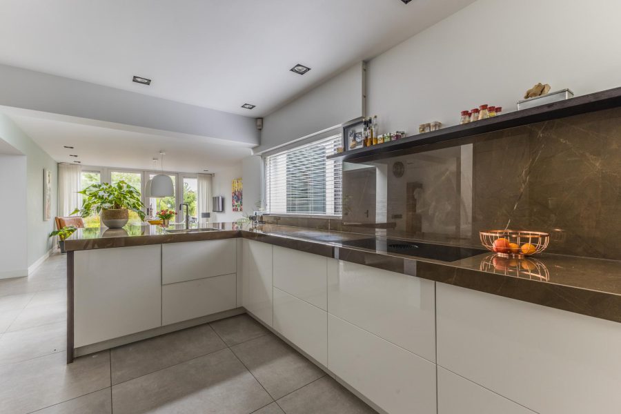 De speels ingedeelde woonkamer heeft centraal een trappenhuis met vide. Zowel links als rechts van de vide tref je een woongedeelte aan. De ruime zitkamer en de eetkamer zijn via een open doorgang met elkaar verbonden. De zitkamer is ruim en voorzien van diverse raampartijen en openslaande deuren naar de tuin, de eetkamer is ruim genoeg voor het plaatsen van een tienpersoons eettafel. Ook hier heb je zicht op de tuin en is deze via openslaande deuren toegankelijk. Beide gedeelten zijn voorzien van een fraaie sfeerhaard. De eetkamer is verbonden met de ruime, stijlvolle maatwerkkeuken. De keuken heeft witte en houtlook fronten met een spectaculair keramiek werkblad en is voorzien van hoogwaardige inbouwapparatuur, waaronder een inductiekookplaat en een wijnkoelkast. Via de keuken bereik je de bijkeuken. Hier tref je de aansluitingen voor het witgoed aan.