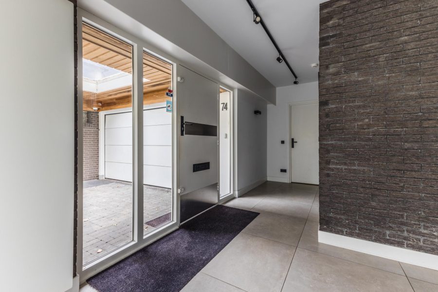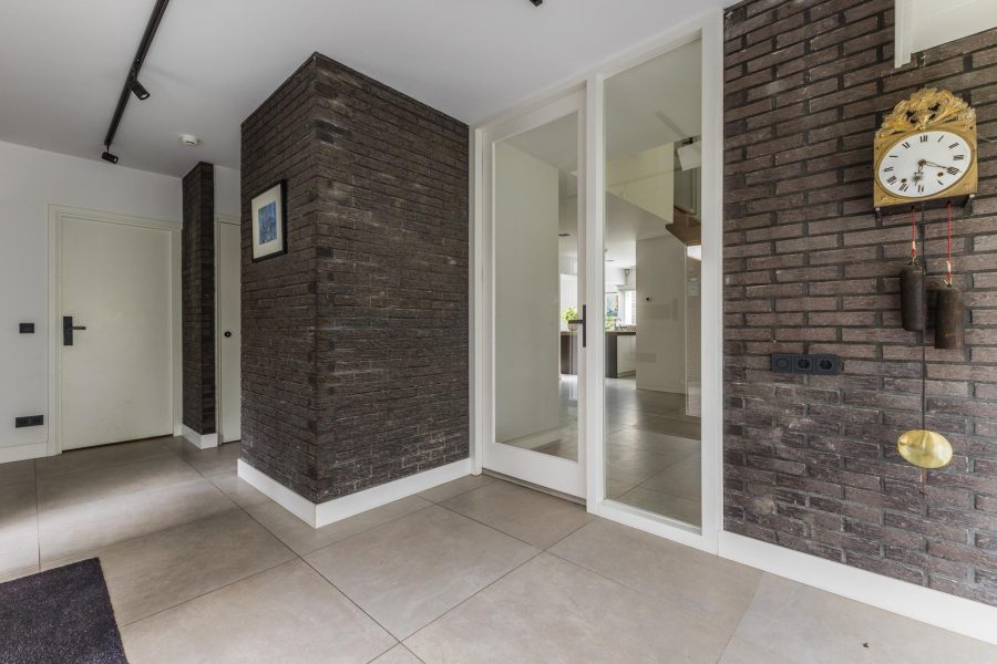 Via de eigen oprit zetten we de auto onder de carport en bereiken de overkapte voordeur. Ruime, lichte entree met garderobe, berging, meterkast, zwevend toilet met fonteintje en toegang tot de woonkamer met open keuken(2023). De woning is ook via de inpandige garage en berging toegankelijk.