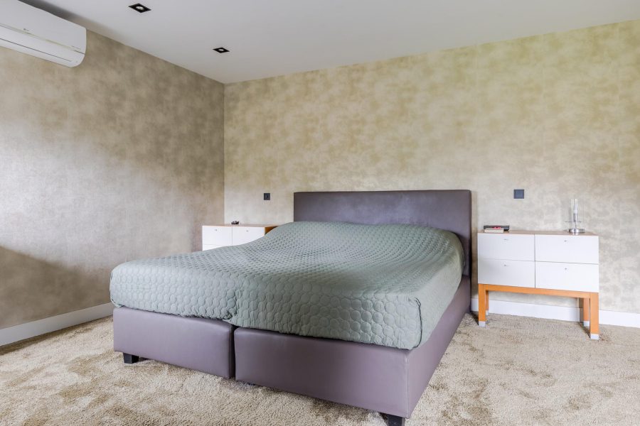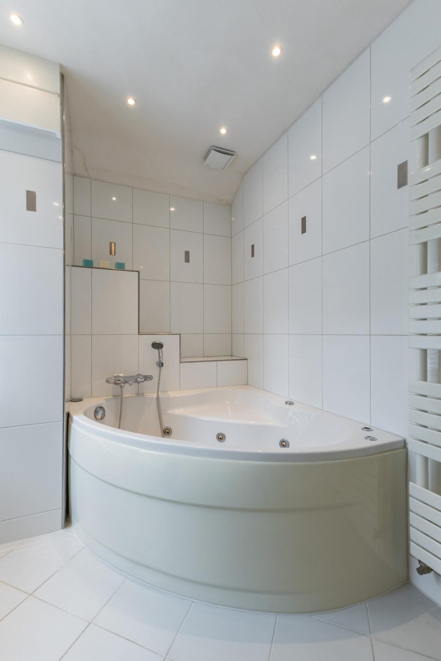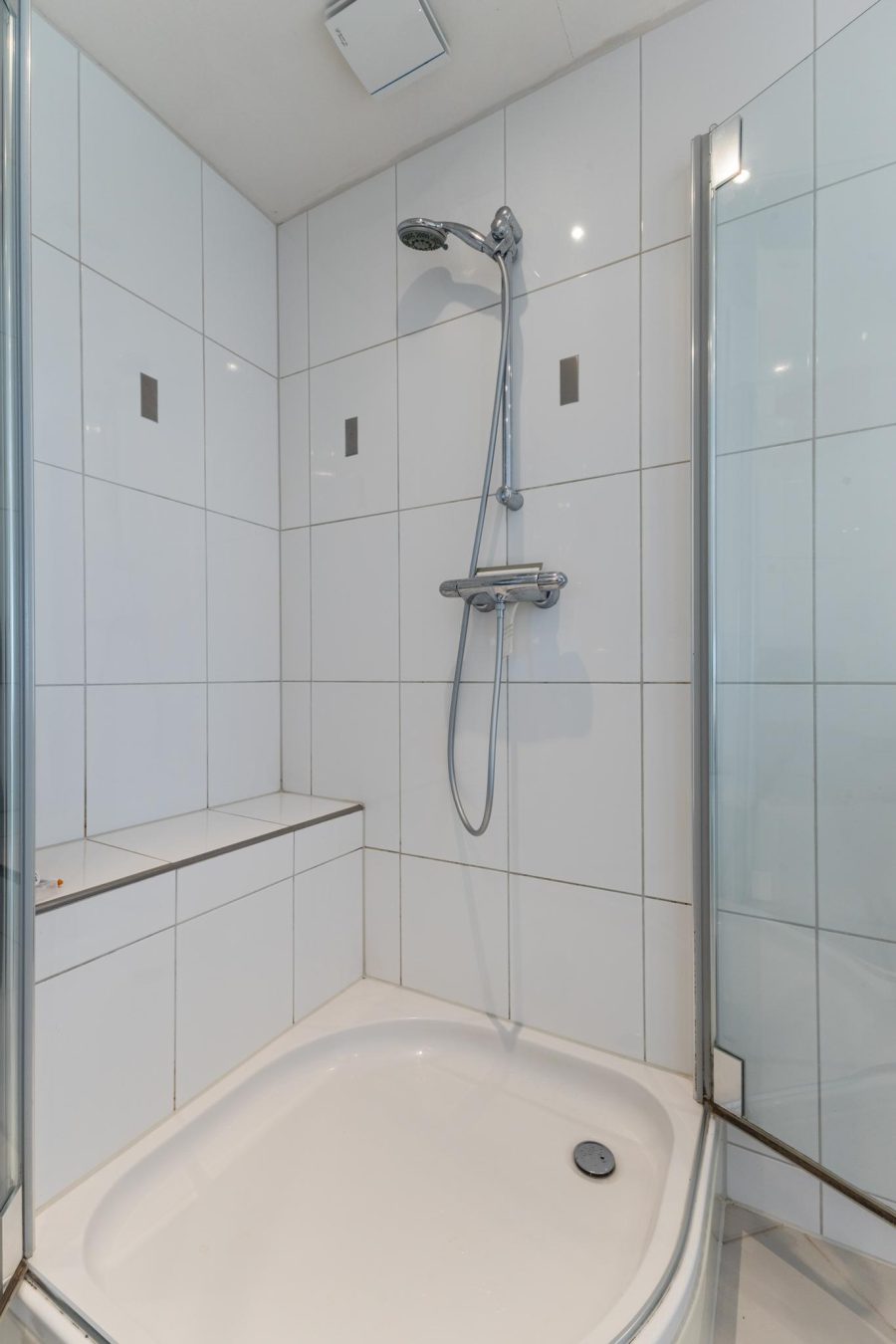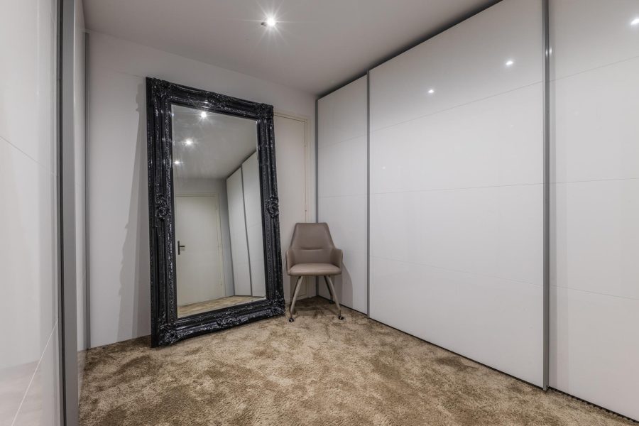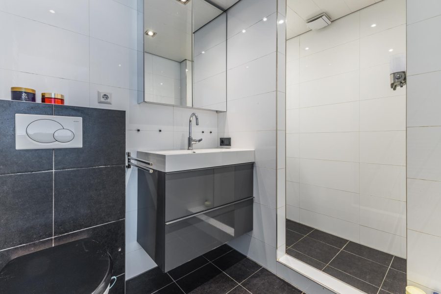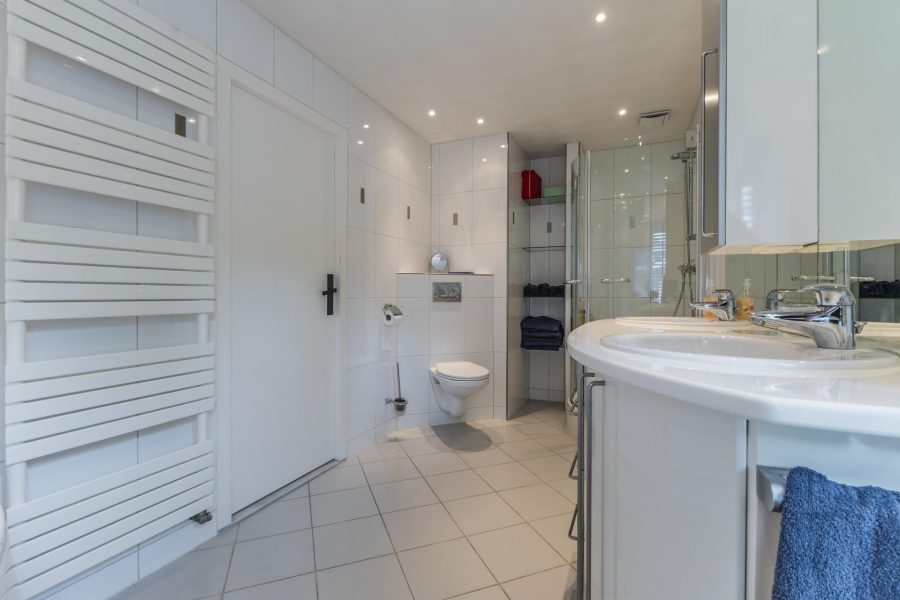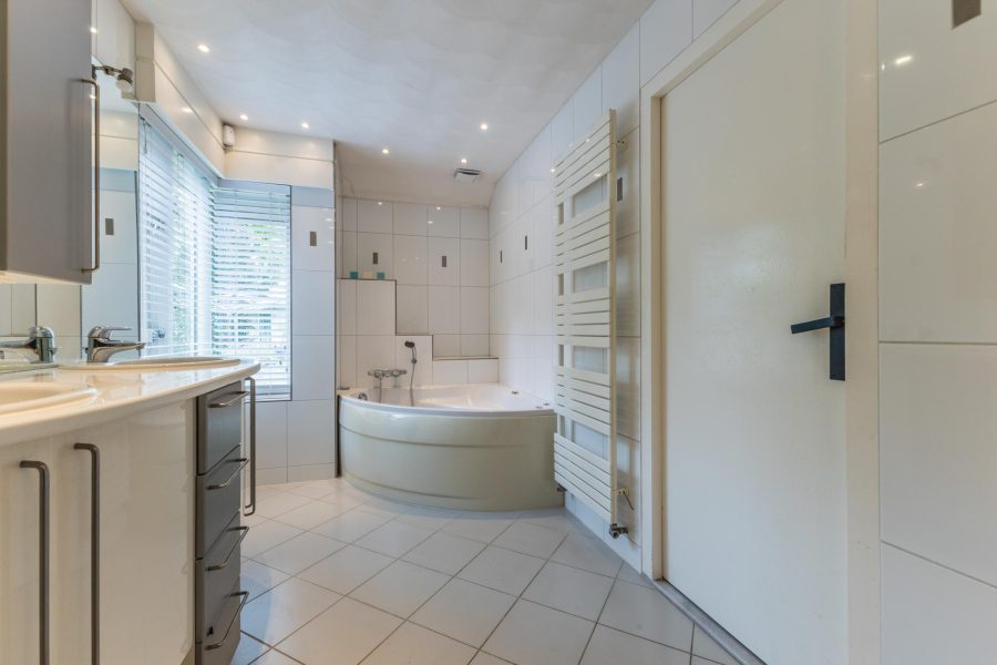 Via de dressing bereik je een volledige slaapunit met ensuite badkamer. In de badkamer zijn een badmeubel met wastafel en spiegel te vinden, een ligbad en een douchecabine. Op de vloer van de begane grond liggen grote, lichte tegels en in het plafond zijn inbouwspots en spots op rails verwerkt.