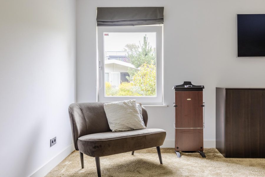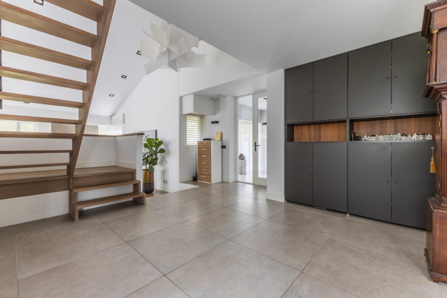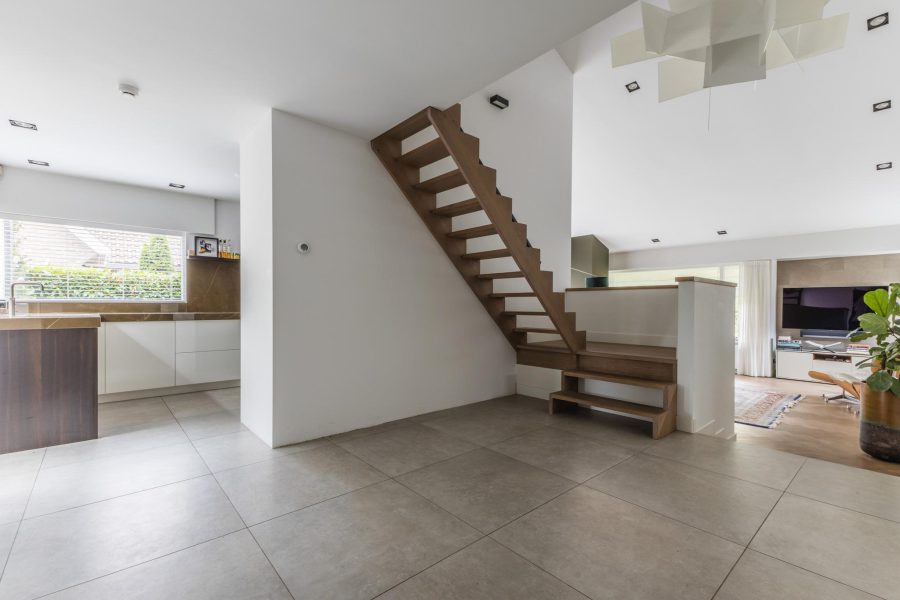 The creatively arranged living room has a central staircase with a mezzanine. On either side of the mezzanine, there are living areas. The spacious sitting room and dining room are connected through an open passage. The sitting room is roomy with multiple windows and doors opening onto the garden. The dining room is large enough for a ten-person dining table, also with garden views and accessible through French doors. Both areas feature an elegant fireplace. The dining room is connected to the spacious, stylish custom kitchen. The kitchen has white and wood-look fronts with a spectacular ceramic countertop and high-quality built-in appliances, including an induction hob and wine cooler. The utility room can be accessed via the kitchen, where there are connections for laundry appliances.