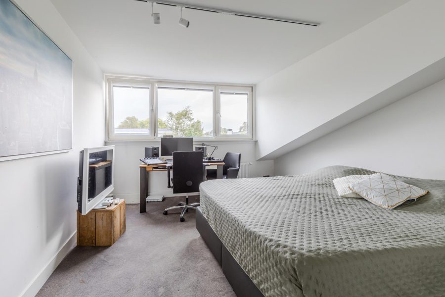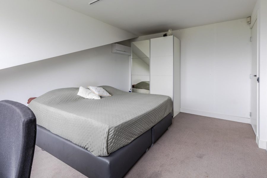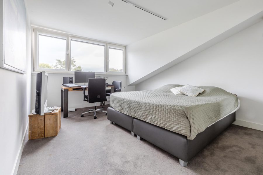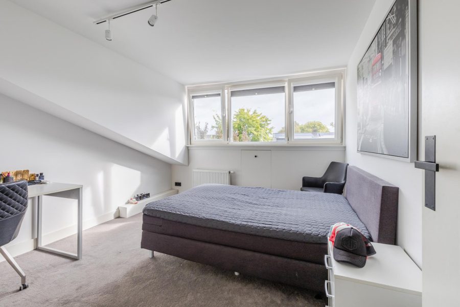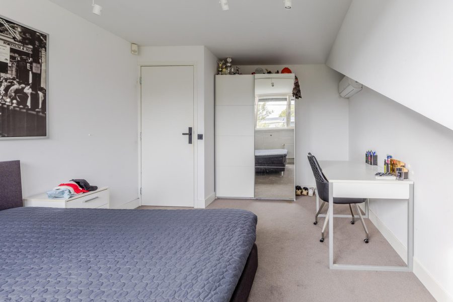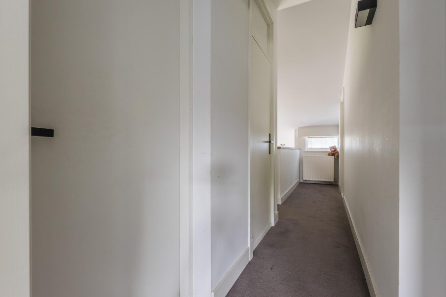 Via de fraaie hal die beide gedeelten van de woonkamer verbindt, vind je een open trap met vide die leidt naar de overloop van deze verdieping. Deze verdieping heeft aan de achterzijde een brede dakkapel. Je treft hier vier ruime slaapkamers, een bergkast en een badkamer aan. Twee slaapkamers liggen aan de achterzijde, twee aan de voorzijde van de verdieping en de badkamer ligt centraal. De badkamer is voorzien van een badmeubel met wastafel en spiegel, een zwevend toilet en een inloopdouche. Op de vloer van de slaapkamers ligt tapijt en/of laminaat.