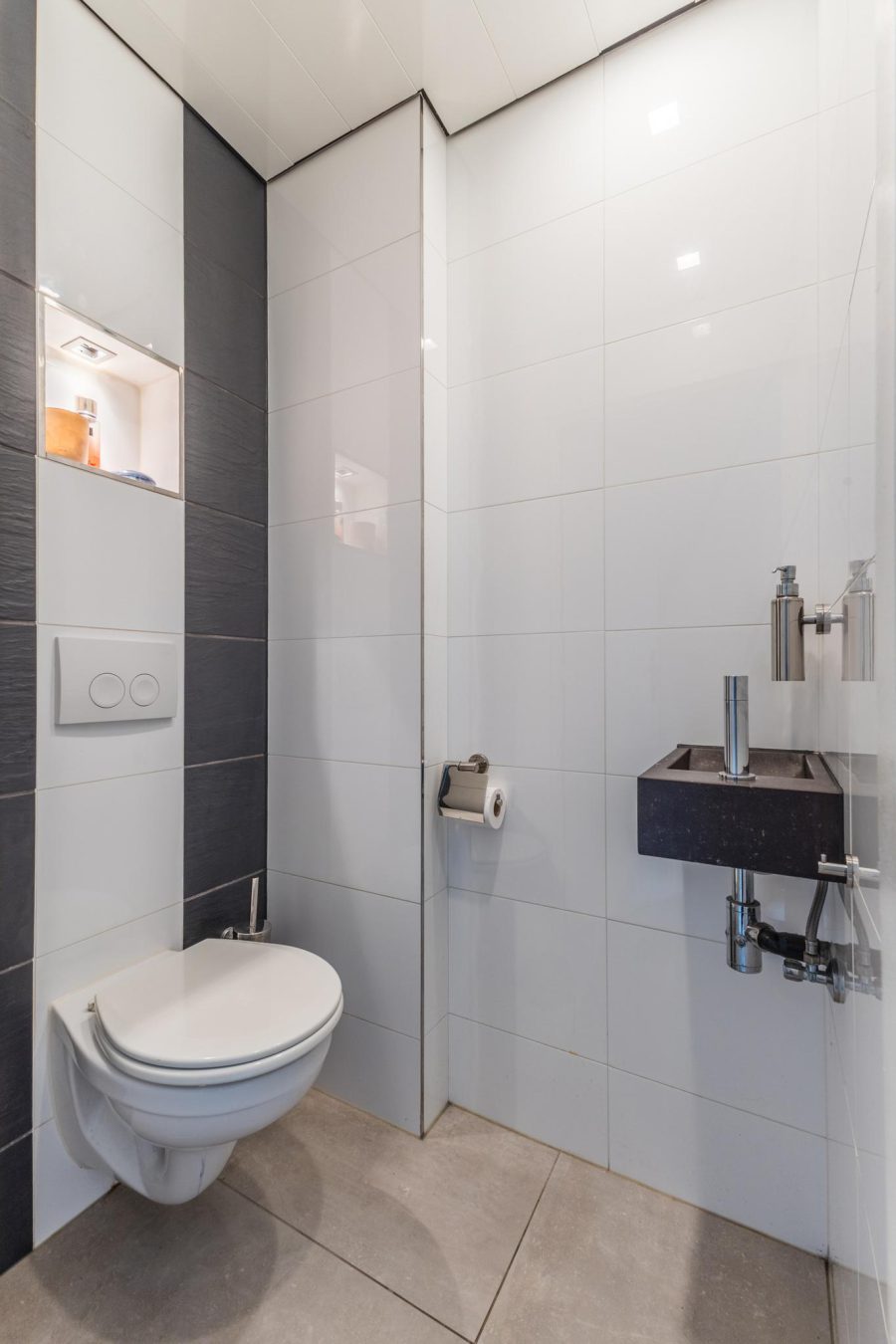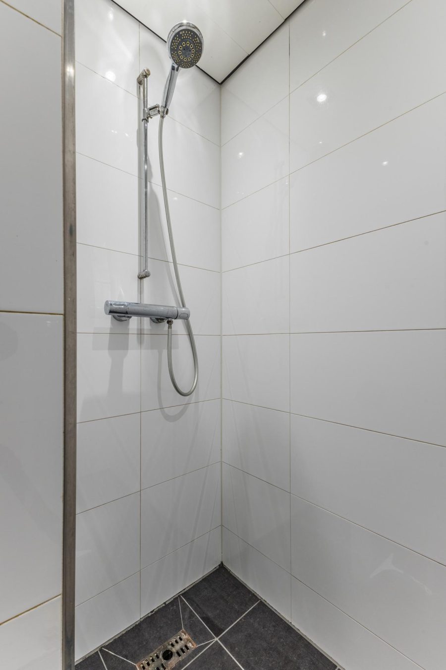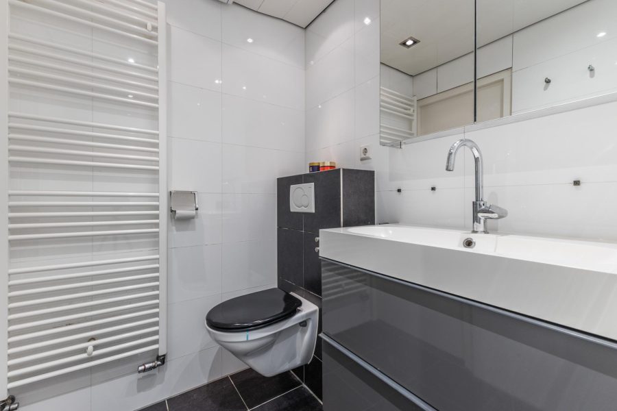 Via de fraaie hal die beide gedeelten van de woonkamer verbindt, vind je een open trap met vide die leidt naar de overloop van deze verdieping. Deze verdieping heeft aan de achterzijde een brede dakkapel. Je treft hier vier ruime slaapkamers, een bergkast en een badkamer aan. Twee slaapkamers liggen aan de achterzijde, twee aan de voorzijde van de verdieping en de badkamer ligt centraal. De badkamer is voorzien van een badmeubel met wastafel en spiegel, een zwevend toilet en een inloopdouche. Op de vloer van de slaapkamers ligt tapijt en/of laminaat.