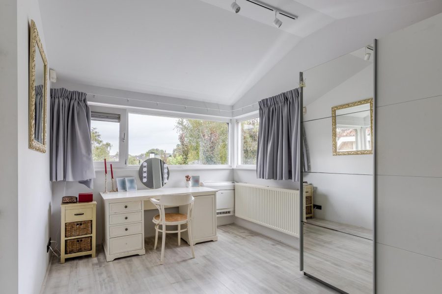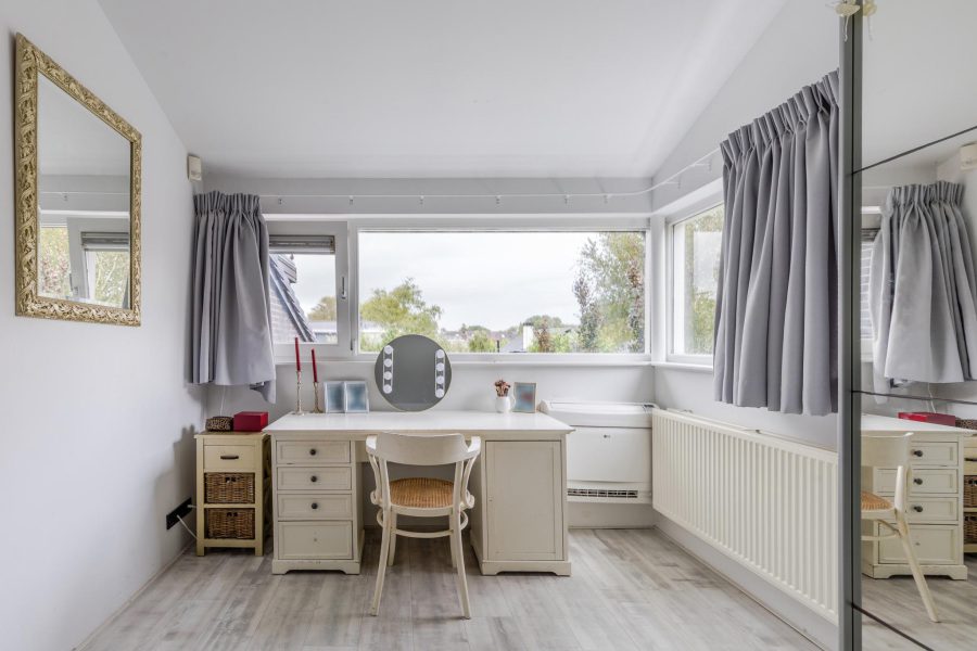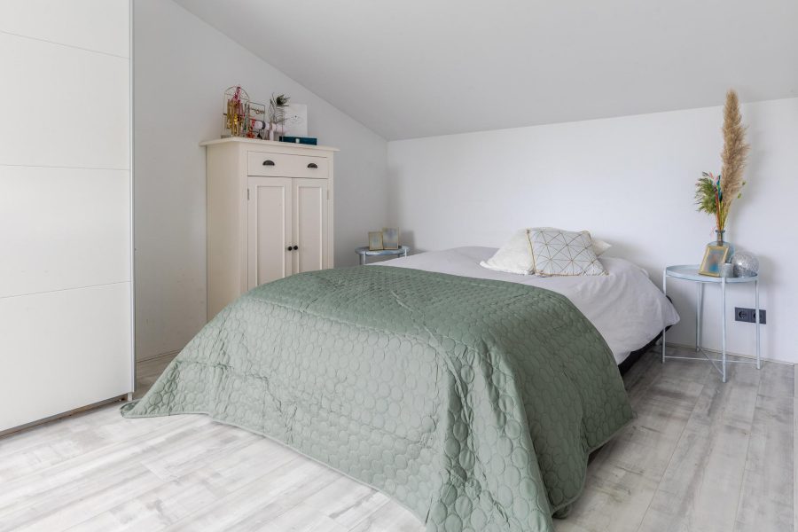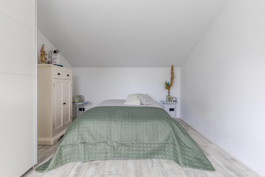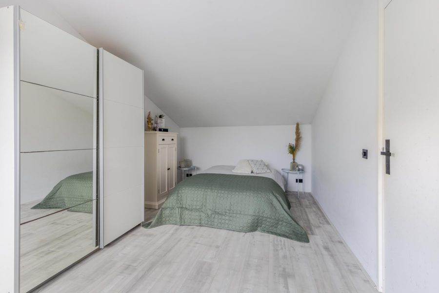 From the elegant hallway connecting both sides of the living room, an open staircase with mezzanine leads to the landing on this floor. The rear of this floor has a wide dormer. Here you’ll find four spacious bedrooms, a storage closet, and a bathroom. Two bedrooms are at the back, two at the front, and the bathroom is centrally located. The bathroom has a vanity unit with sink and mirror, a wall-mounted toilet, and a walk-in shower. The bedrooms have carpet and/or laminate flooring.