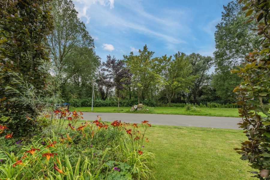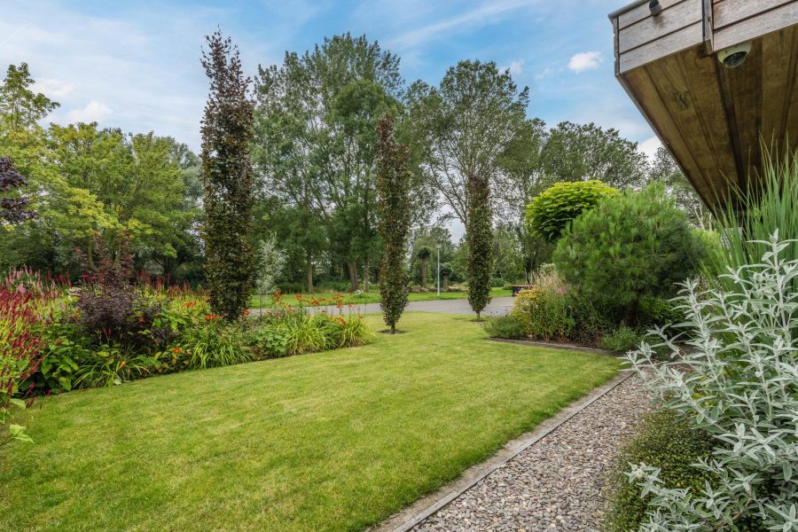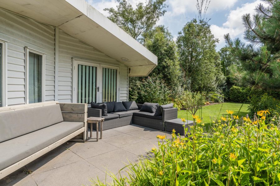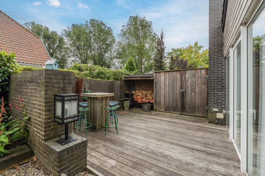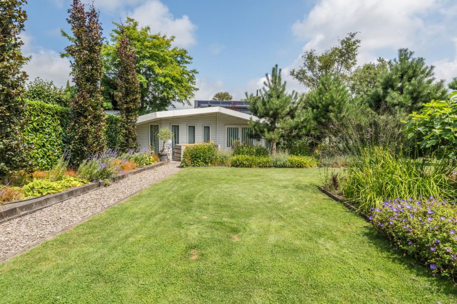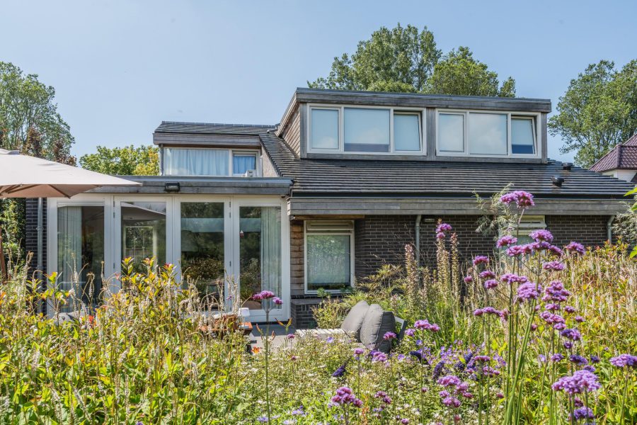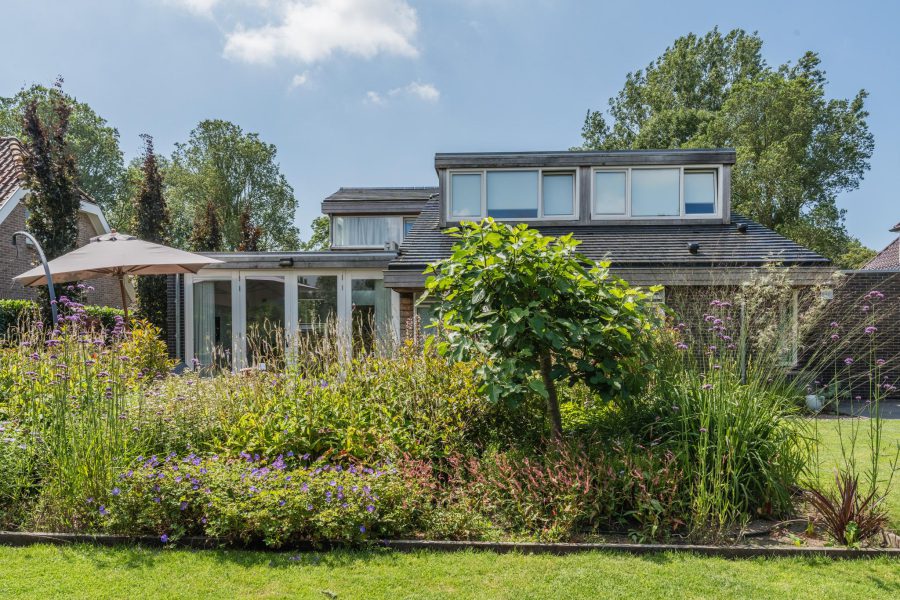 The garden was professionally landscaped, with various terraces, a lawn, and beautifully matured borders filled with a variety of perennial and annual plants. You can enjoy the birds, butterflies, and blooming flowers here. At the back of the garden, there’s a large garden house with a terrace and lounge area. This building offers possibilities for a workspace, hobby room, or guest accommodations. It includes fixed closets, electricity, and water.