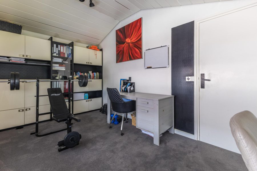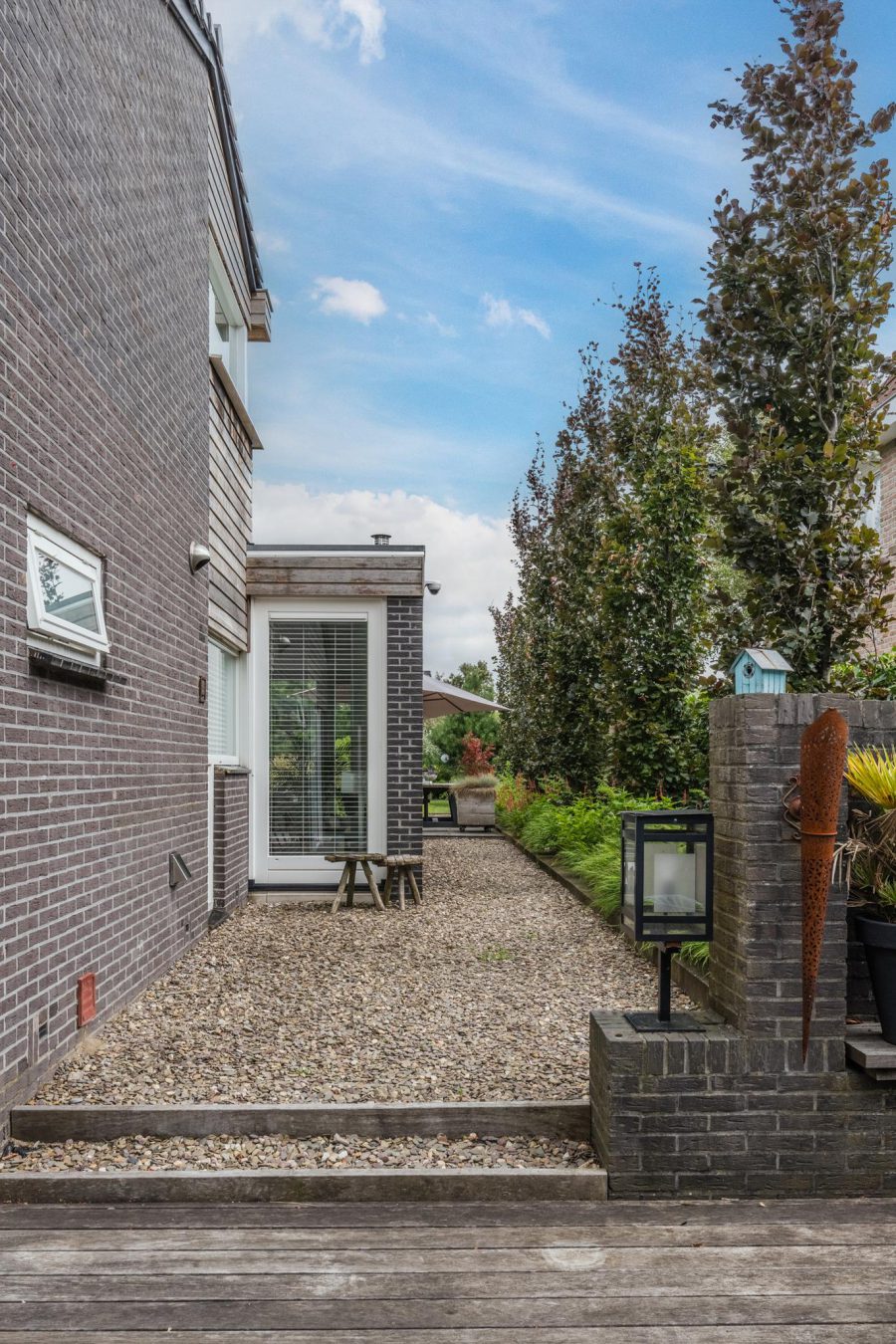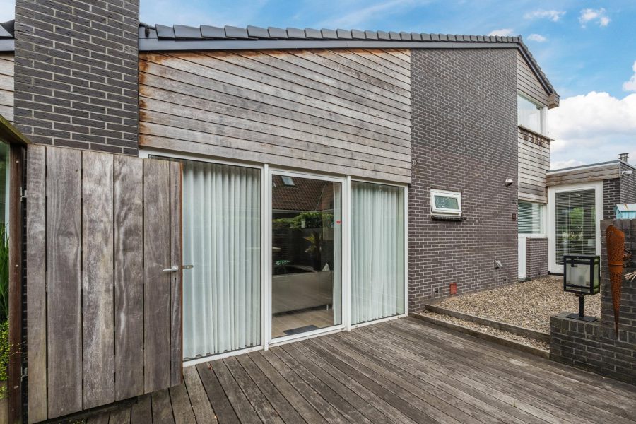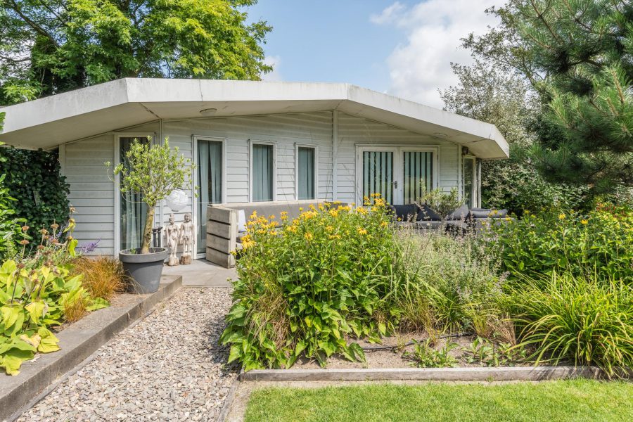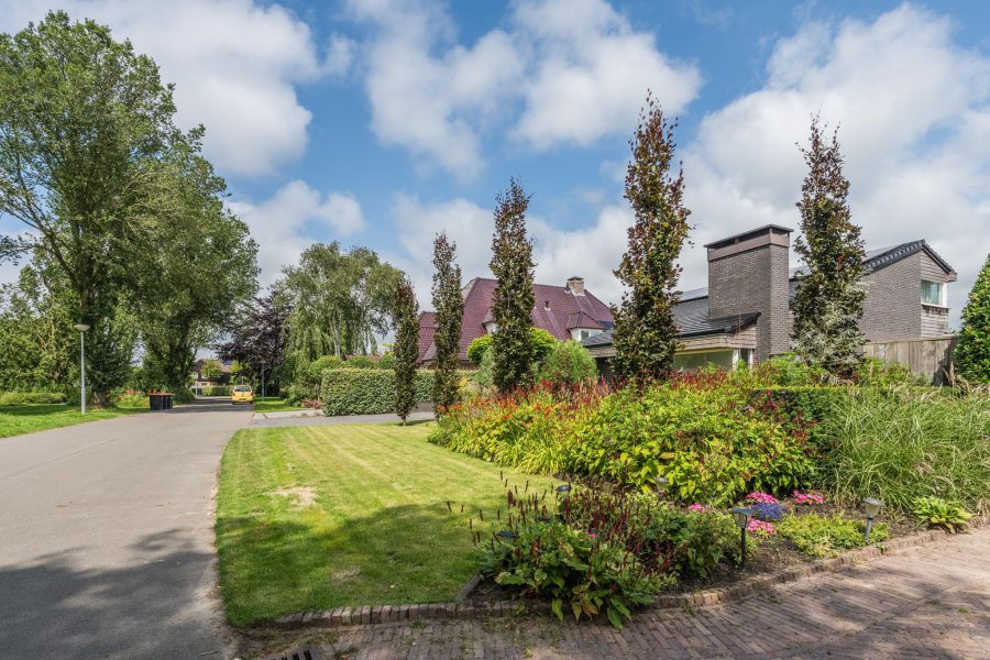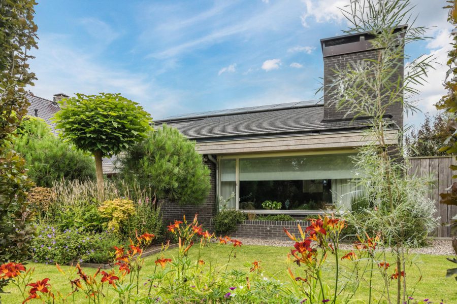 The garden was professionally landscaped, with various terraces, a lawn, and beautifully matured borders filled with a variety of perennial and annual plants. You can enjoy the birds, butterflies, and blooming flowers here. At the back of the garden, there’s a large garden house with a terrace and lounge area. This building offers possibilities for a workspace, hobby room, or guest accommodations. It includes fixed closets, electricity, and water.