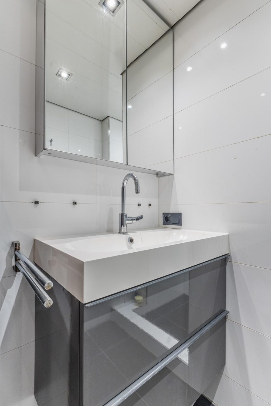 An intermediate room leads to a complete bedroom unit with an ensuite bathroom. The bathroom features a vanity unit with sink and mirror, a bathtub, and a shower cabin. The ground floor is laid with large, light tiles, with recessed and rail-mounted spotlights in the ceiling.