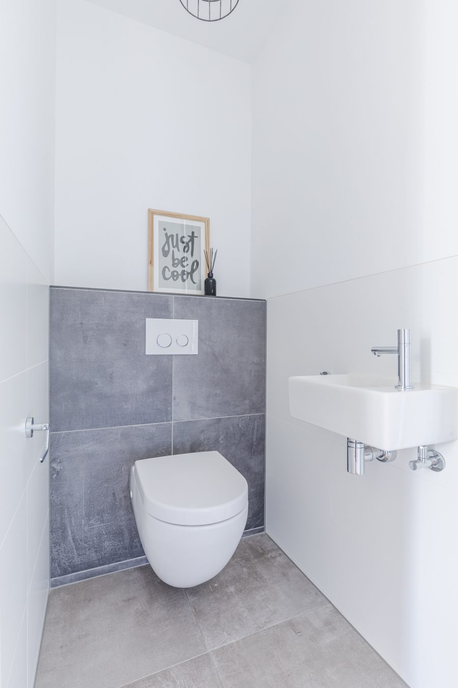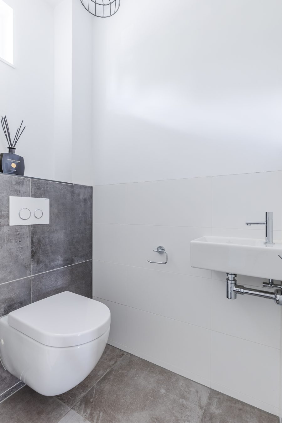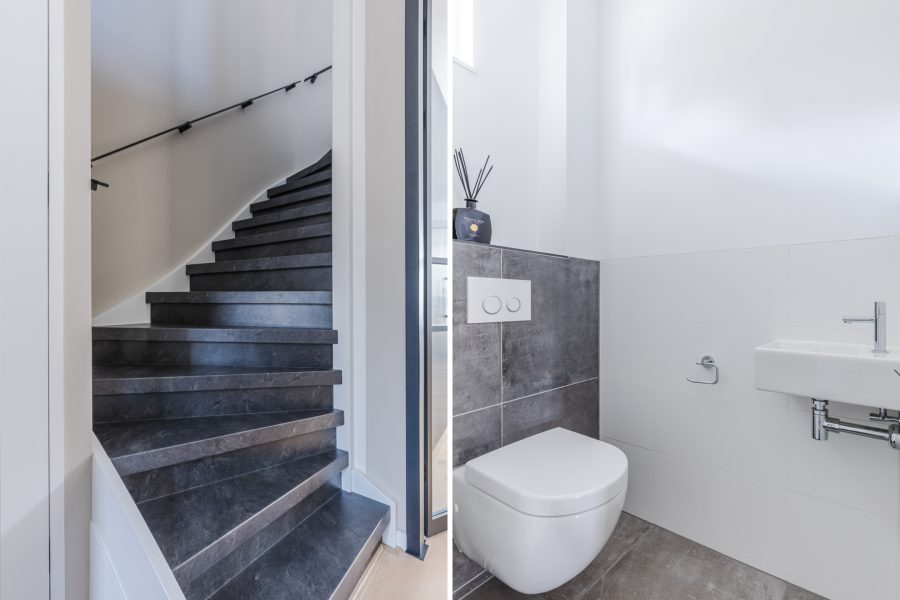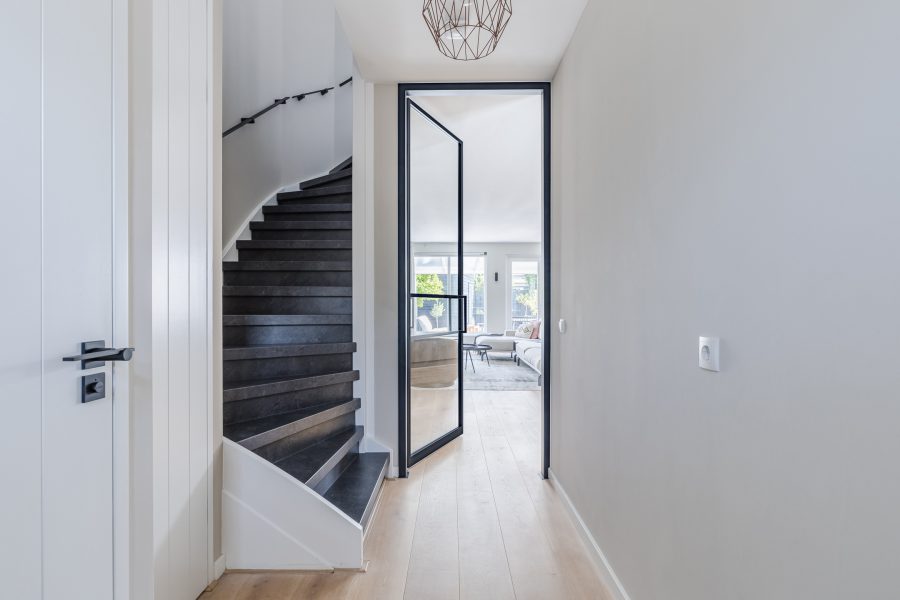 Through the well-kept and tiled front garden, you can reach the covered front door of this unique house. Behind the front door you will find a nicely finished entrance hall, which provides access to a modern toilet room with a floating toilet and sink, the meter cupboard, stairs to the first floor and the living room.