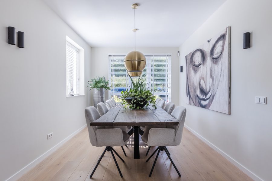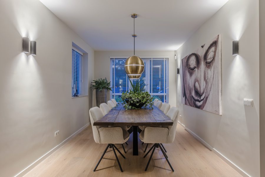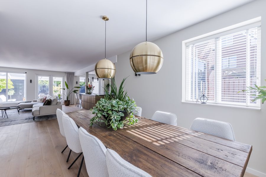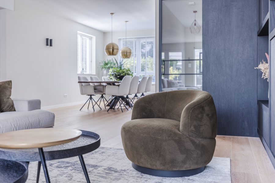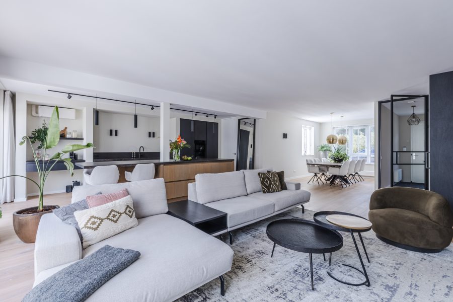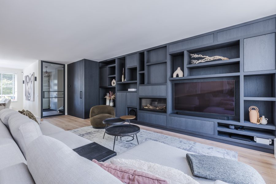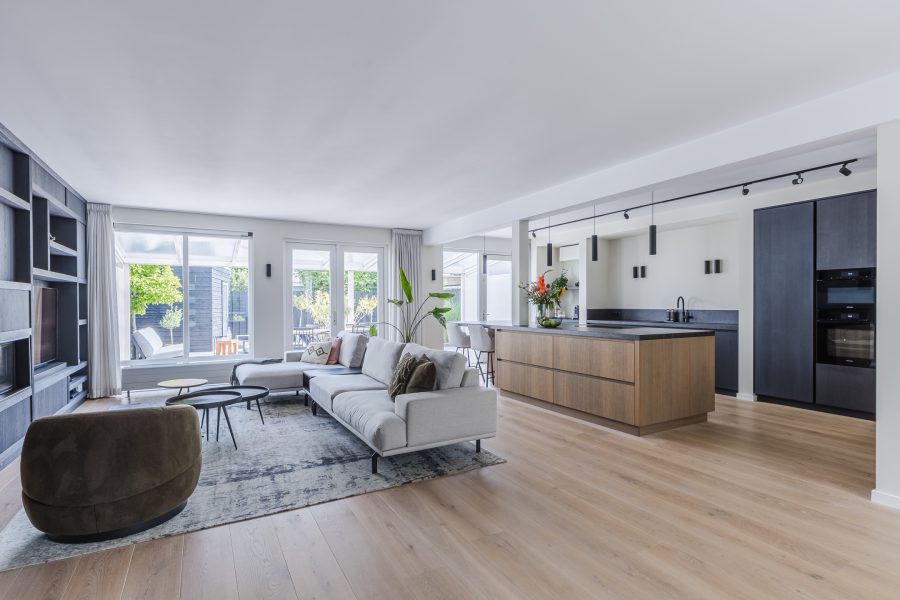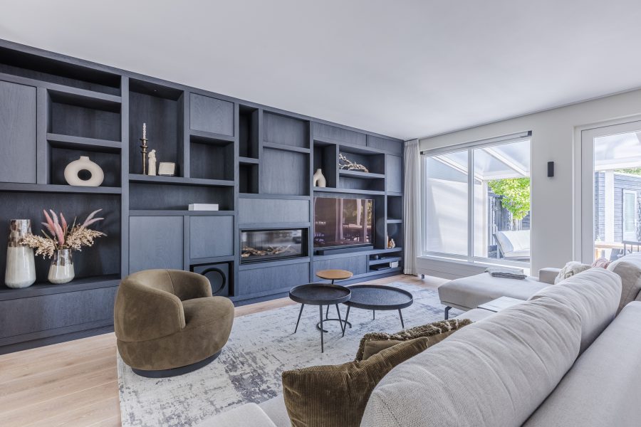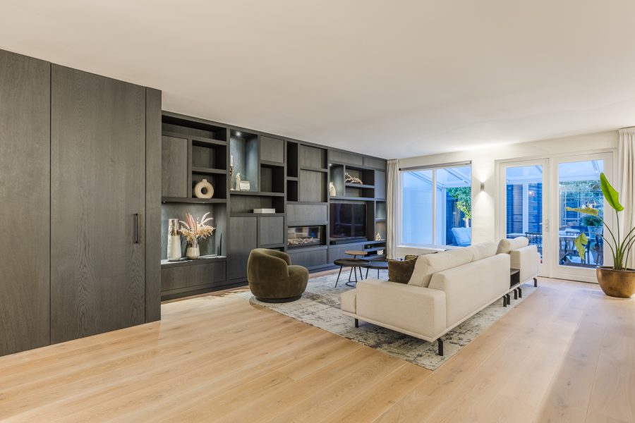 • Royale woonkamer met grote raampartijen en fraaie wandkast