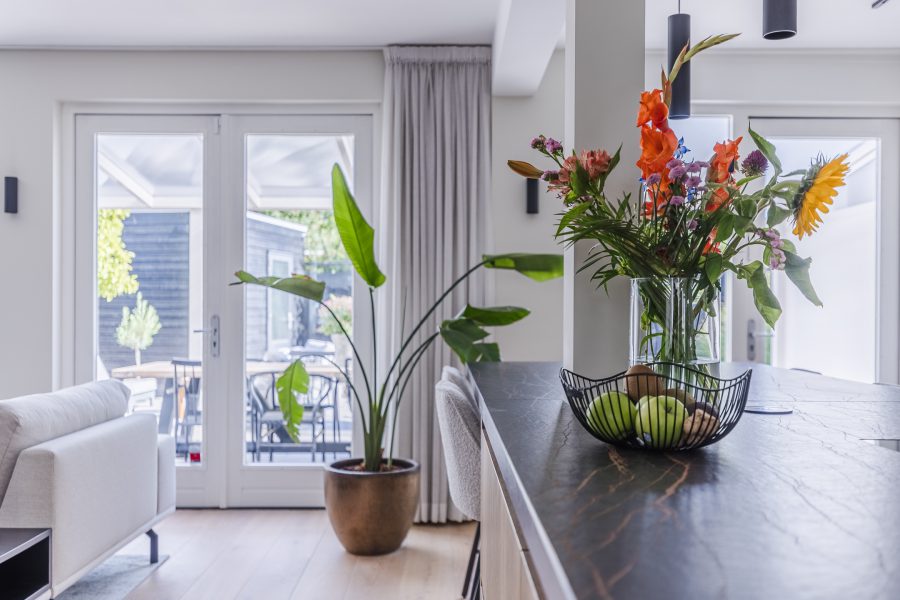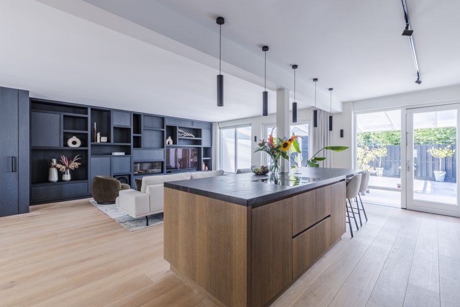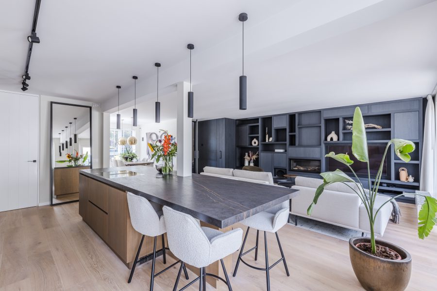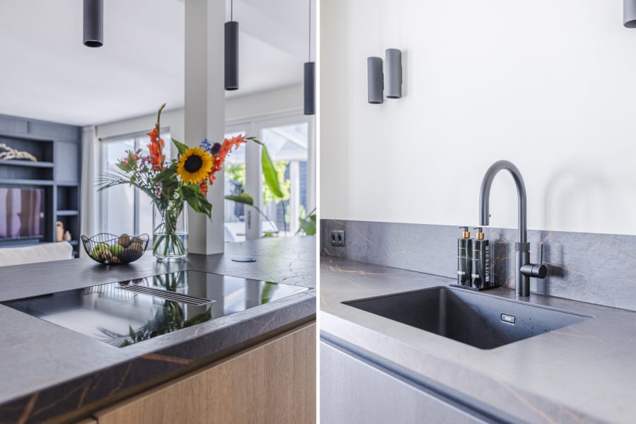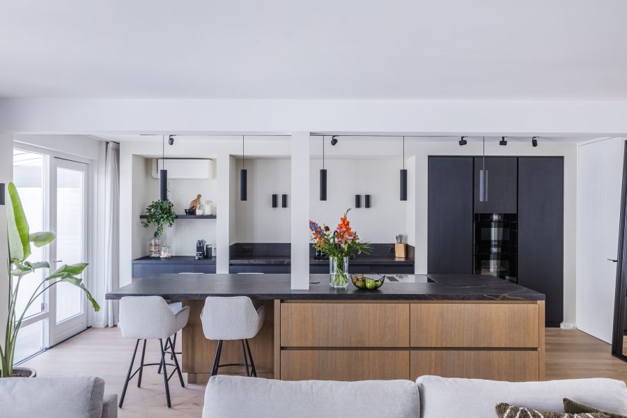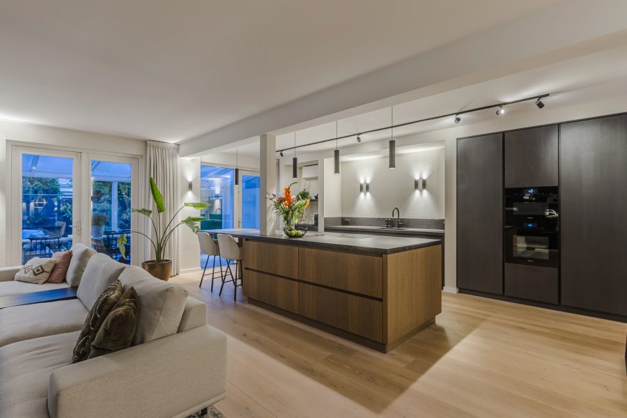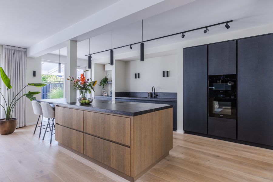 De luxe open keuken (2023) bestaat uit een keukenblok, kastenwand en kookeiland. Het geheel heeft een modern design met zowel houtkleurige als zwarte kasten. De keuken is uitgerust met de volgende hoogwaardige apparatuur: vaatwasser, inductiekookplaat met geïntegreerde afzuiging, ovens, Quooker, koelkast en vriezer. Er is volop kastruimte aanwezig, waaronder diverse lades. Aan de zijkant van de keuken is een airco geplaatst.