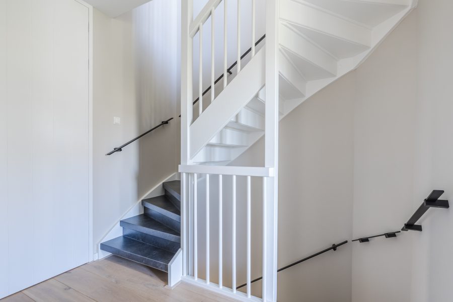 De trap in de entreehal biedt toegang tot de ruime overloop van de eerste verdieping. Hier bevindt zich een grote bergkast. Via deze overloop bereik je de eerste twee slaapkamers, de badkamer en een luxe separaat toiletruimte met zwevend toilet en fontein op twee plekken.