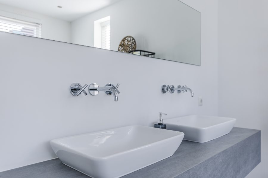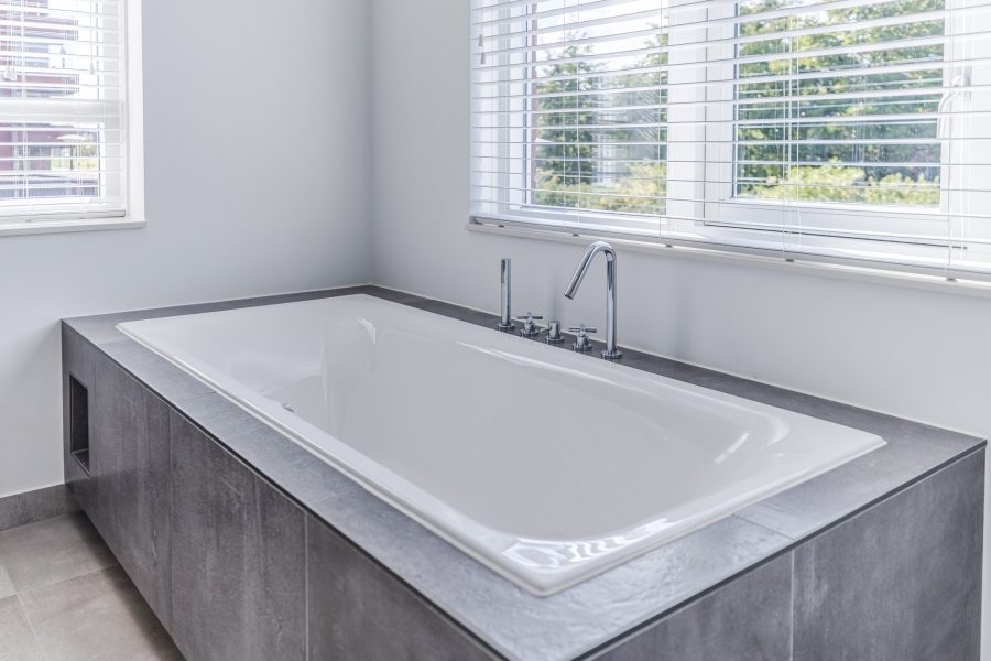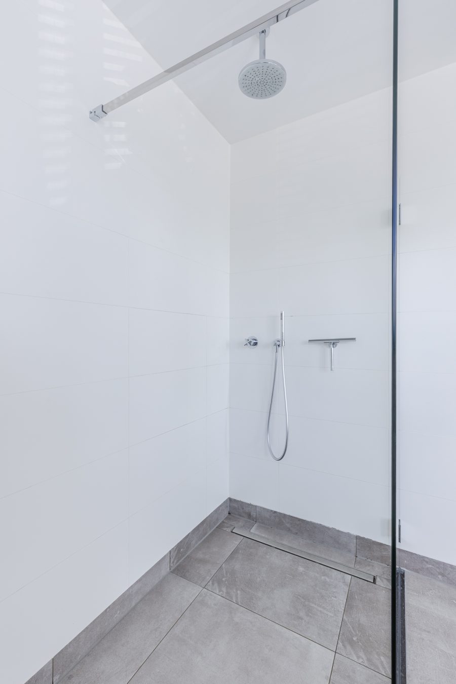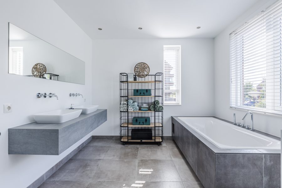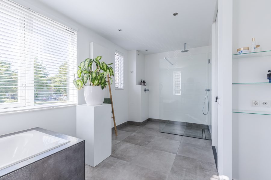 • Zeer ruime en moderne badkamer met dubbele wastafel, ligbad en inloopdouche