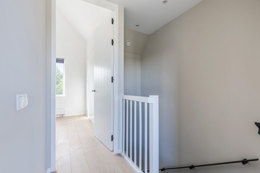 The staircase in the entrance hall provides access to the spacious landing on the first floor. Here you will find a large storage cupboard. This landing leads to the first two bedrooms, the bathroom and a luxurious toilet with a floating toilet and sink.