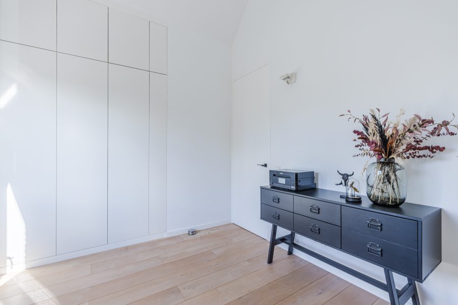 Through the kitchen you can walk into the utility room, where a beautiful wardrobe has been created. The utility room has doors to the front garden.