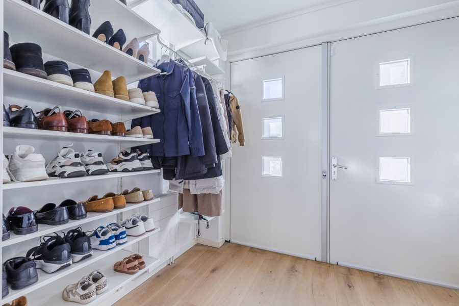 Via de keuken stap je zo de bijkeuken binnen. Hier is een mooie garderobe gecreëerd. De bijkeuken heeft openslaande deuren naar de voortuin.
