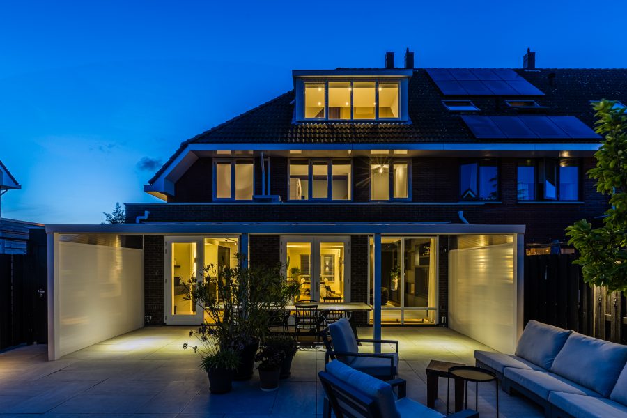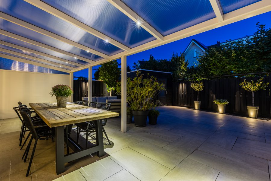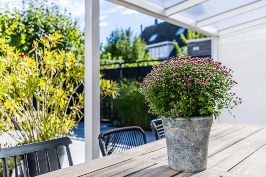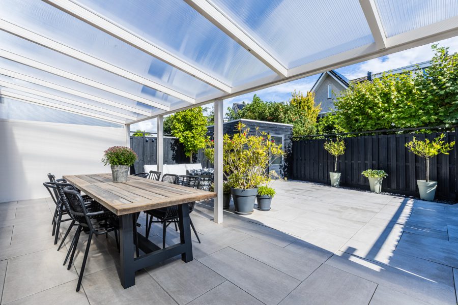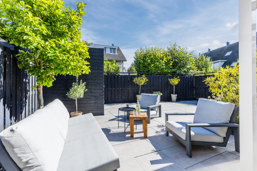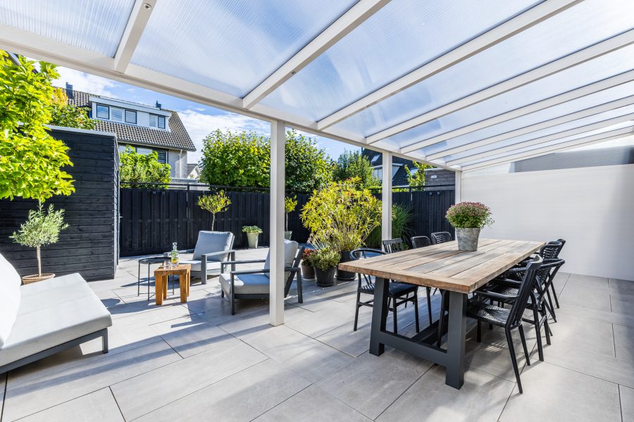 The house has a beautifully landscaped southeast-facing backyard, which was completely renovated in 2019. The garden has a sleek design with stylish tiles. Adjacent to the house is a beautiful canopy, where you can relax. The rest of the garden also offers plenty of space to create a comfortable lounge area.
