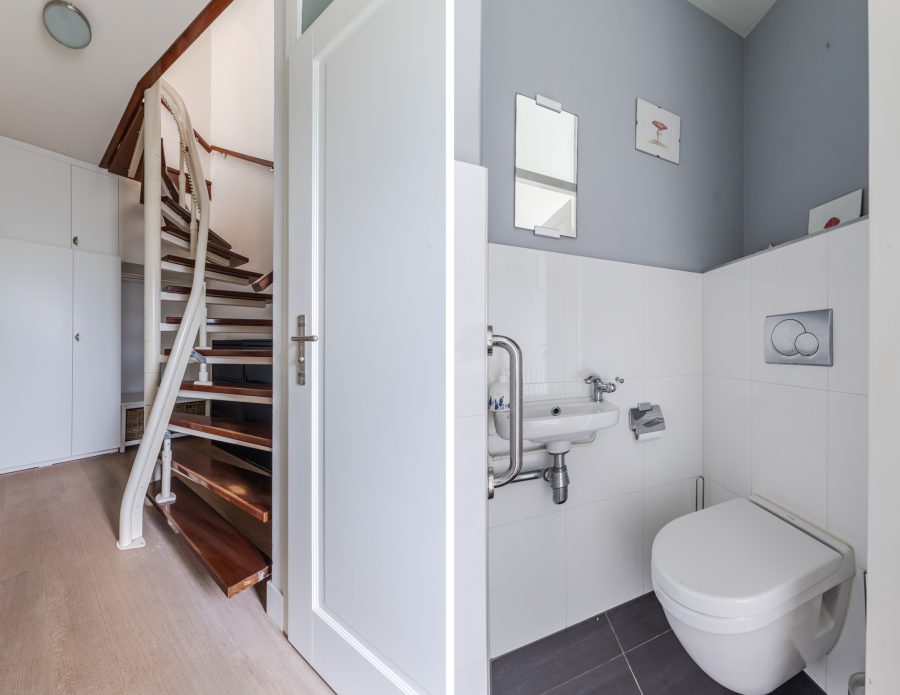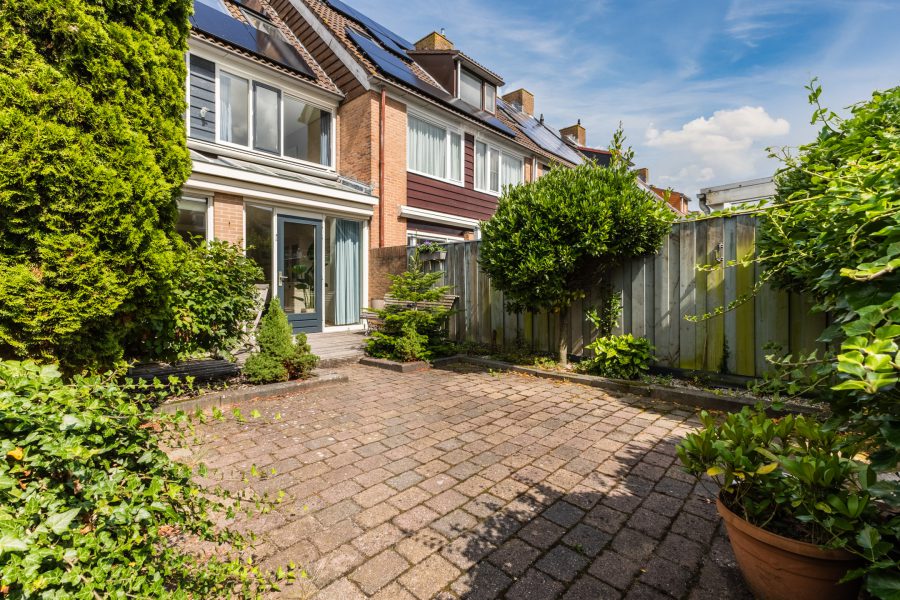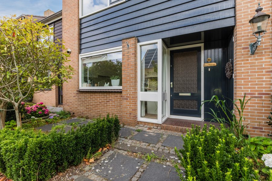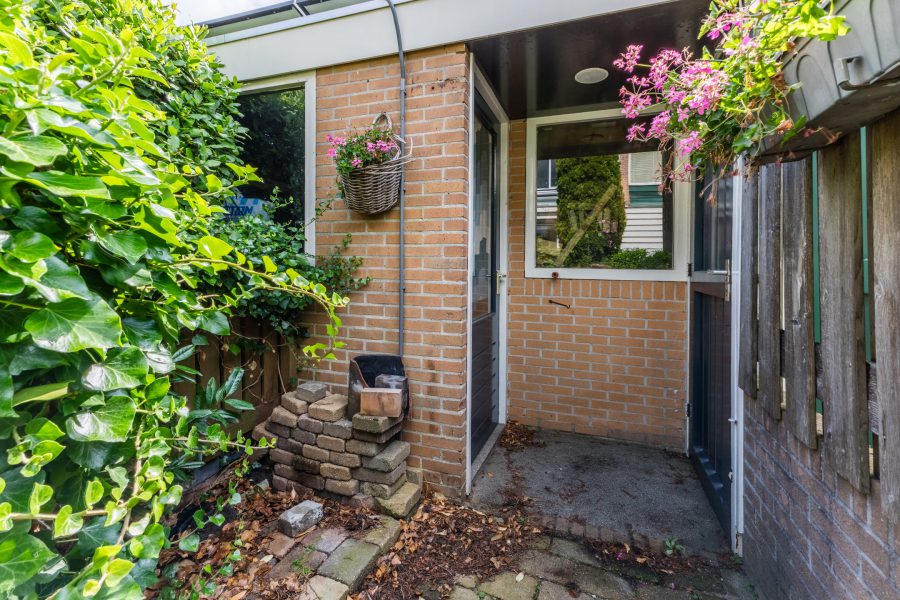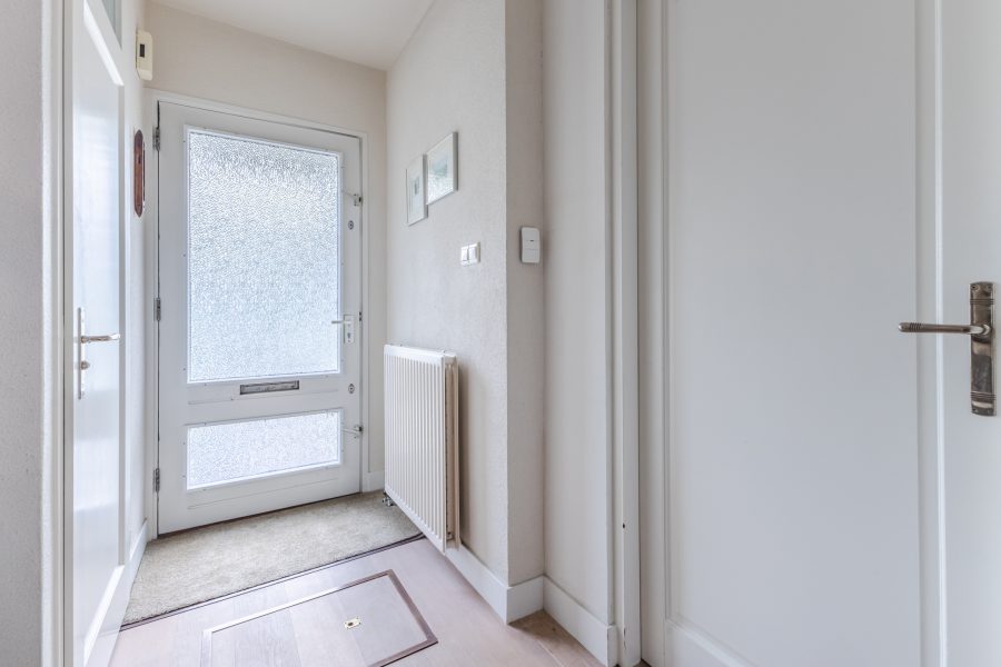 Via de sfeervolle voortuin, die is aangelegd met zowel tegels als beplanting, bereik je de overdekte voordeur van deze charmante tussenwoning. Ook de meterkast bevindt zich hier. Na binnenkomst kom je in een ruime entreehal met een toiletruimte met zwevend toilet en fonteintje, de trap naar de eerste verdieping, een grote bergkast en toegang tot de woonkamer met open keuken.