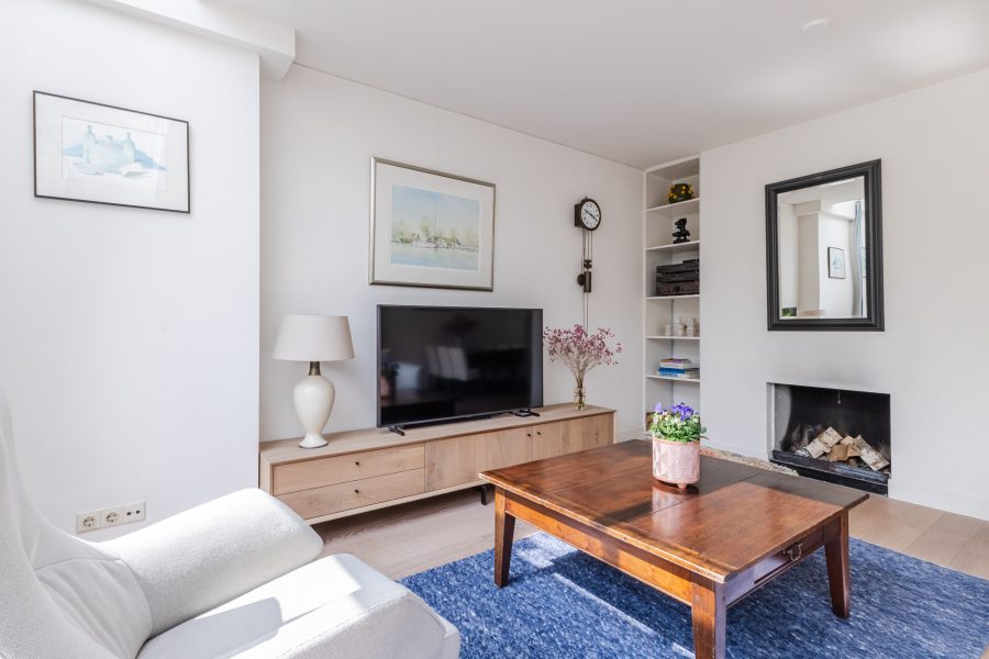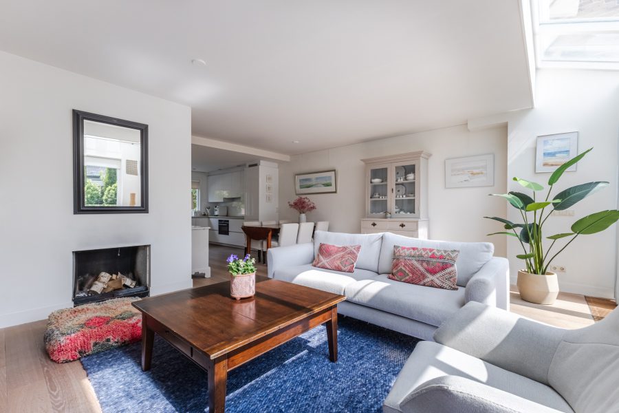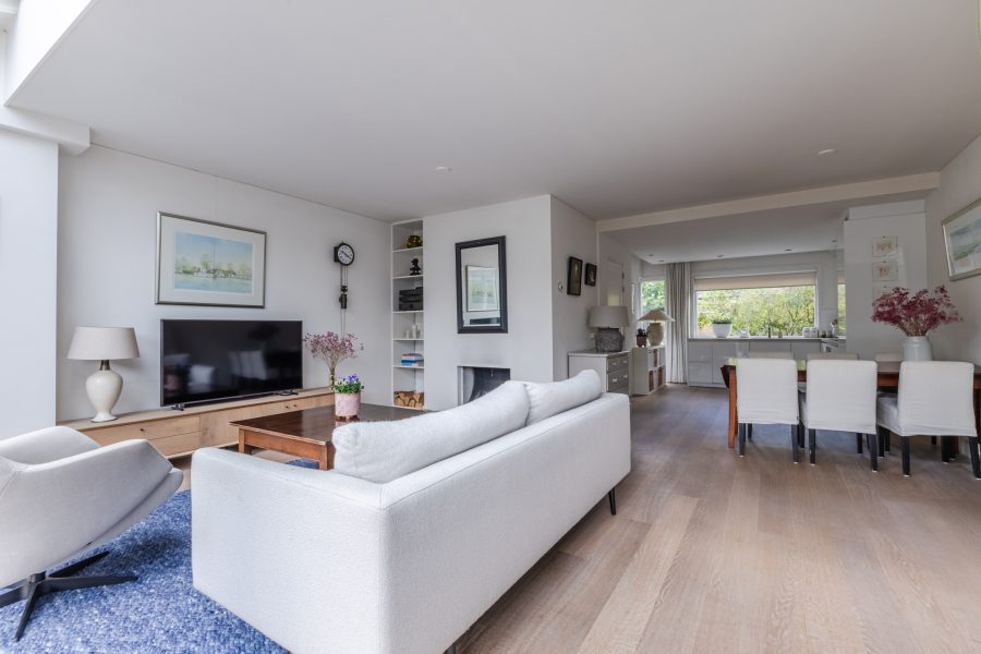 Dankzij de aanbouw aan de achterzijde is de woonkamer zeer ruim opgezet. De woonkamer is voorzien van een nette vloer en strak stucwerk op de wanden. De openhaard maakt deze ruimte extra sfeervol. Dankzij de aanwezigheid van meerdere grote ramen en de lichtstraat in de aanbouw, geniet de woonkamer van veel natuurlijk licht.