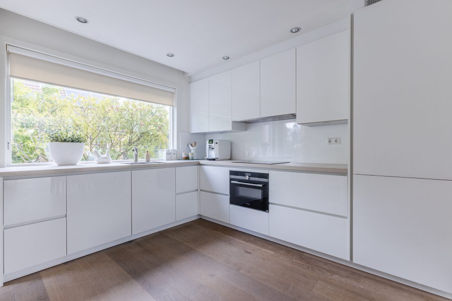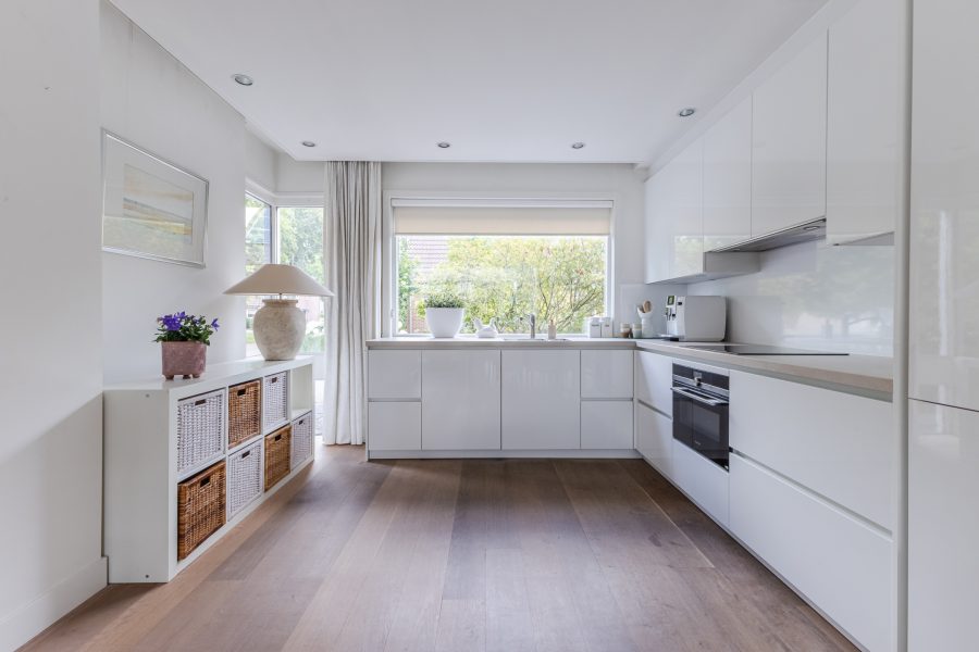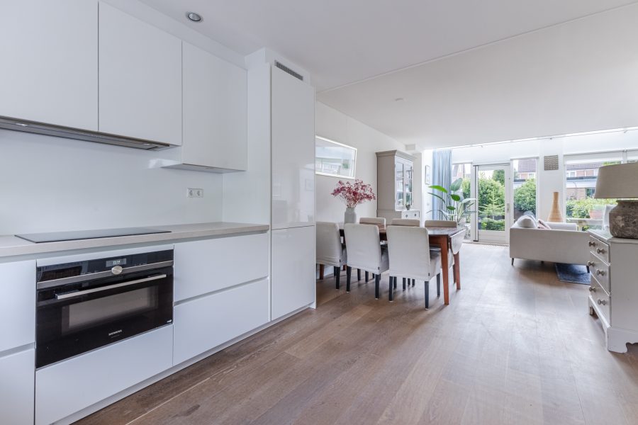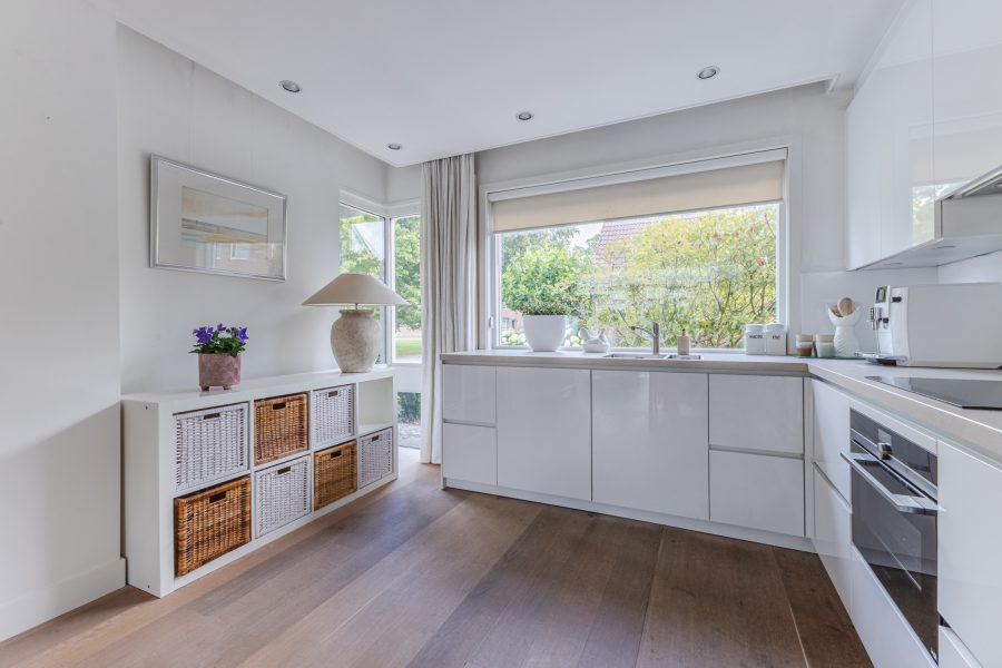 De ruim opgezette, open keuken bevindt zich aan de voorzijde van het huis. Deze is vernieuwd in 2022 en uitgevoerd in een hoekopstelling. Het design is fraai met witte keukenkastjes en een licht werkblad. Moderne apparatuur is er in de vorm van een vaatwasser, inductie kookplaat, afzuigkap, oven, koelkast en vriezer. Er is volop kastruimte aanwezig, waaronder diverse lades. De keuken wordt verlicht met inbouwspots.