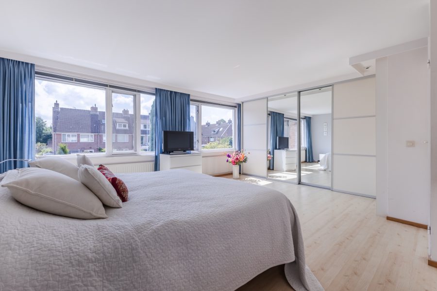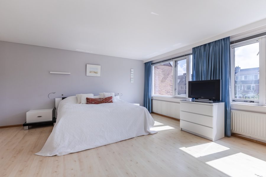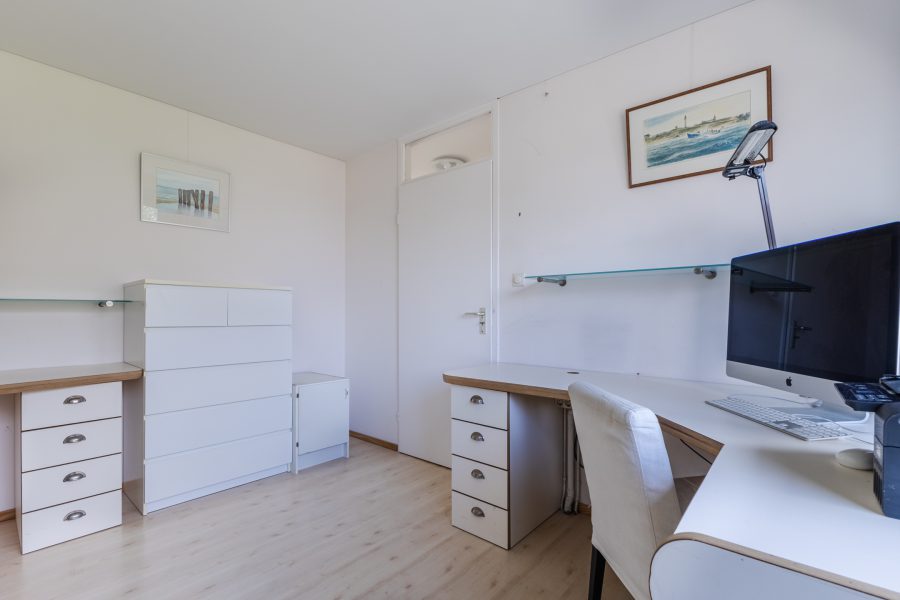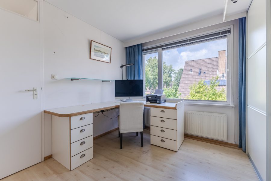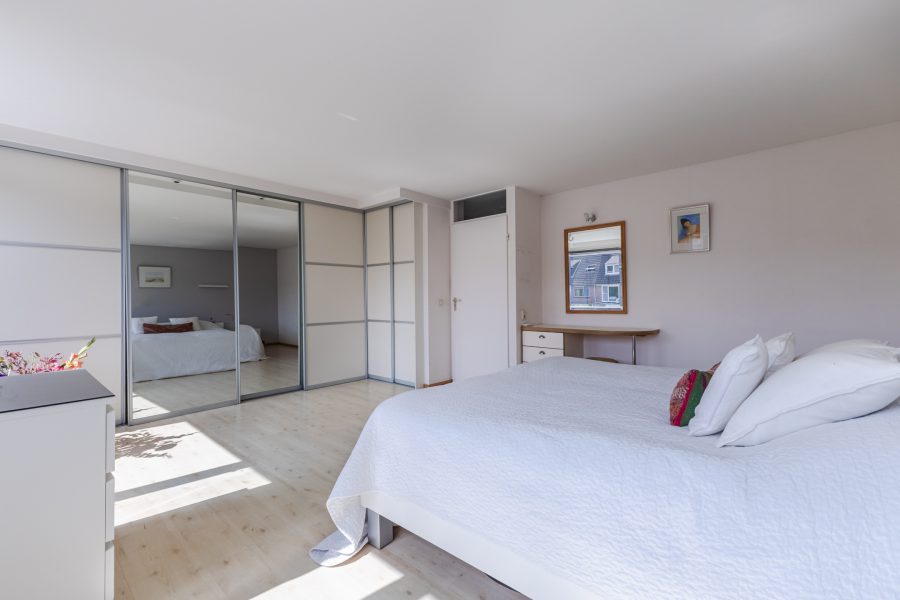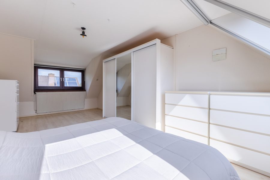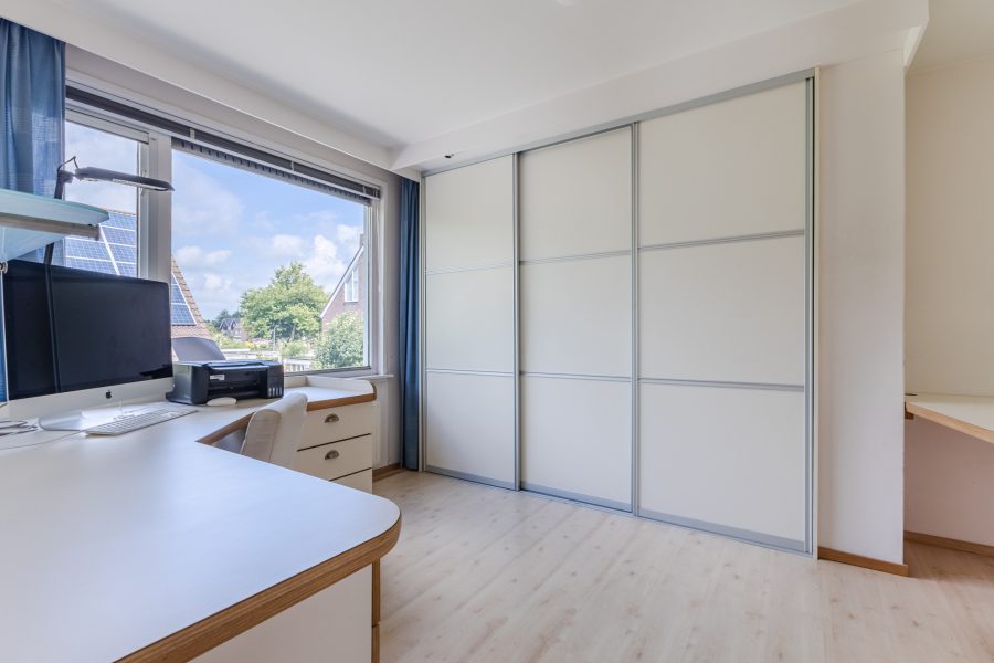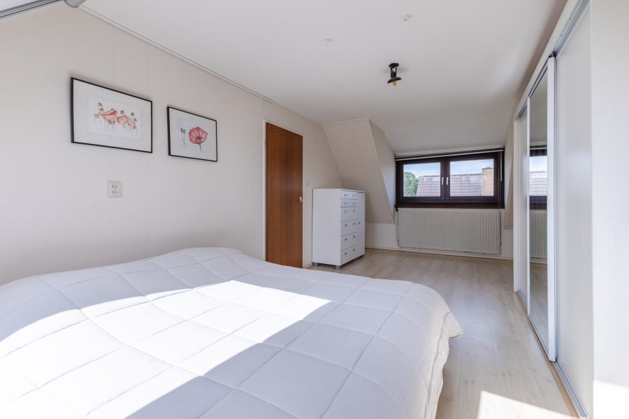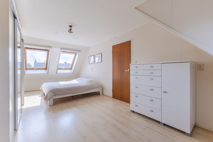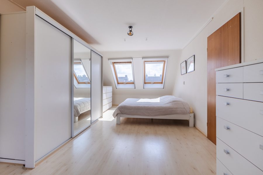 Dankzij de dakkapel aan de voorzijde is de derde slaapkamer heerlijk ruim. De grote raampartij aan de voorzijde en de twee dakramen aan de achterzijde zorgen voor een prettige lichtinval. De slaapkamer is netjes afgewerkt en voorzien van een schuifkast.