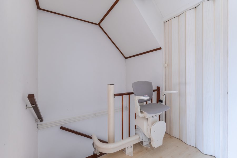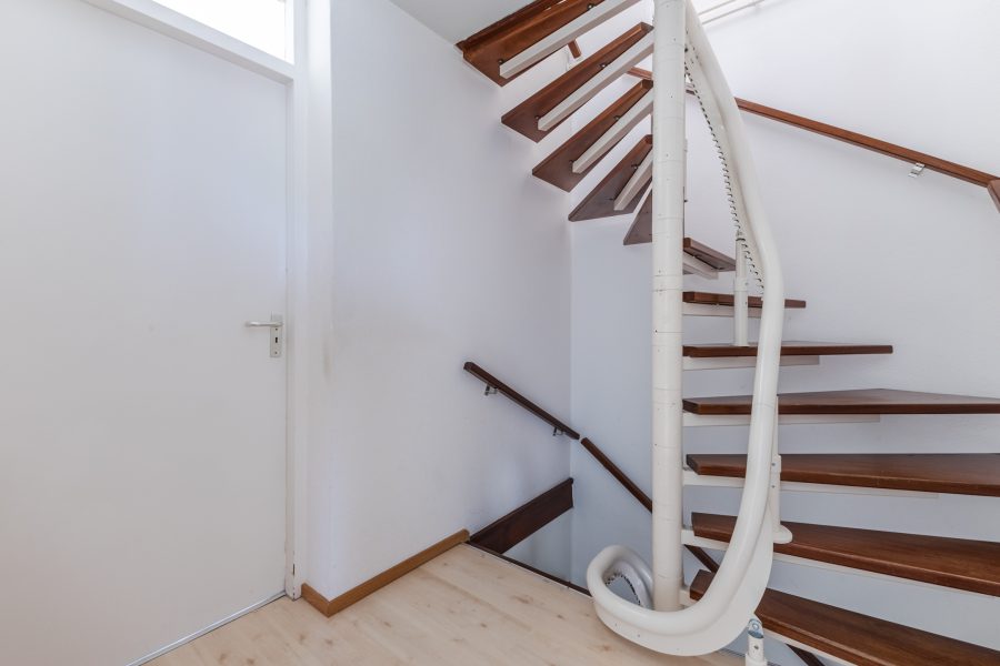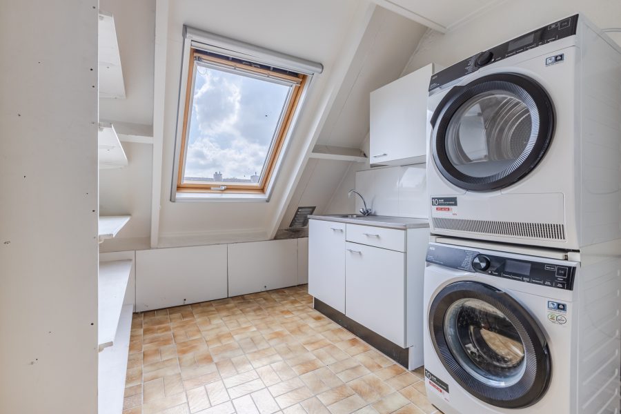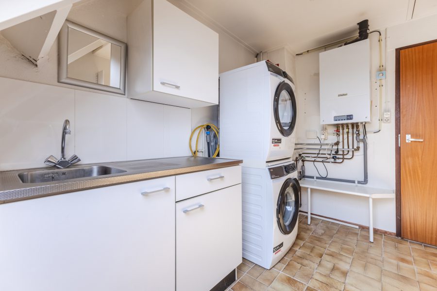 Een vaste trap geeft toegang tot de overloop van deze verdieping. Vanaf hier bereik je een berging, een wasruimte en de derde slaapkamer van het huis. In de wasruimte bevinden zich de aansluitingen voor de wasmachine en de droger. Verder is hier een keukenblok geplaatst en is er genoeg ruimte om spullen op te bergen. In deze kamer vind je daarnaast een vlizotrap naar de bergvliering.