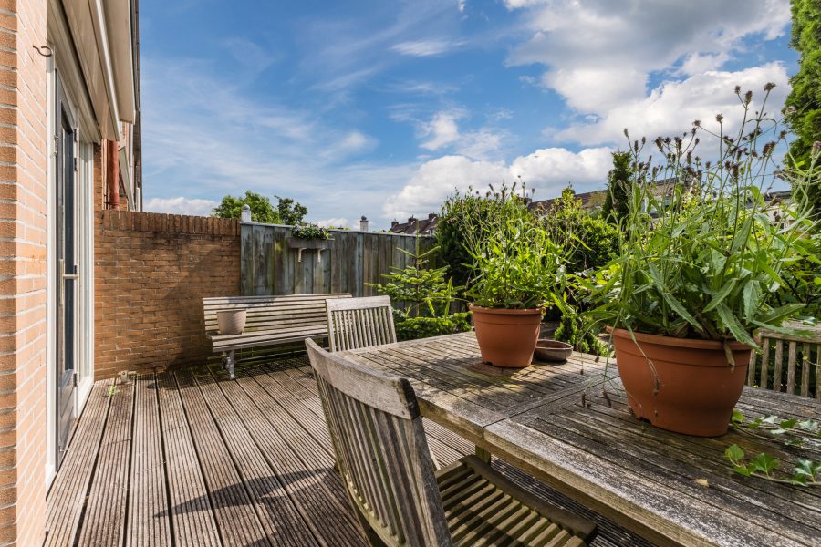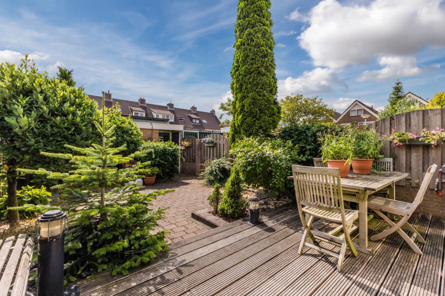 What a wonderful garden! This beautifully landscaped 50 m² backyard combines wooden decking, attractive tiles, and green borders. There’s plenty of space for a cozy lounge area or outdoor dining with friends and family. Positioned southwest, the garden enjoys plenty of sunshine. Privacy is ensured by fences on both sides, creating a sheltered retreat.