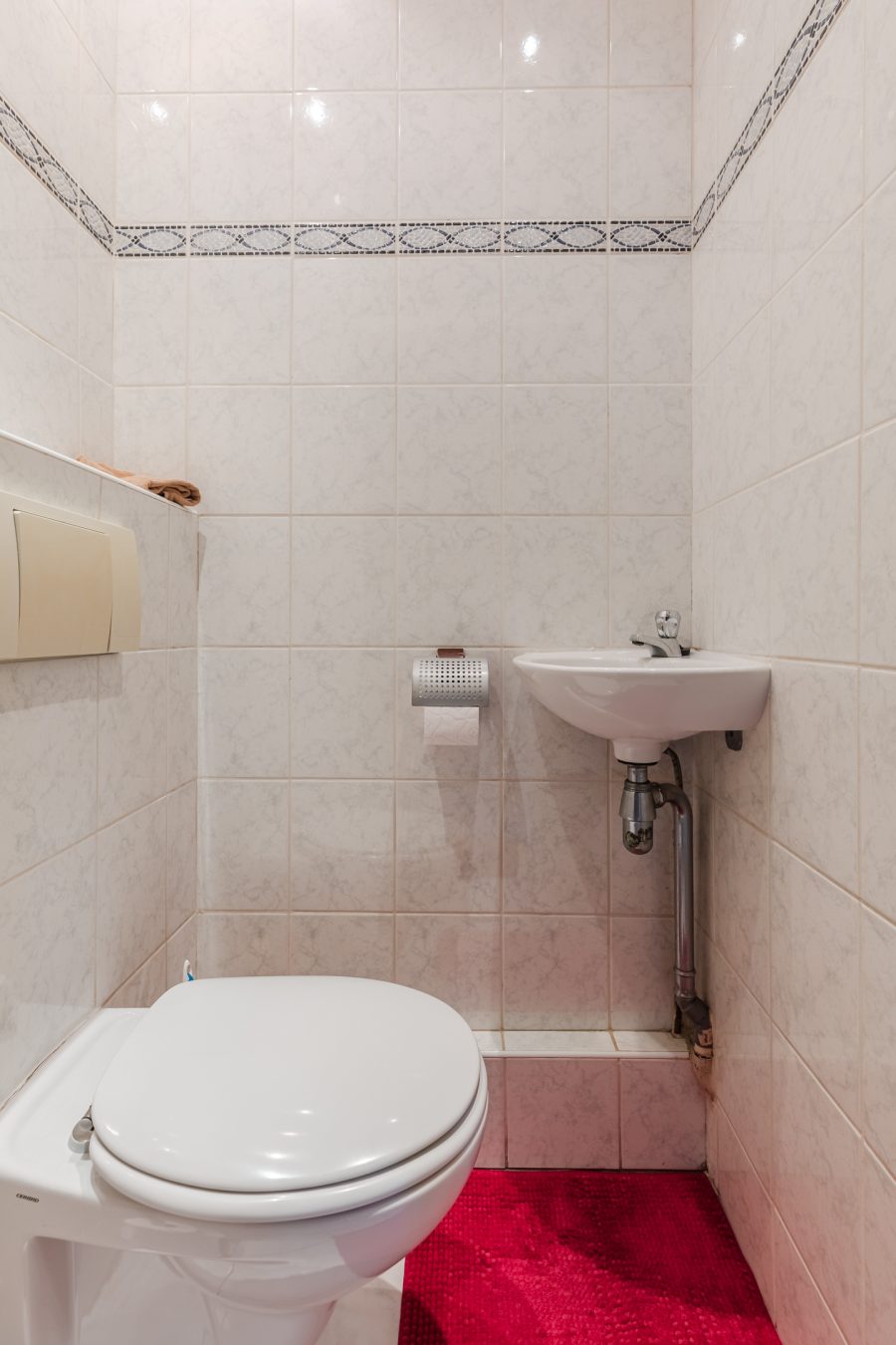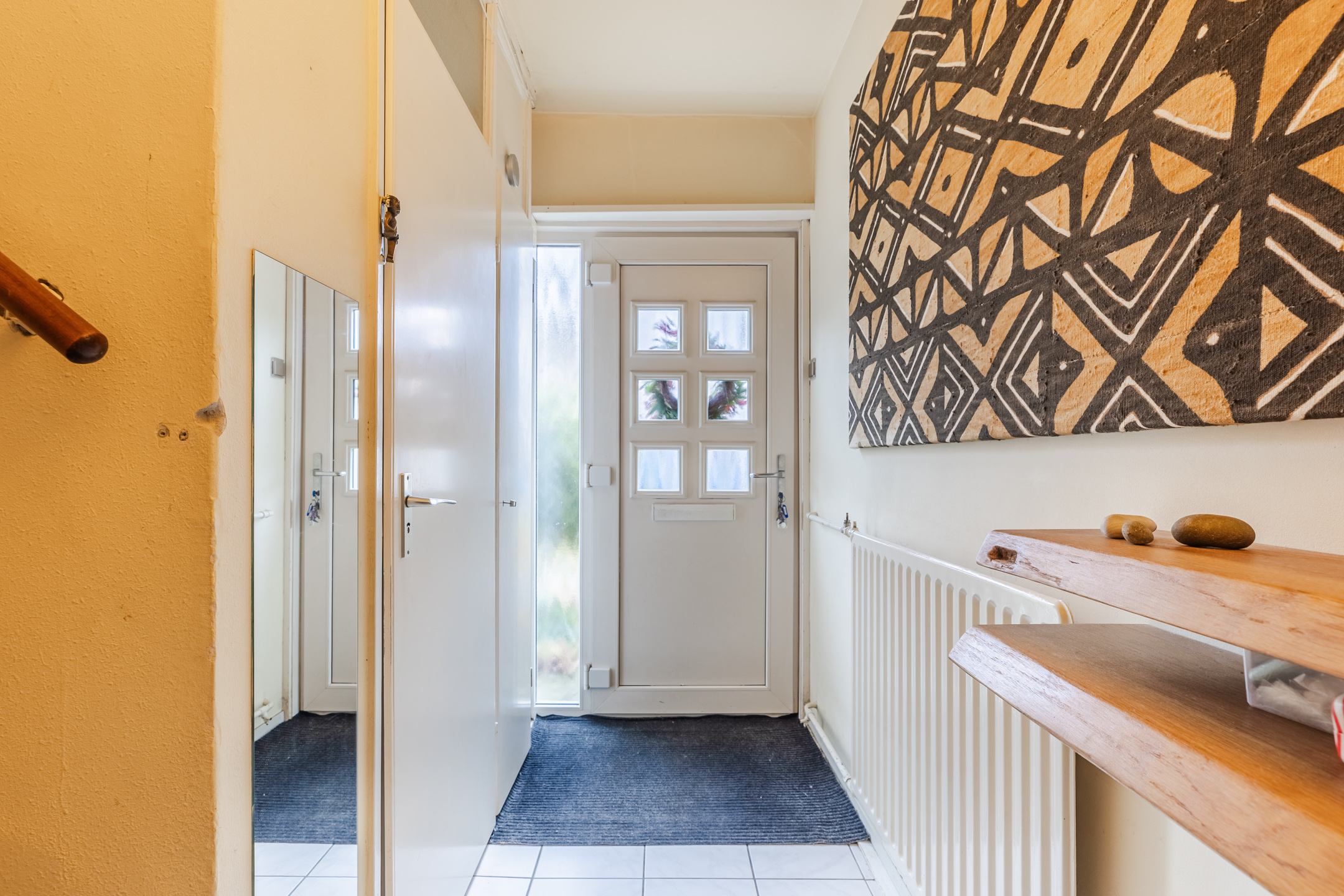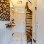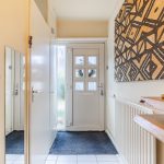 The front door of this terraced house is accessed via the partly green and partly tiled front garden. Behind the front door is a spacious entrance hall with white tiled flooring. From here you have access to a toilet with washbasin, the stairs to the first floor, the kitchen and the living room.