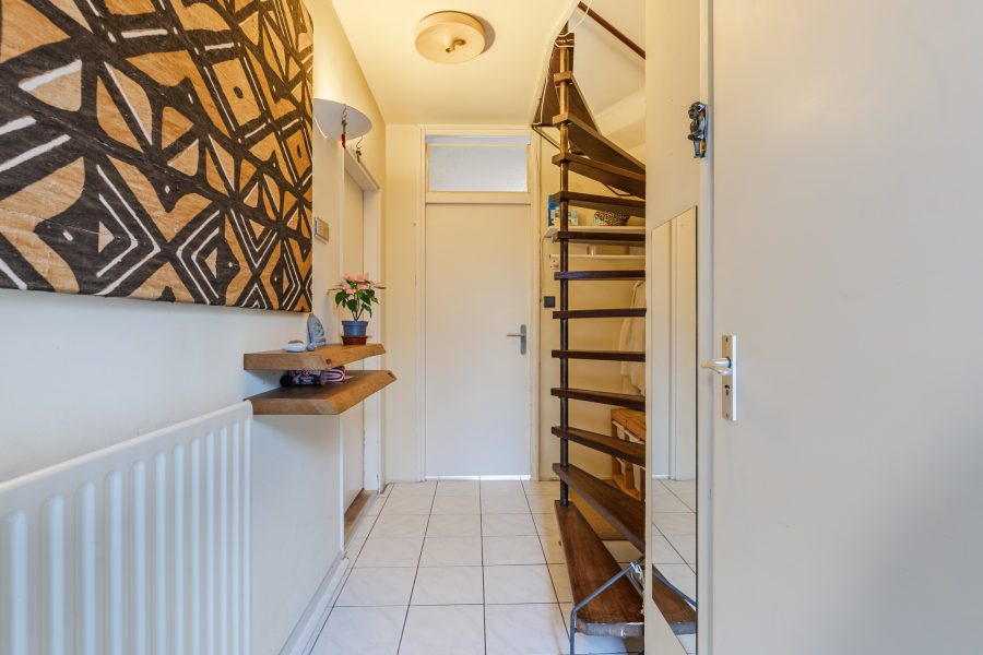Via de deels groene en deels betegelde voortuin bereik je de voordeur van deze tussenwoning. Achter de voordeur bevindt zich een ruime entreehal, die is afgewerkt met een witte tegelvloer. Vanaf hier heb je toegang tot de toiletruimte met toilet en fonteintje, de trap naar de eerste verdieping, de keuken en de woonkamer.