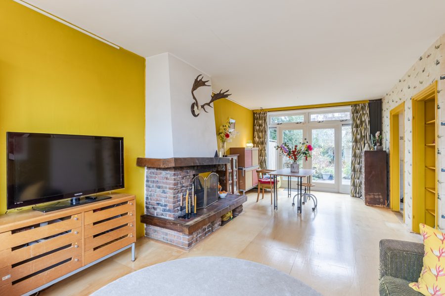 De ruime doorzonwoonkamer is voorzien van een nette vloer en kleurrijke wanden. Centraal in de woonkamer bevindt zich een openhaard. Dankzij de brede raampartij aan de voorzijde en de openslaande tuindeuren aan de achterzijde valt er veel natuurlijk licht naar binnen.