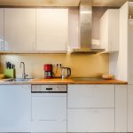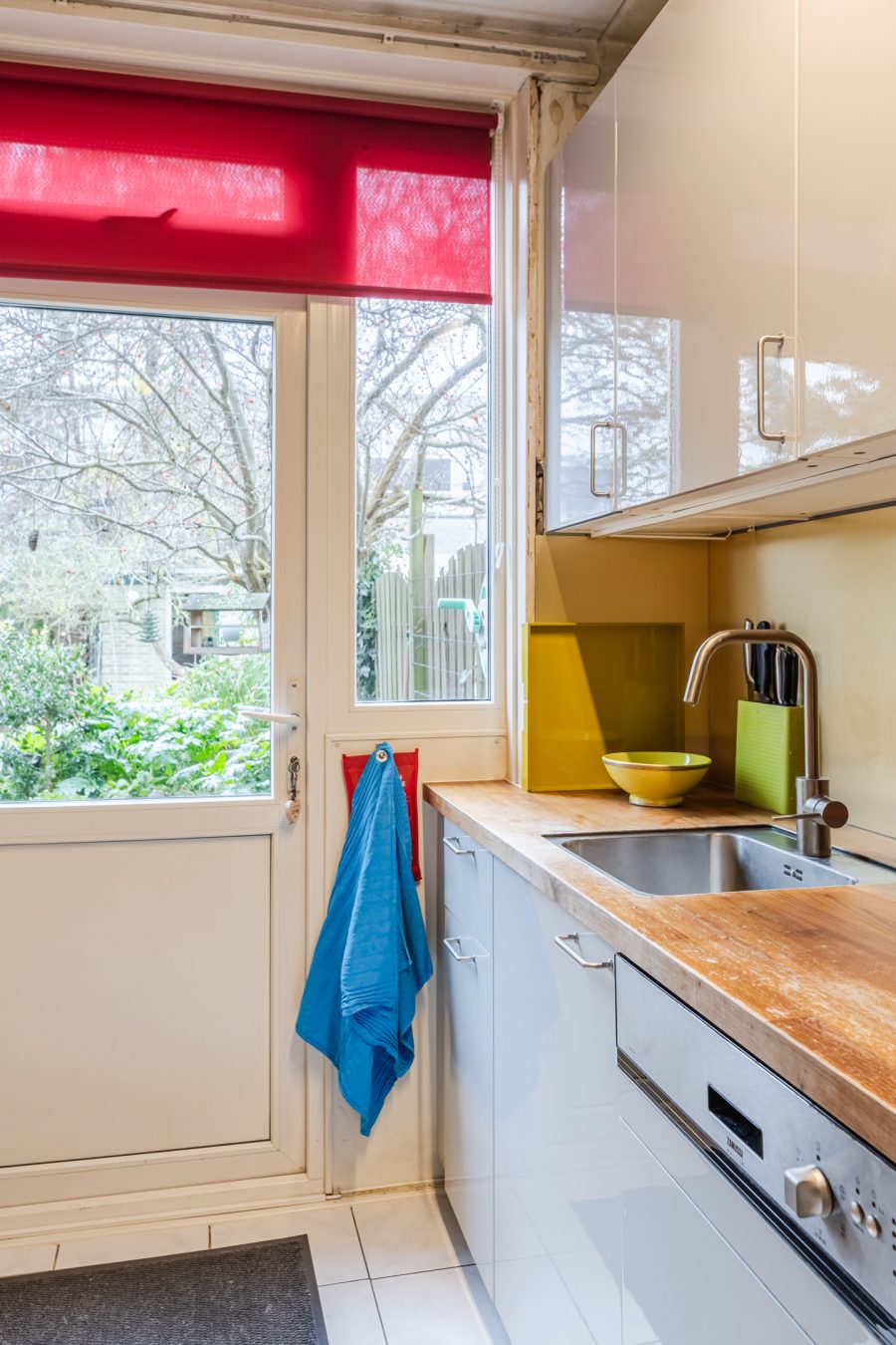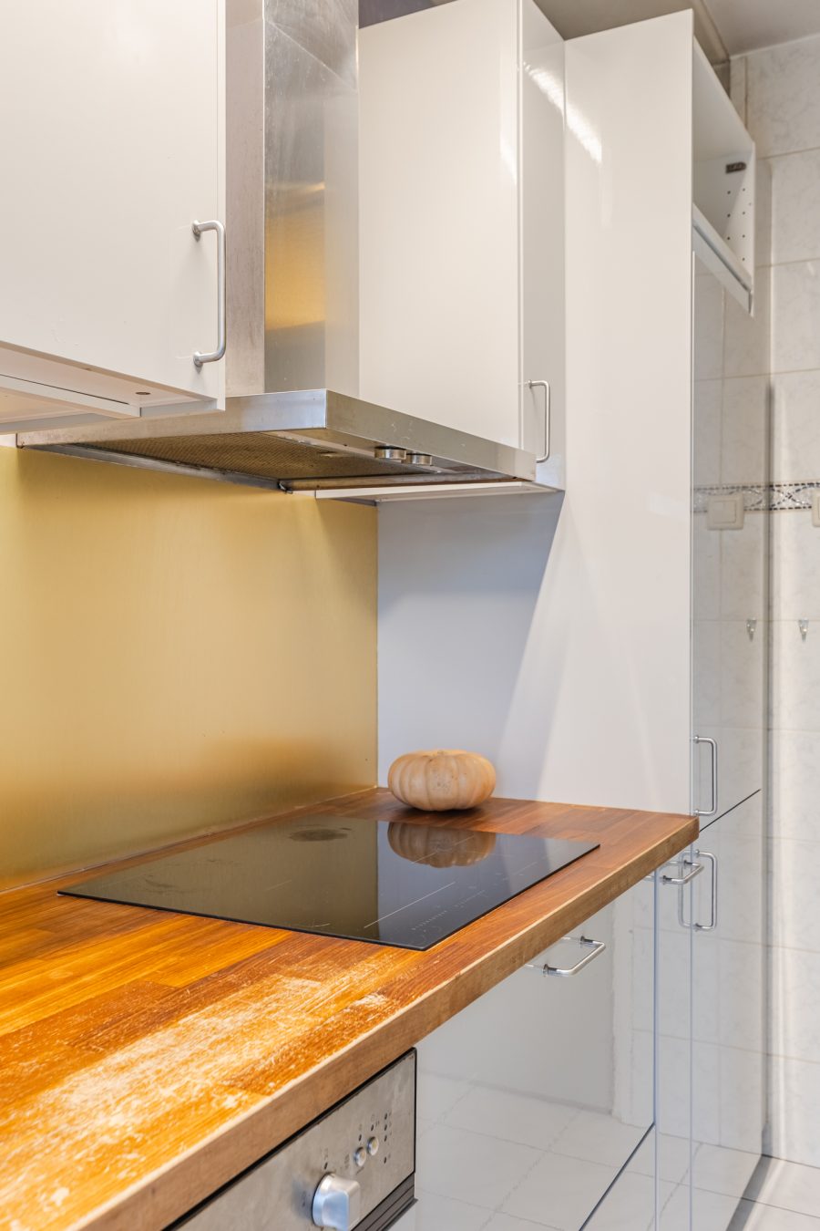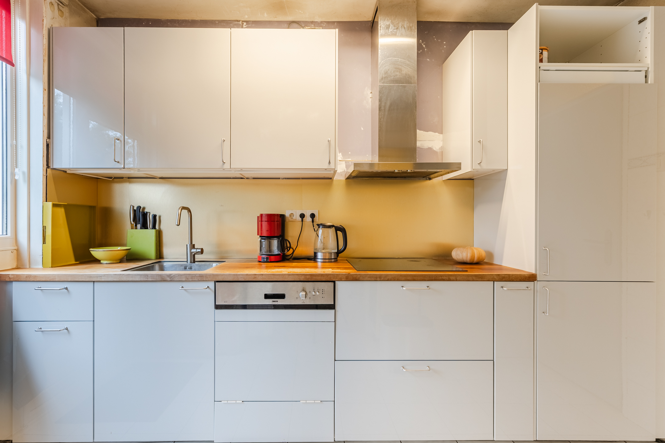 The living room and entrance hall provide access to the kitchen. This kitchen was installed in 2020 and features white kitchen cabinets and a wood-colored worktop. It is equipped with the following appliances: dishwasher, induction stove, extractor hood, refrigerator and freezer. The kitchen has doors to the garden.
