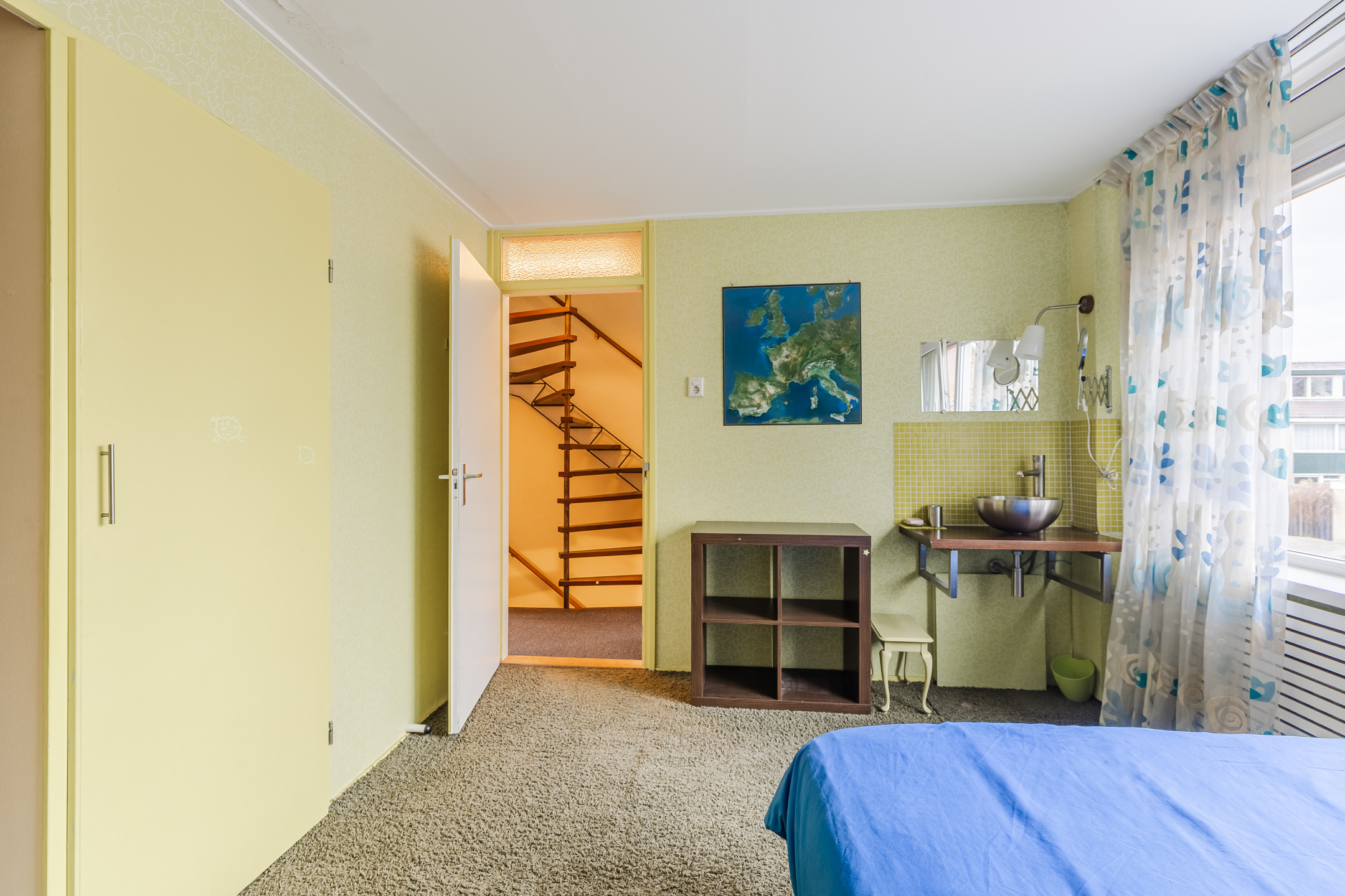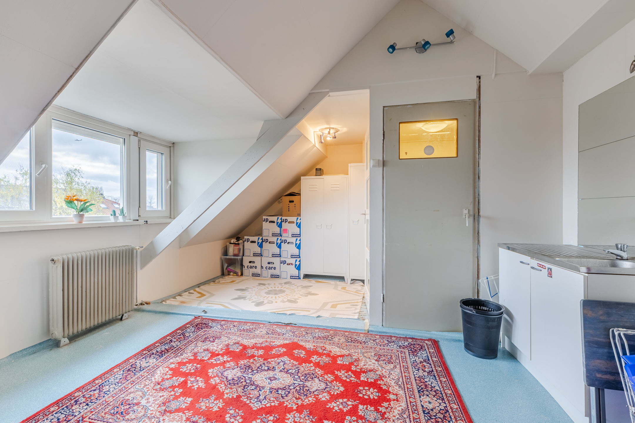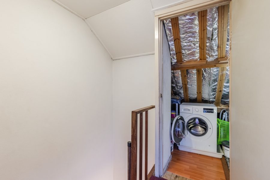 Een vaste trap geeft toegang tot de kleine overloop van deze verdieping. Vanaf hier bereik je een berging en de vierde slaapkamer van het huis. Deze slaapkamer is ruim en licht dankzij de dakkapel aan de achterzijde. In deze kamer bevindt zich een klein keukenblok met wastafel.