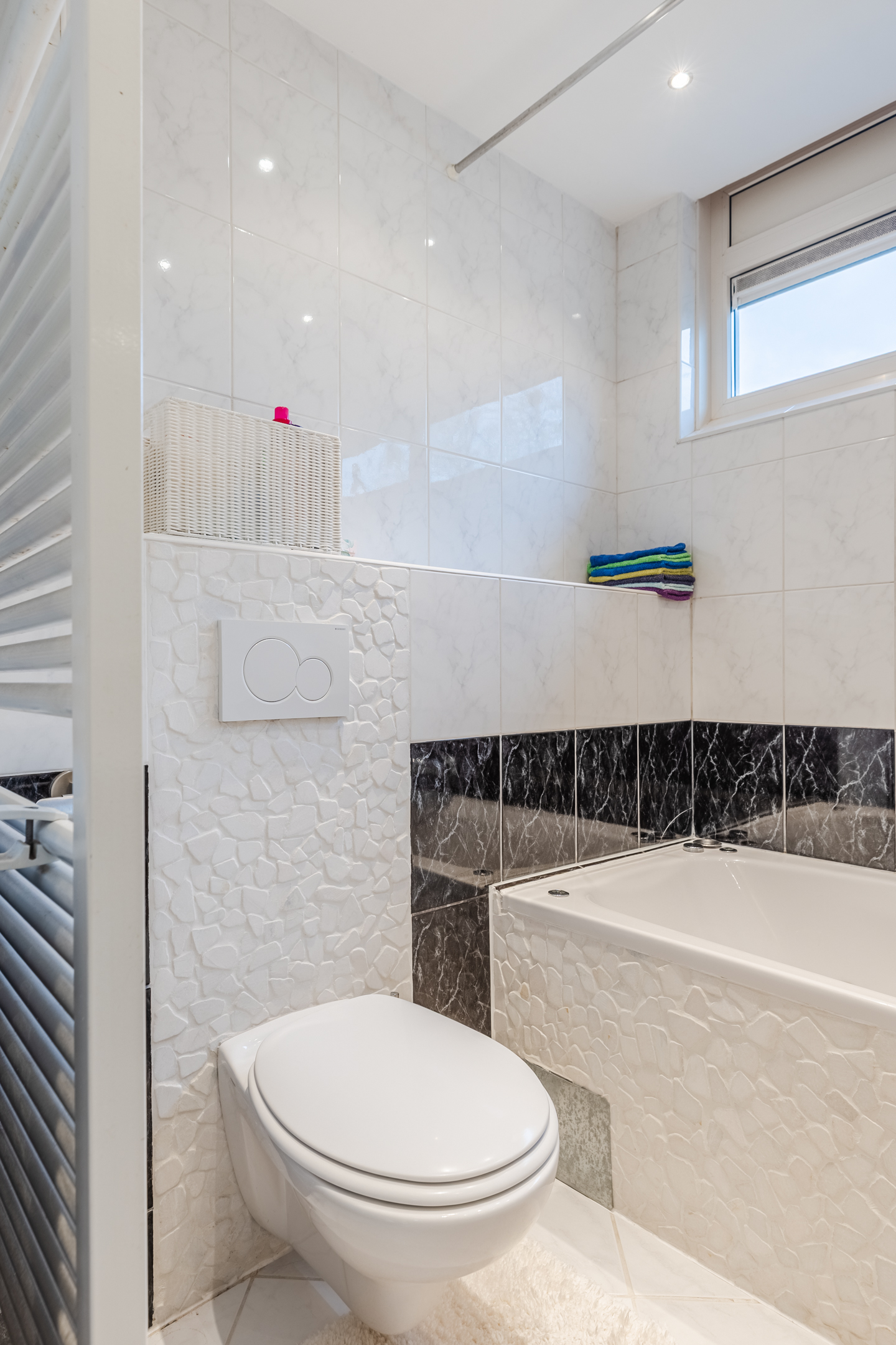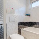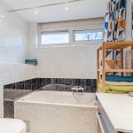 The bathroom is finished with a combination of light and dark tiles. This room is equipped with a floating toilet, vanity unit with sink and a bathtub. The bathroom is lit with recessed spotlights.