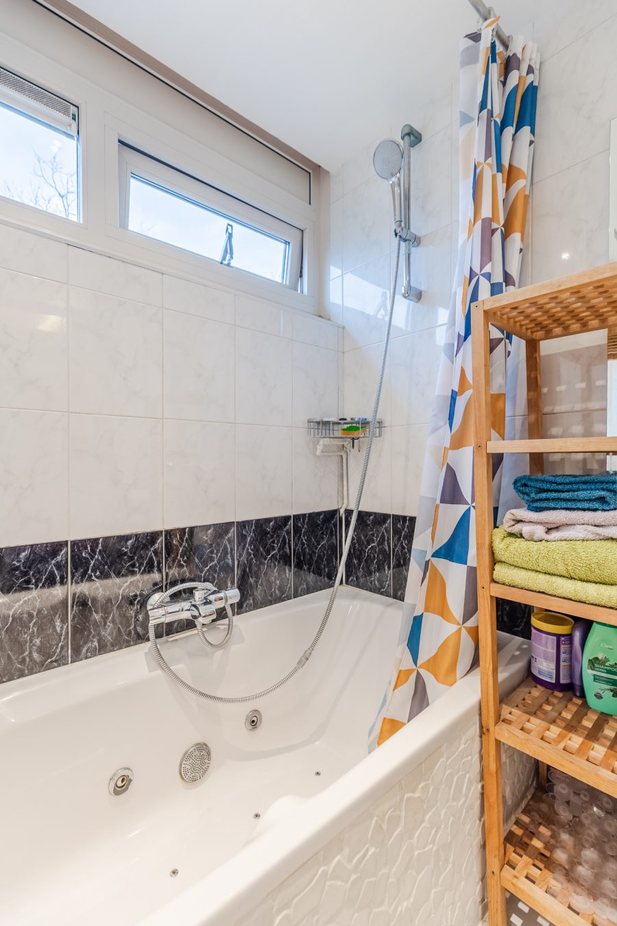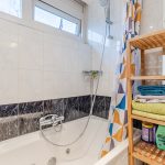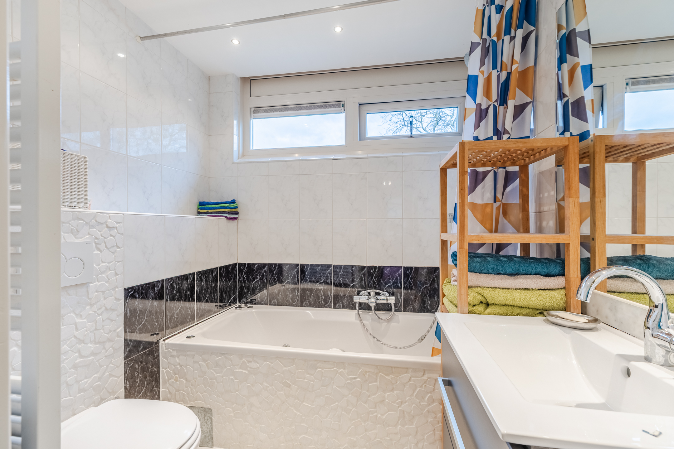 De badkamer is afgewerkt met een combinatie van lichte en donkere tegels. Deze ruimte is uitgerust met een zwevend toilet, badmeubel met wastafel en een ligbad. De badkamer wordt verlicht met inbouwspots.