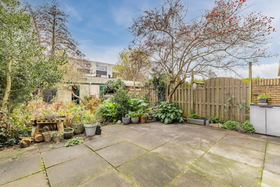 Het huis beschikt over een royale, diepe achtertuin op het zuidwesten. Deze is sfeervol ingericht met een combinatie van tegels en beplanting. Er is ook een vijver aanwezig. Aan het huis grenst een betegeld terras waar je een heerlijke loungeplek kunt inrichten. Dankzij de gunstige ligging profiteer je hier van veel zonuren. De tuin is aan beide kanten beschut met schuttingen, waardoor je in alle rust van het zonnetje kunt genieten.