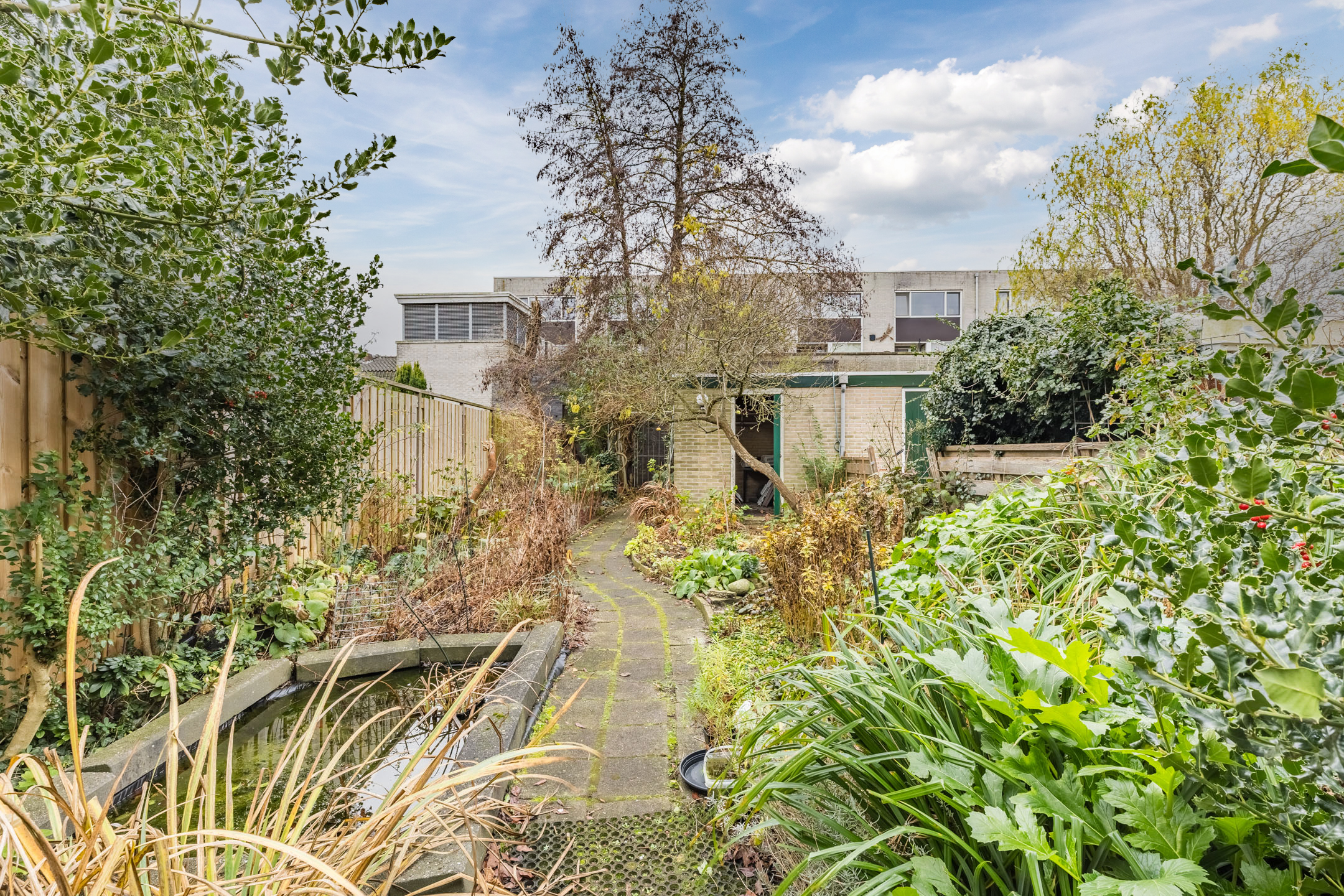 The house has a spacious, deep backyard facing southwest. It is attractively landscaped with a combination of tiles and plants. There is also a pond. Adjacent to the house is a tiled terrace where you can create a lovely lounge area. Thanks to its favorable location, you can enjoy many hours of sunshine here. The garden is sheltered on both sides by fences, allowing you to enjoy the sun in peace.