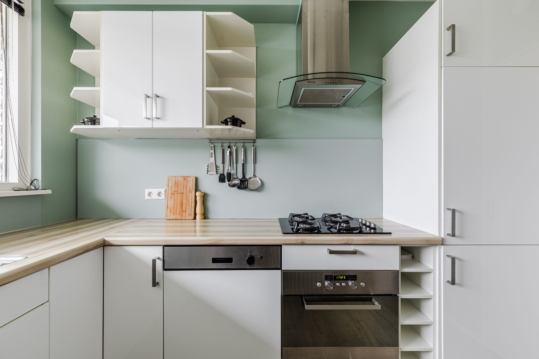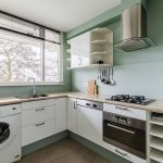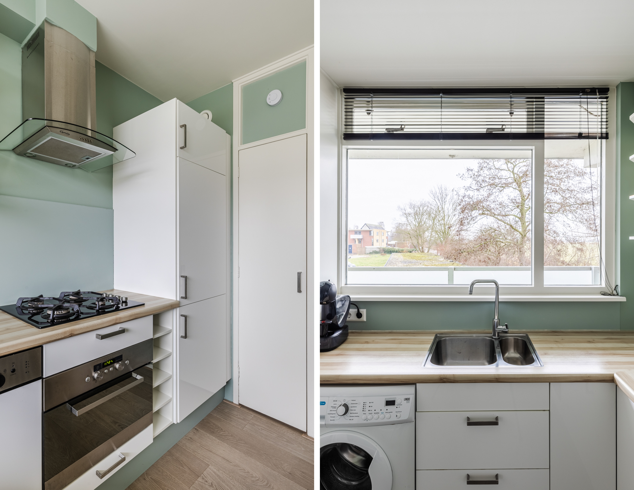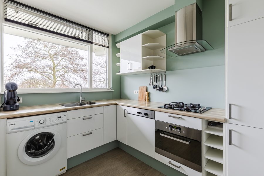 Upon entering, the kitchen is almost immediately accessible. The kitchen (2011) has a corner layout and a beautiful design with white cabinets, a wood-colored countertop and a green backsplash. Here you will find the following appliances: dishwasher, gas stove, range hood, oven, refrigerator and freezer. The washing machine connection is also located here. The large window provides pleasant daylight while cooking.