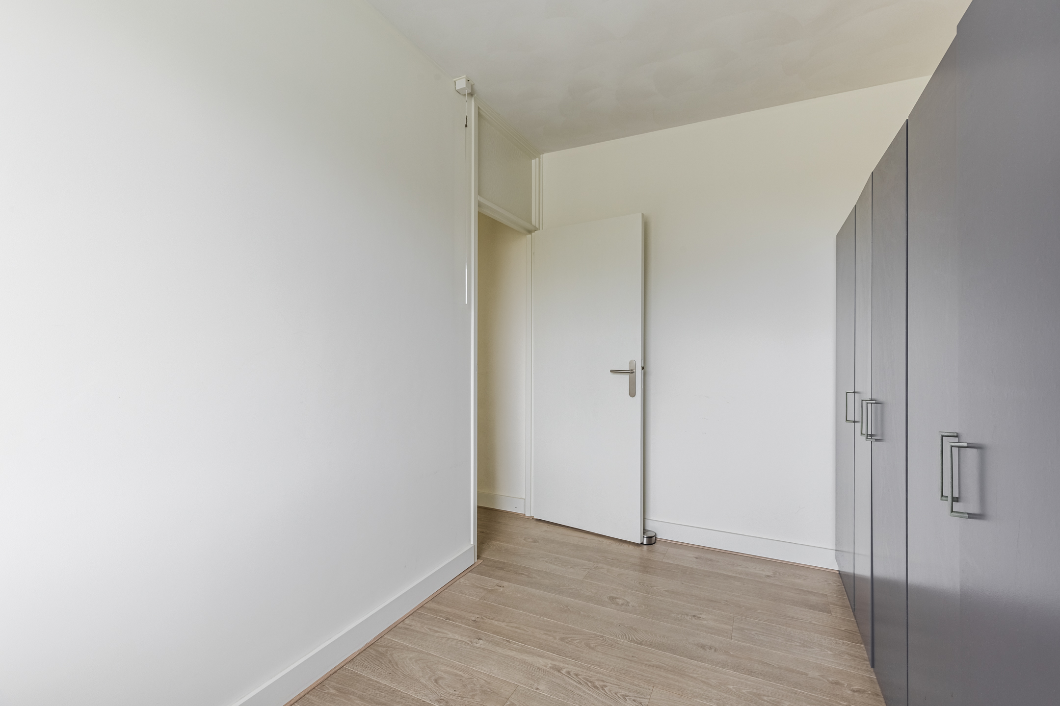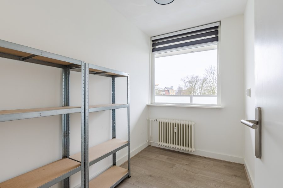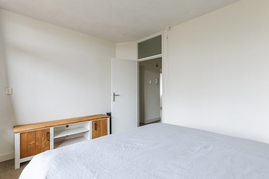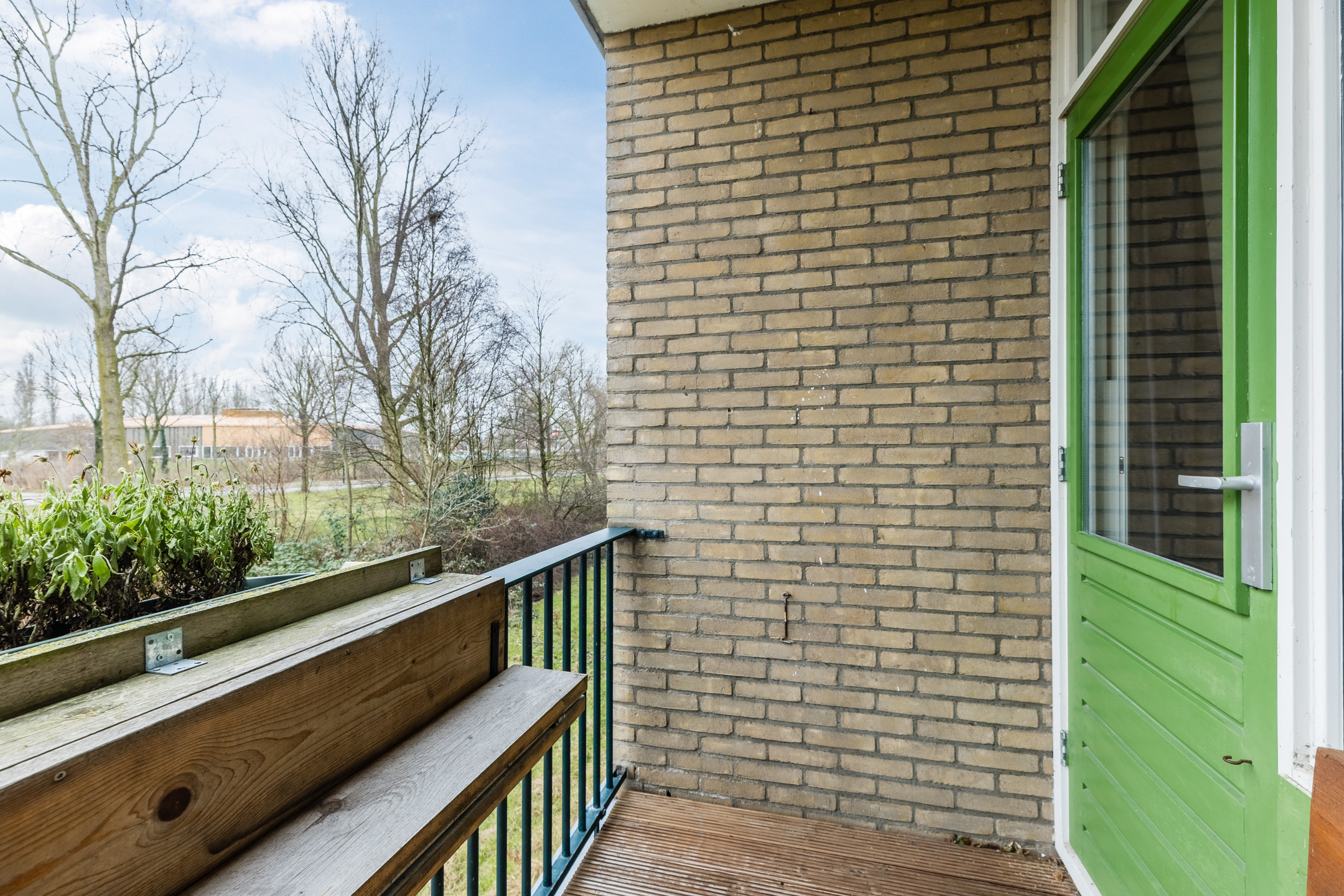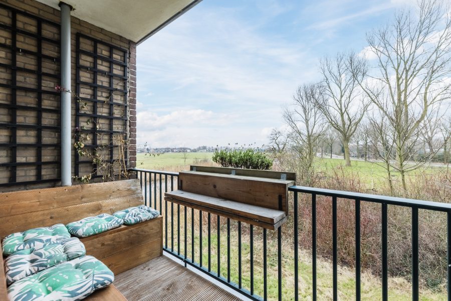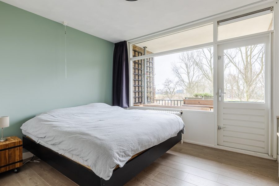 De kamer aan de achterzijde geeft toegang tot het zonnige balkon. Het balkon is voorzien van houten vlonderplanken en biedt ruimte voor een gezellig zitje. Hier geniet je van ochtend- en middagzon en veel privacy. Daarnaast biedt het balkon mooi vrij uitzicht over het groen.